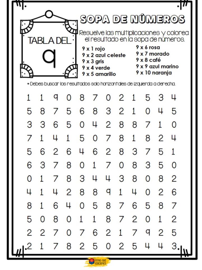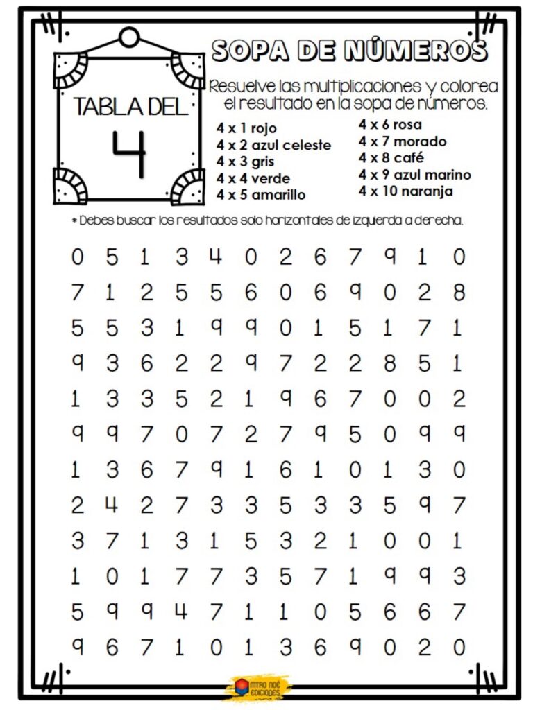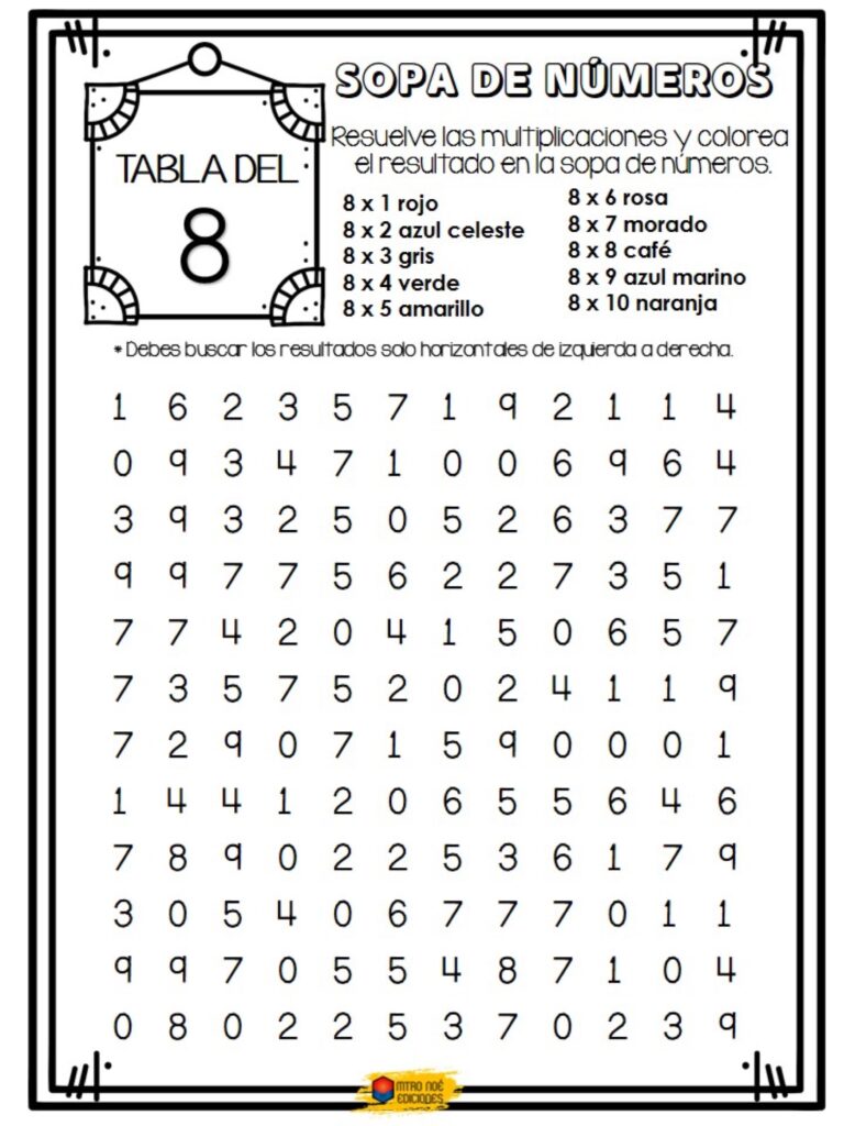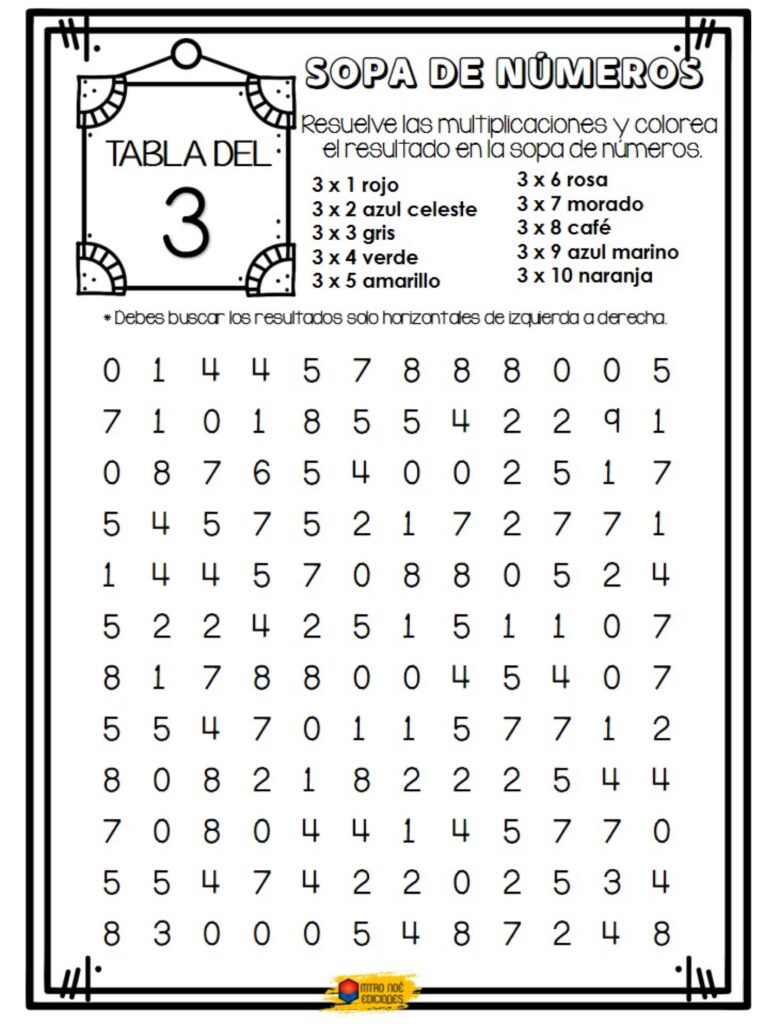 Resuelve las multiplicaciones y colorea el resultado en la sopa de letras de cada lámina. ADVERTENCIA: Lo resultados de esta sopa de números para trabajar tablas de multiplicar están solo en horizontal.