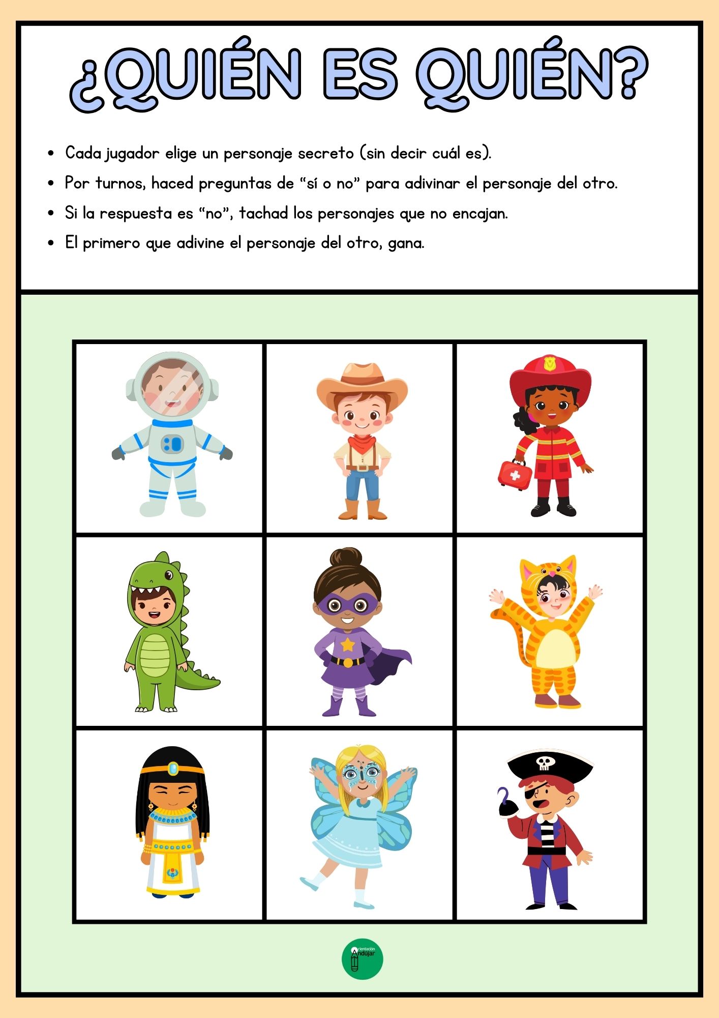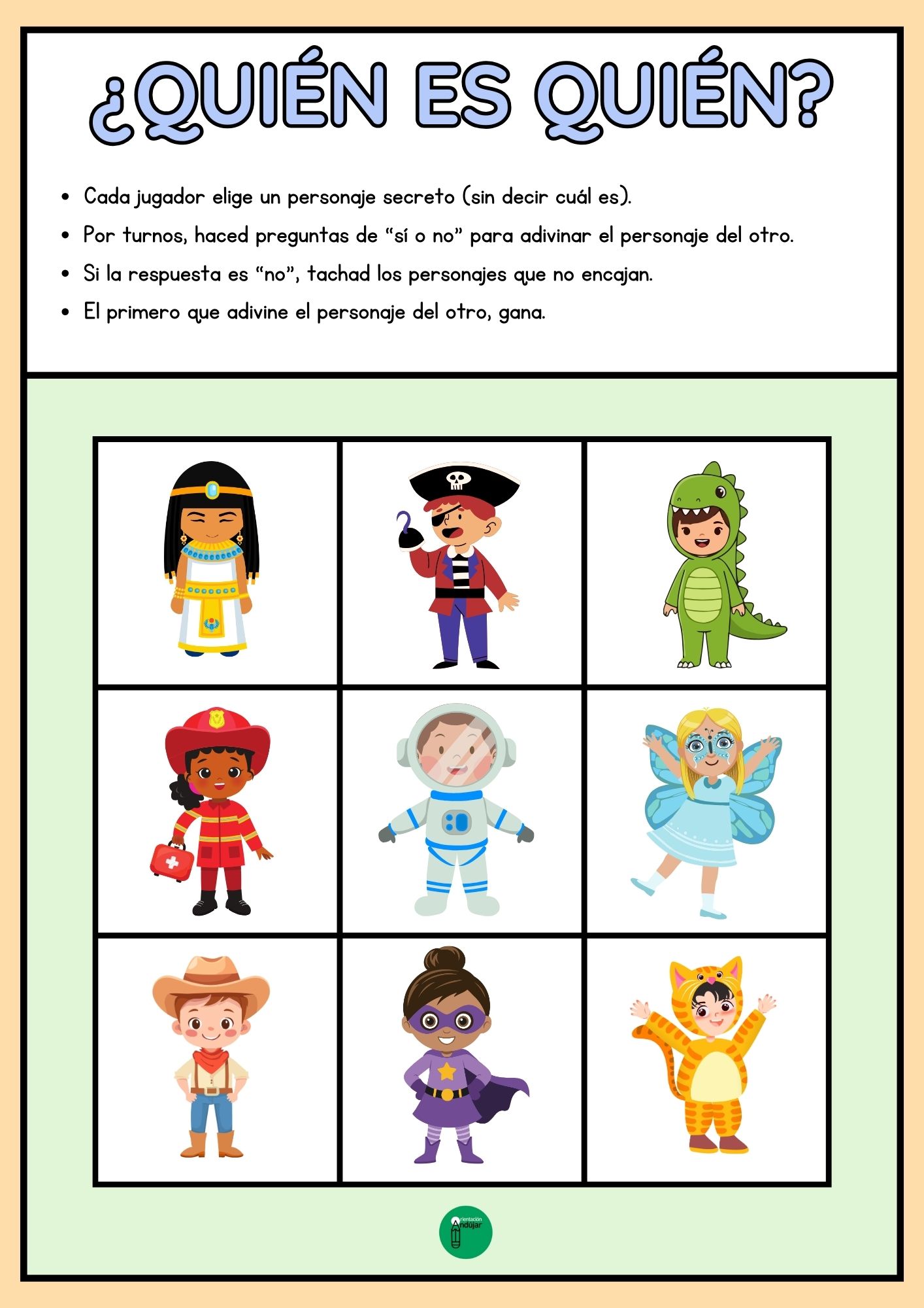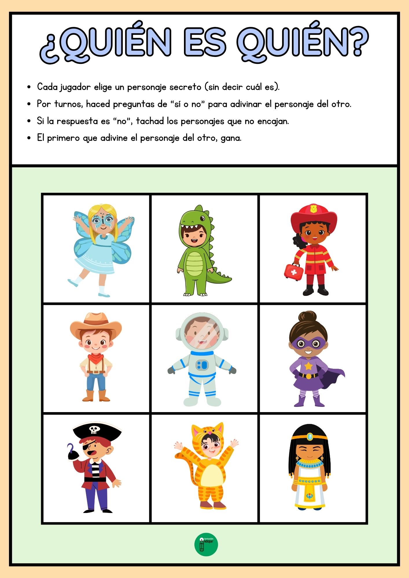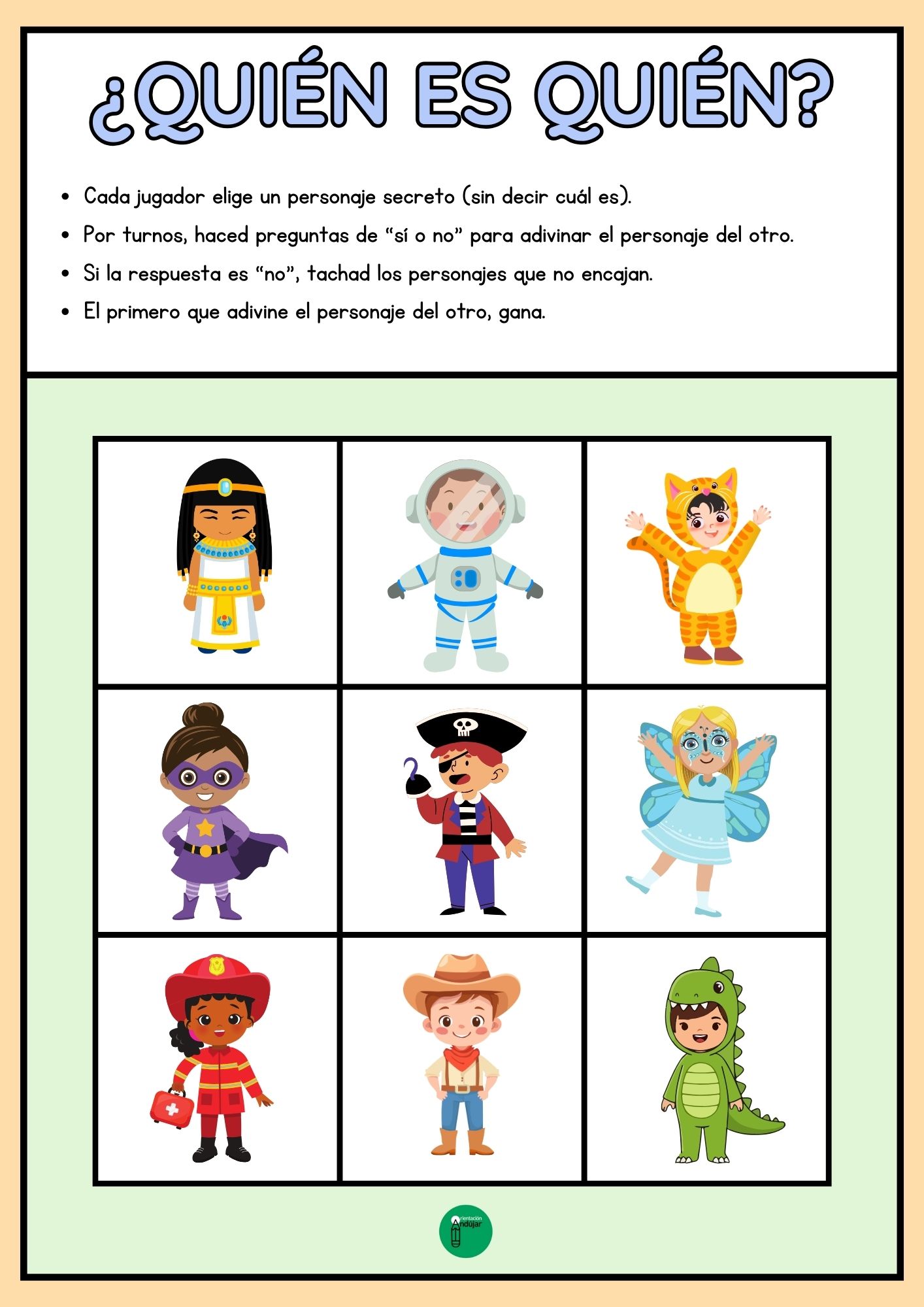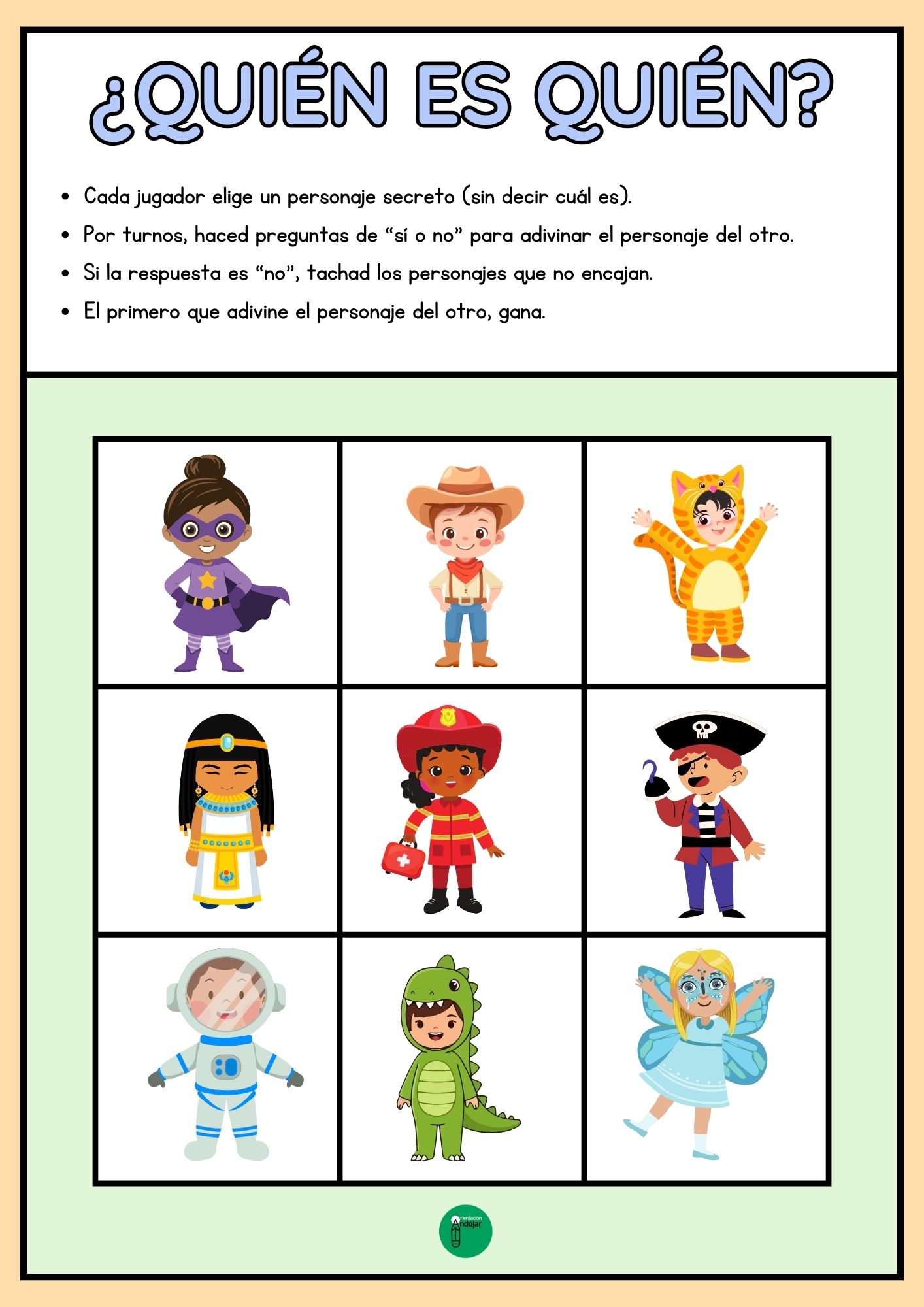Cada tablero incluye niños con disfraces de carnaval variados, desde superhéroes hasta animales. Los alumnos deberán hacer preguntas estratégicas y observar con detalle los disfraces para adivinar quién es quién, ¡como en el juego clásico pero con un toque festivo!