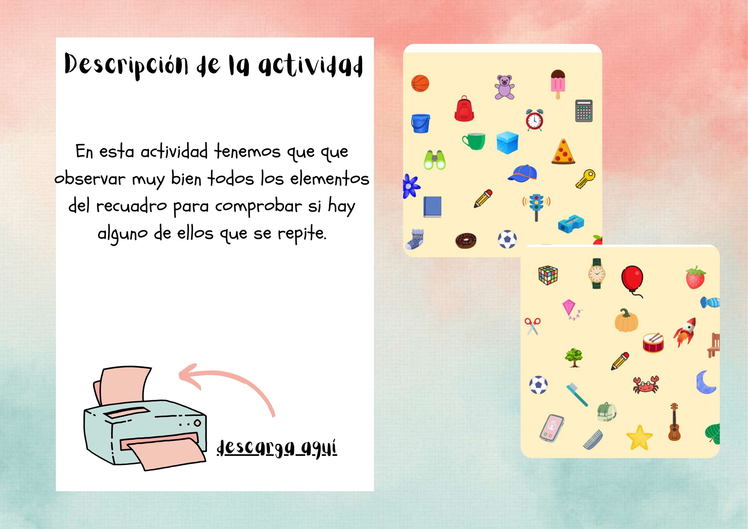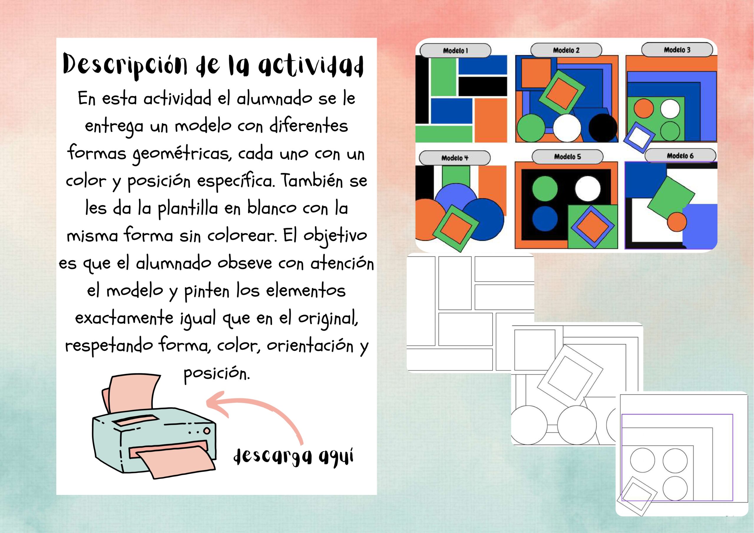 El dossier incluye una variedad de actividades pensadas para entrenar distintos tipos de atención, como la atención sostenida, la atención selectiva y la atención alternante. A través de juegos de observación, búsqueda visual, discriminación de estímulos, seguimiento de consignas y actividades de concentración, los alumnos practican la atención de forma activa y progresiva.