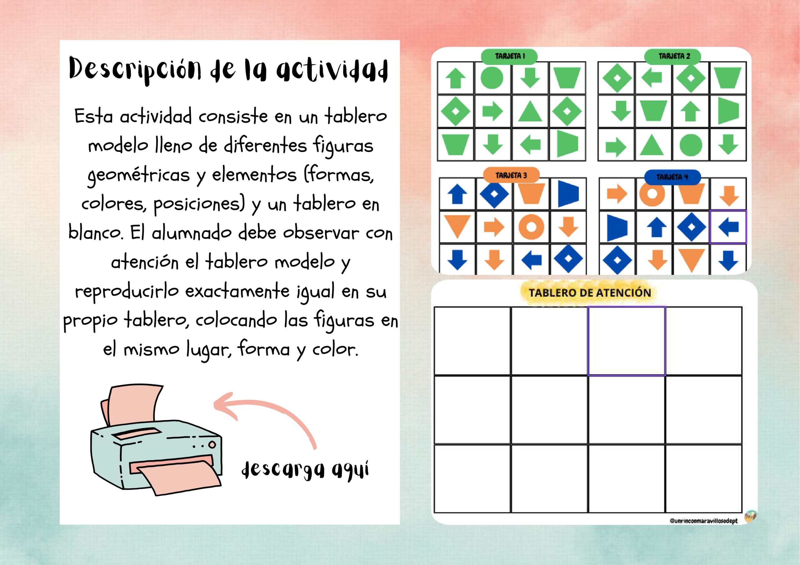 La atención es la base de muchos aprendizajes: permite escuchar instrucciones, seguir una tarea hasta el final, detectar detalles, organizar la información y evitar distracciones. Cuando esta función ejecutiva no está bien desarrollada, el rendimiento académico y la confianza del alumno pueden verse afectados. Por ello, trabajarla de manera sistemática y lúdica resulta fundamental.