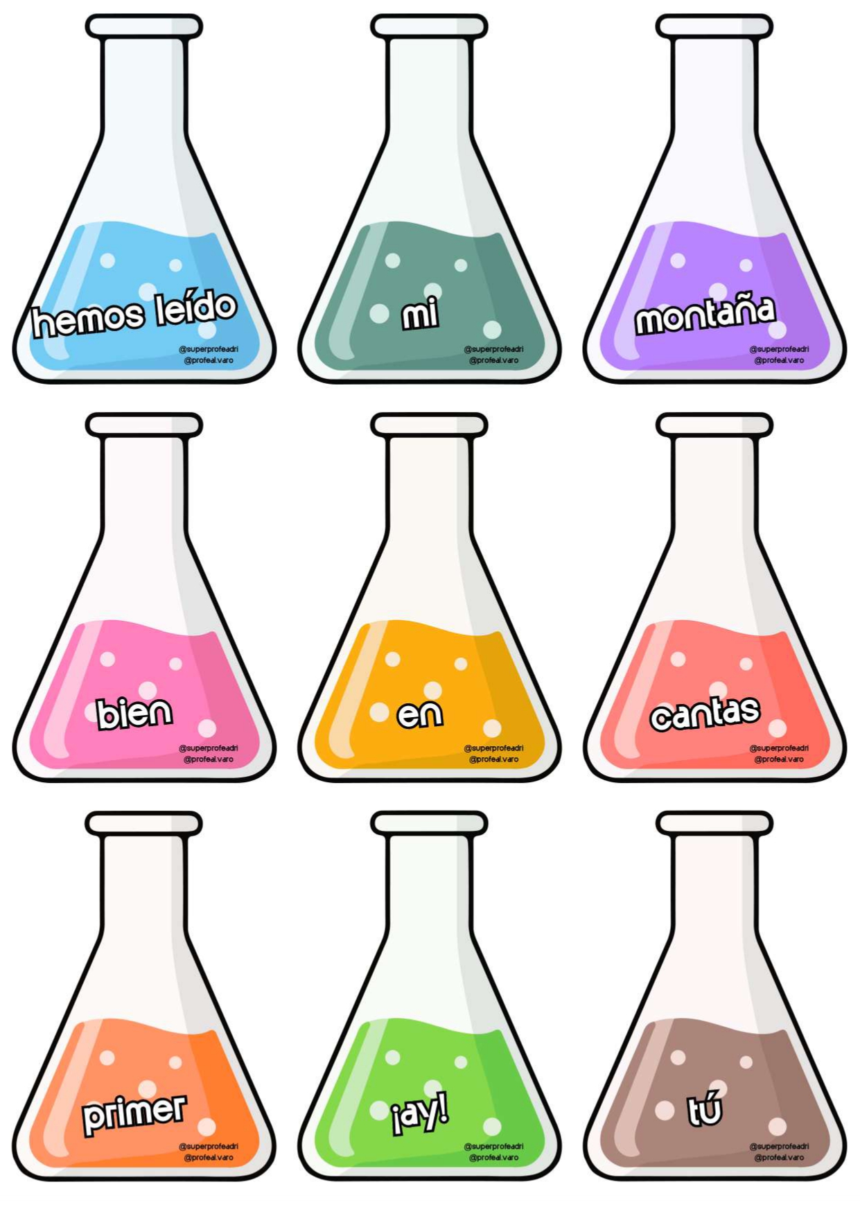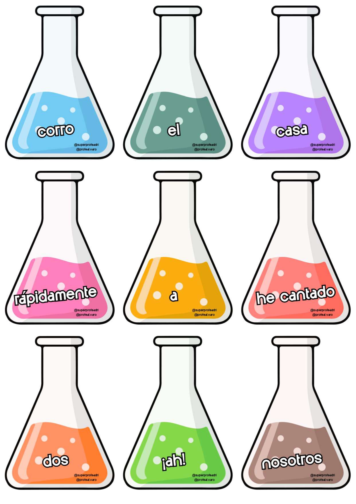 🧪 Análisis de probeta: más de 250 “probetas” con palabras listas para ser analizadas morfológicamente, fomentando la observación, la atención y la clasificación de manera divertida y práctica.