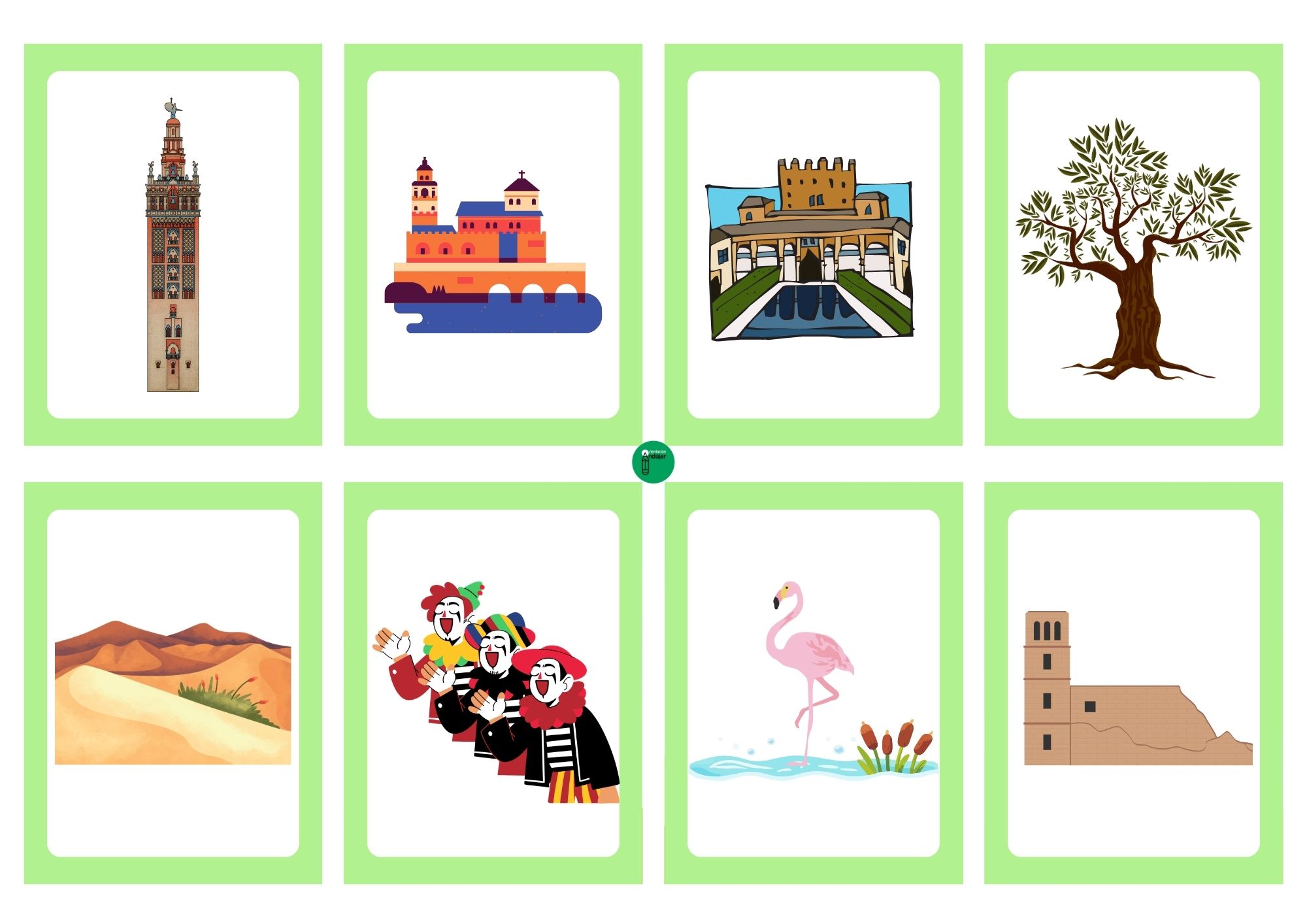 En este nivel, el objetivo es que el alumno relacione el nombre de la provincia con un elemento característico (monumentos, gastronomía o naturaleza). Es ideal para trabajar la asociación de conceptos y empezar a identificar la riqueza de cada rincón andaluz, desde la Giralda hasta los olivares de Jaén.