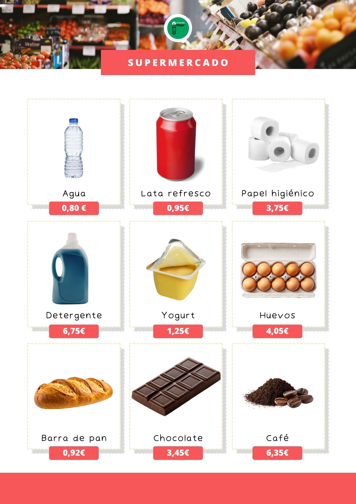 El Catálogo de Productos: Un folleto visual lleno de productos cotidianos (fruta, limpieza, lácteos…) con sus respectivos precios. He intentado que los precios sean realistas para que trabajen bien los números decimales y el redondeo.