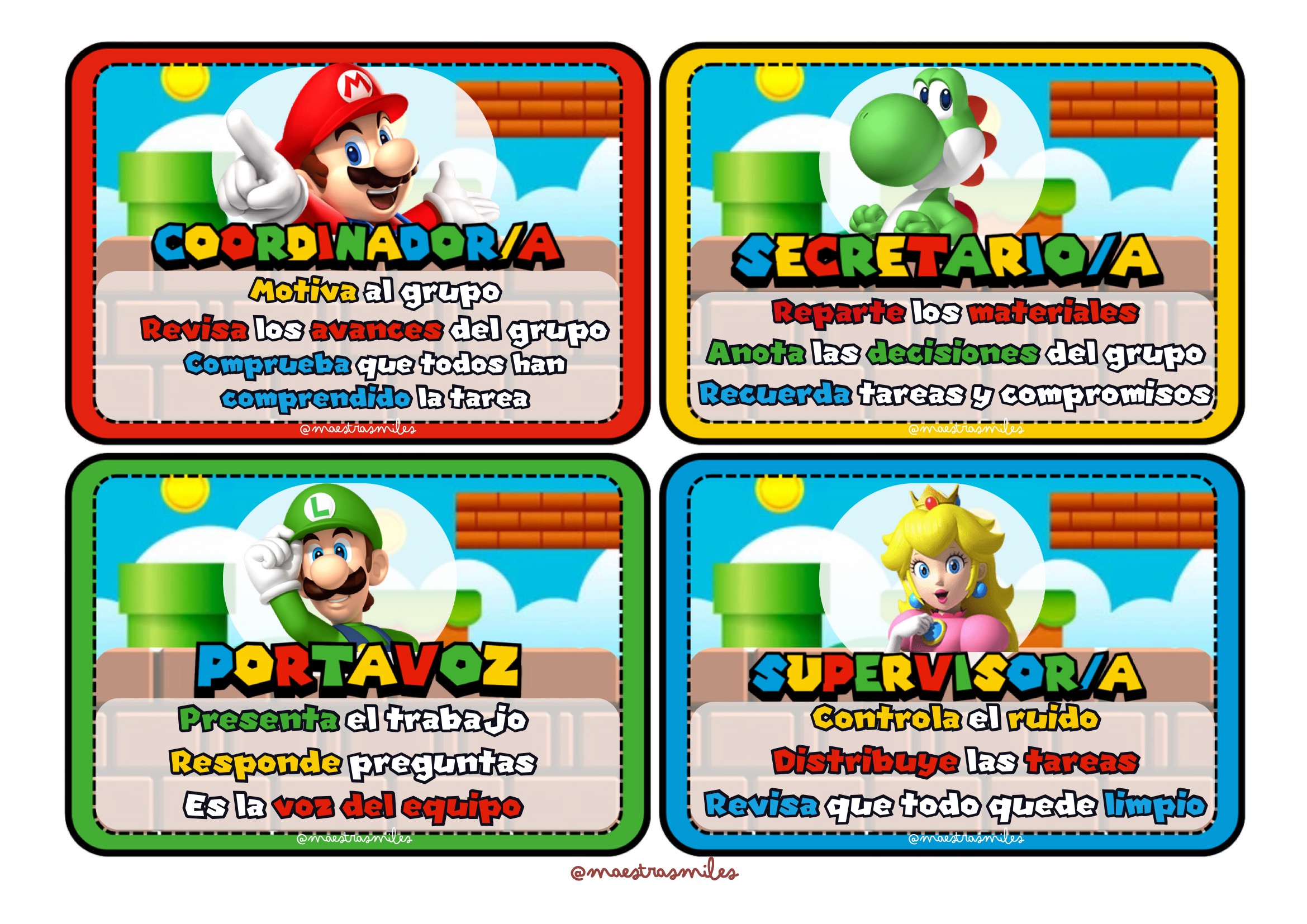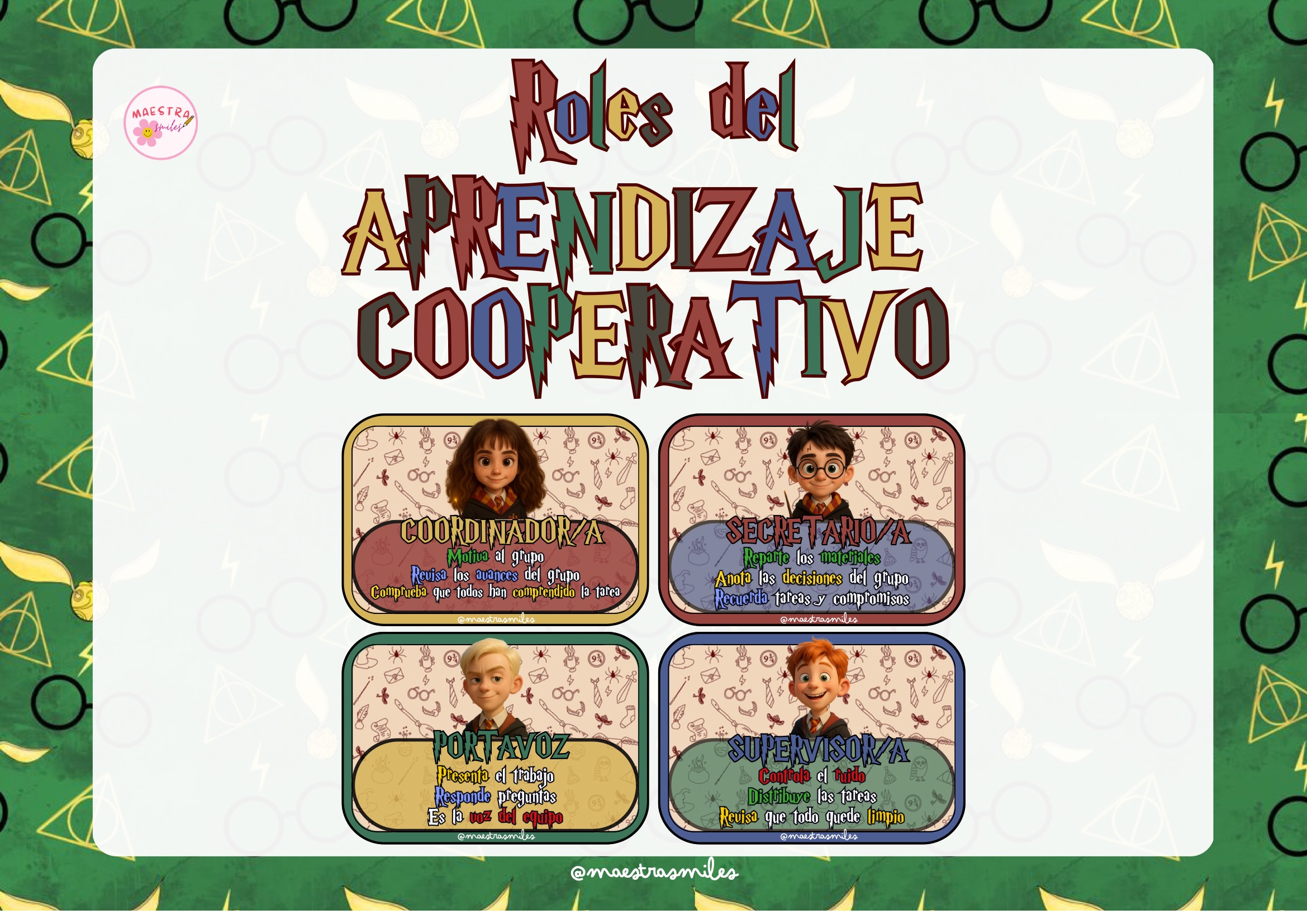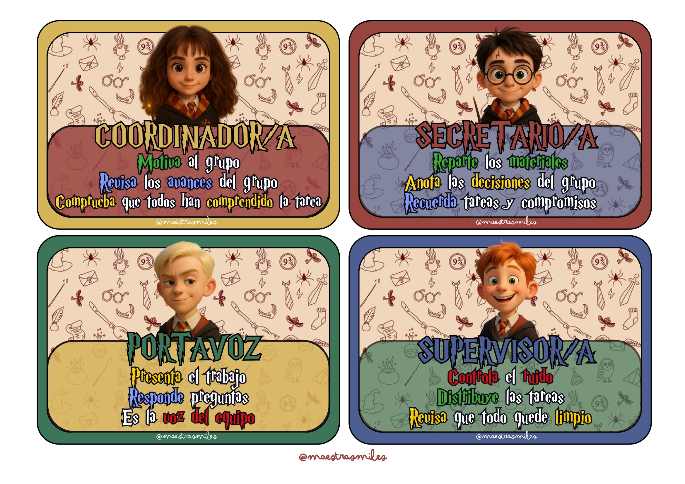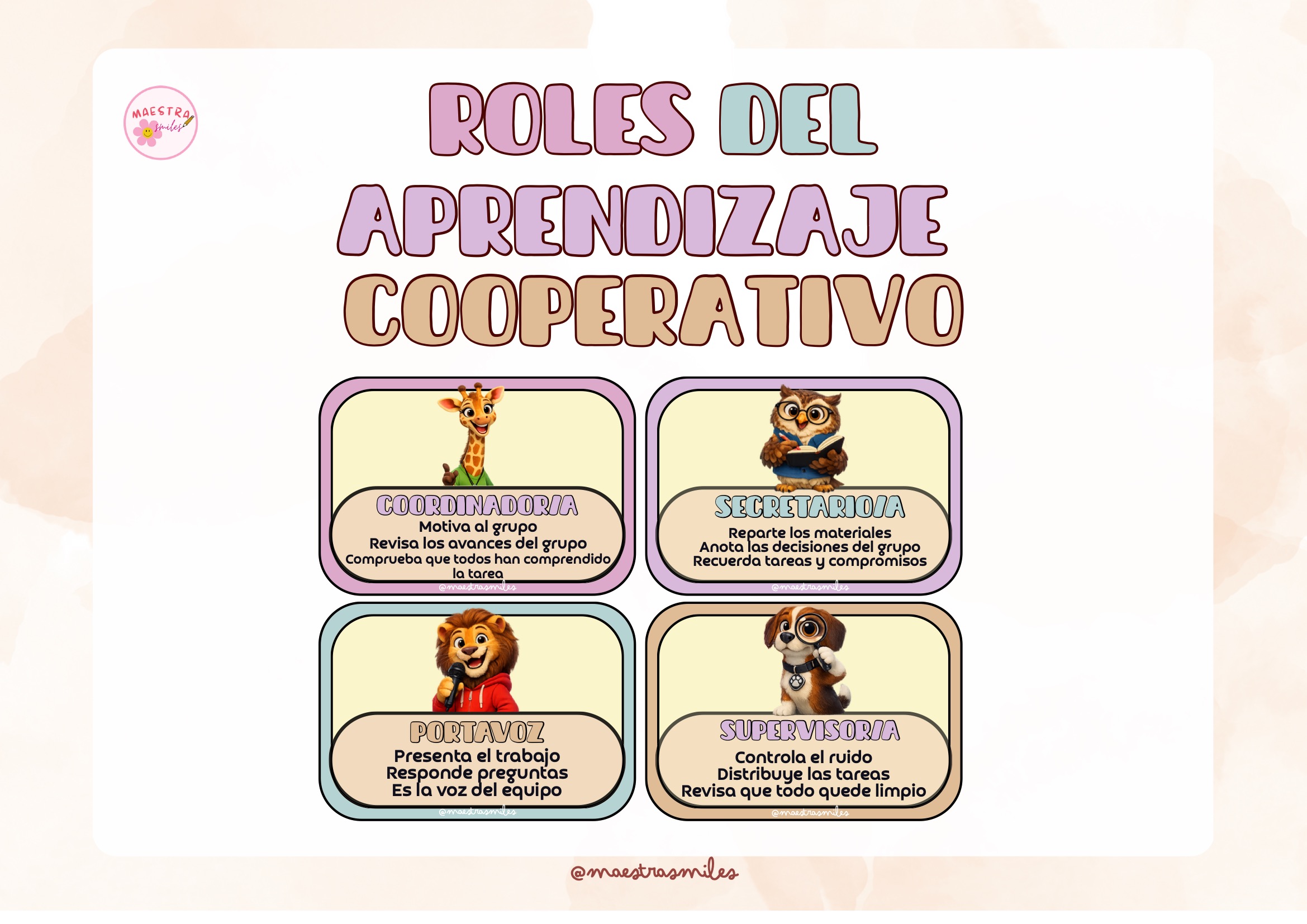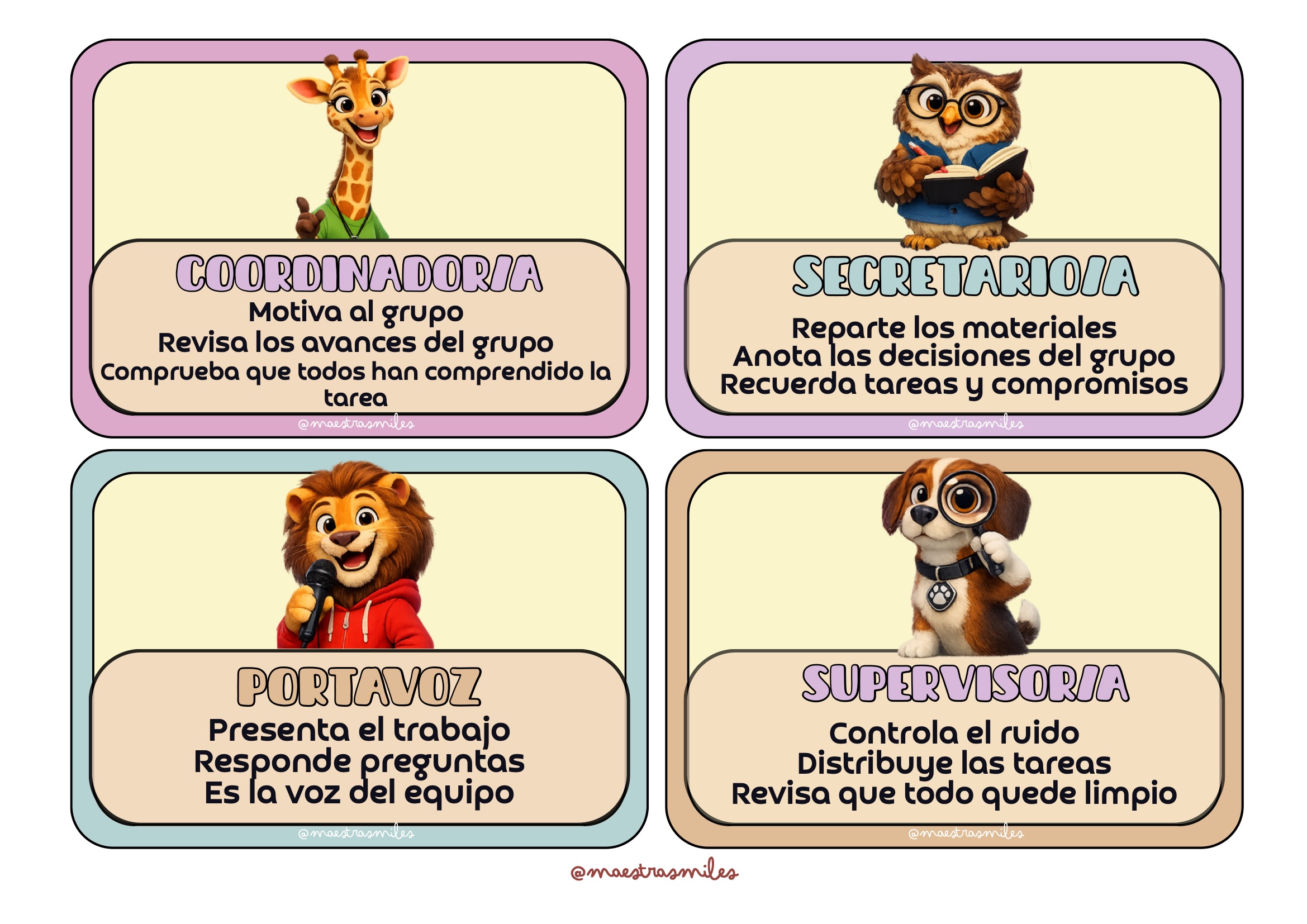 Tarjetas con los principales roles del aprendizaje cooperativo 👥