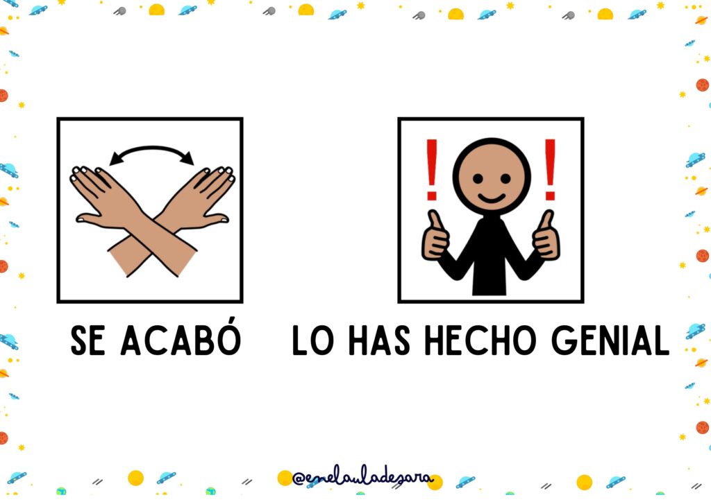Refuerzo positivo visual: El cuaderno finaliza con apoyos visuales y un mensaje de refuerzo: «se acabó. Lo has hecho genial».