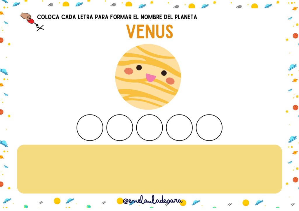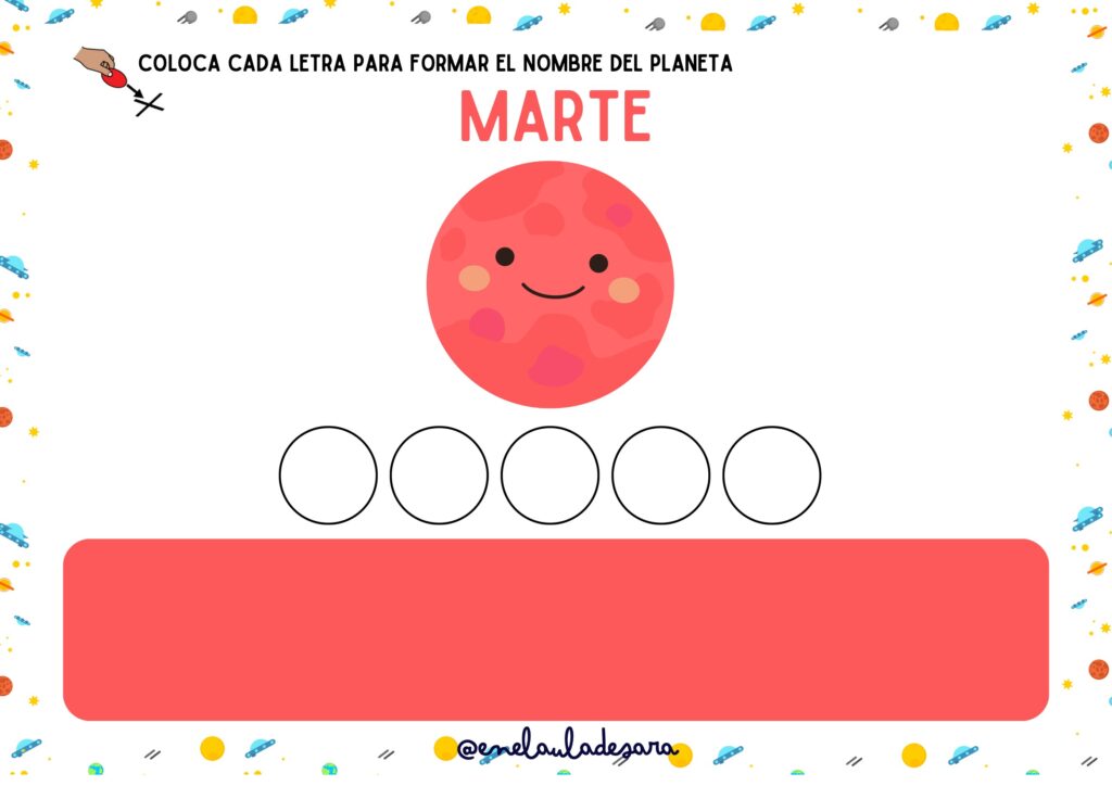 Lectoescritura manipulativa: Los peques tendrán que colocar cada letra para formar el nombre de los diferentes planetas.