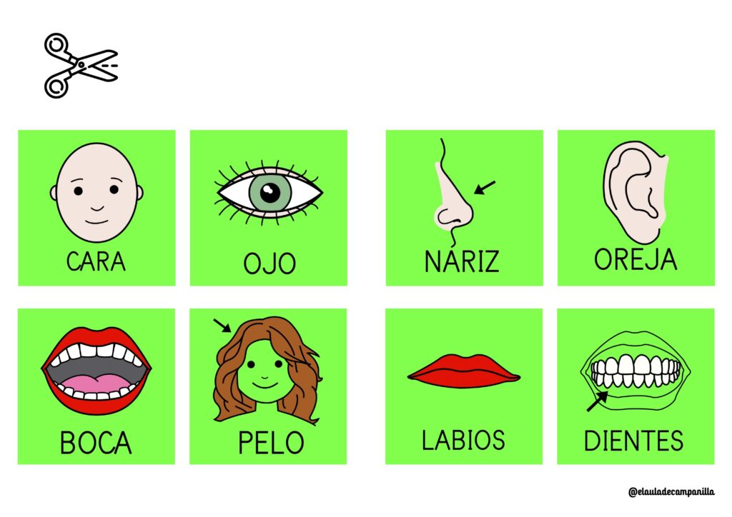 Usa los pictogramas para construir frases simples como: “Tengo ojos”, “Me duele la nariz”, “Estoy contento”.