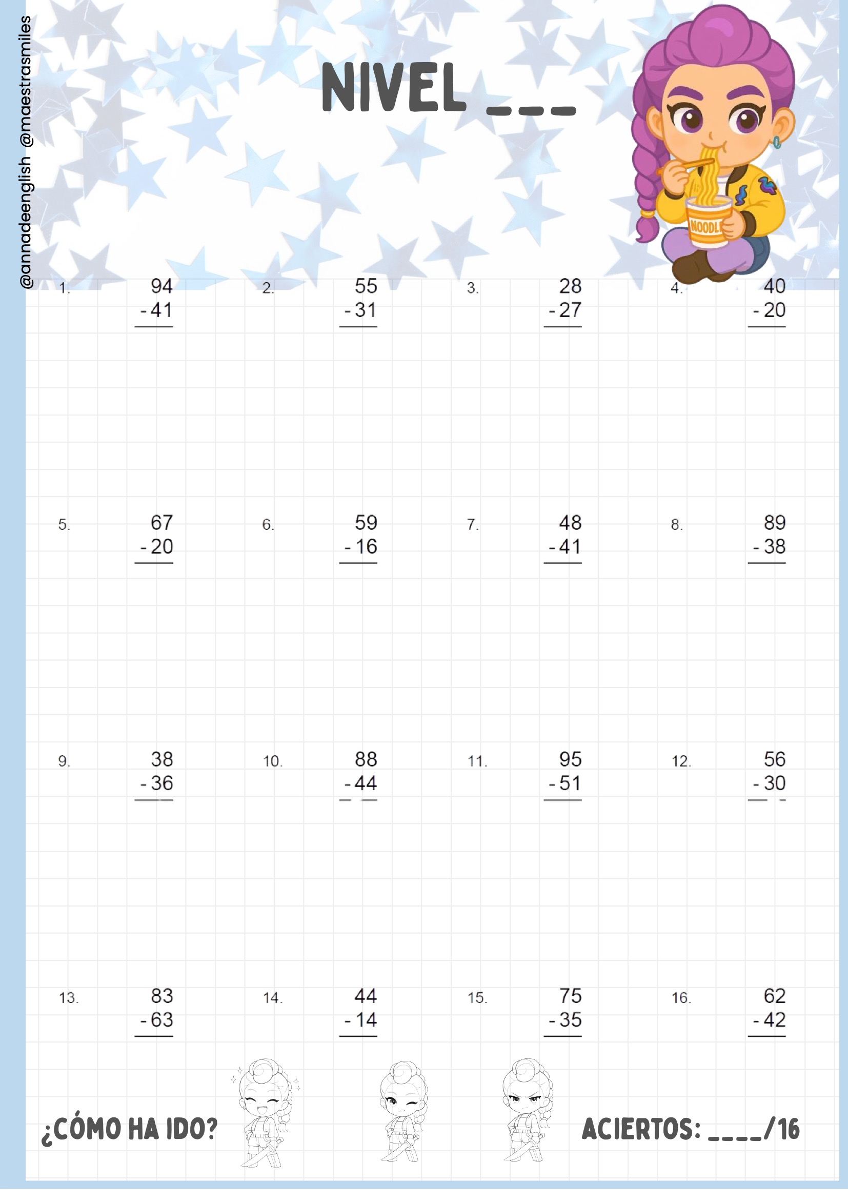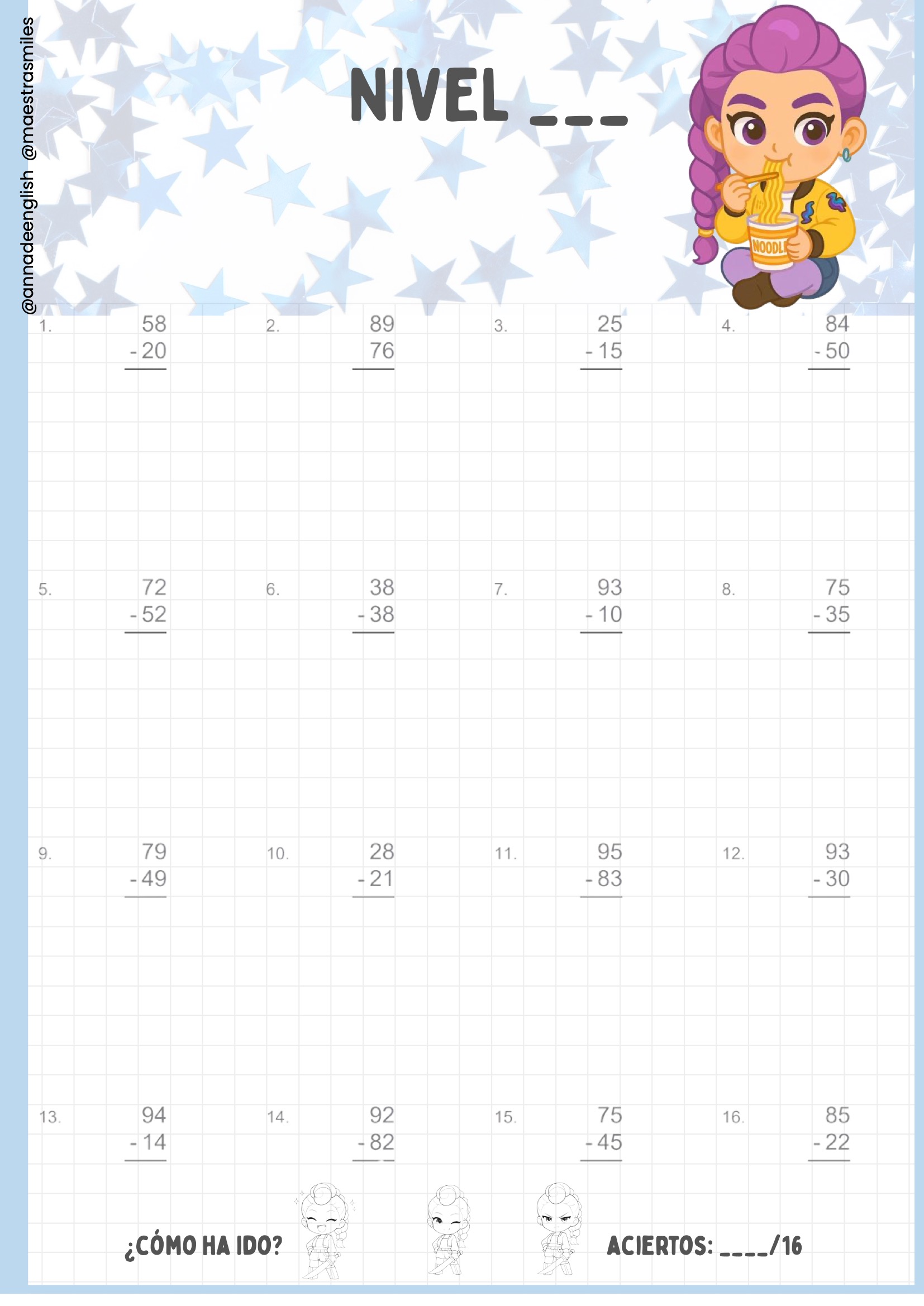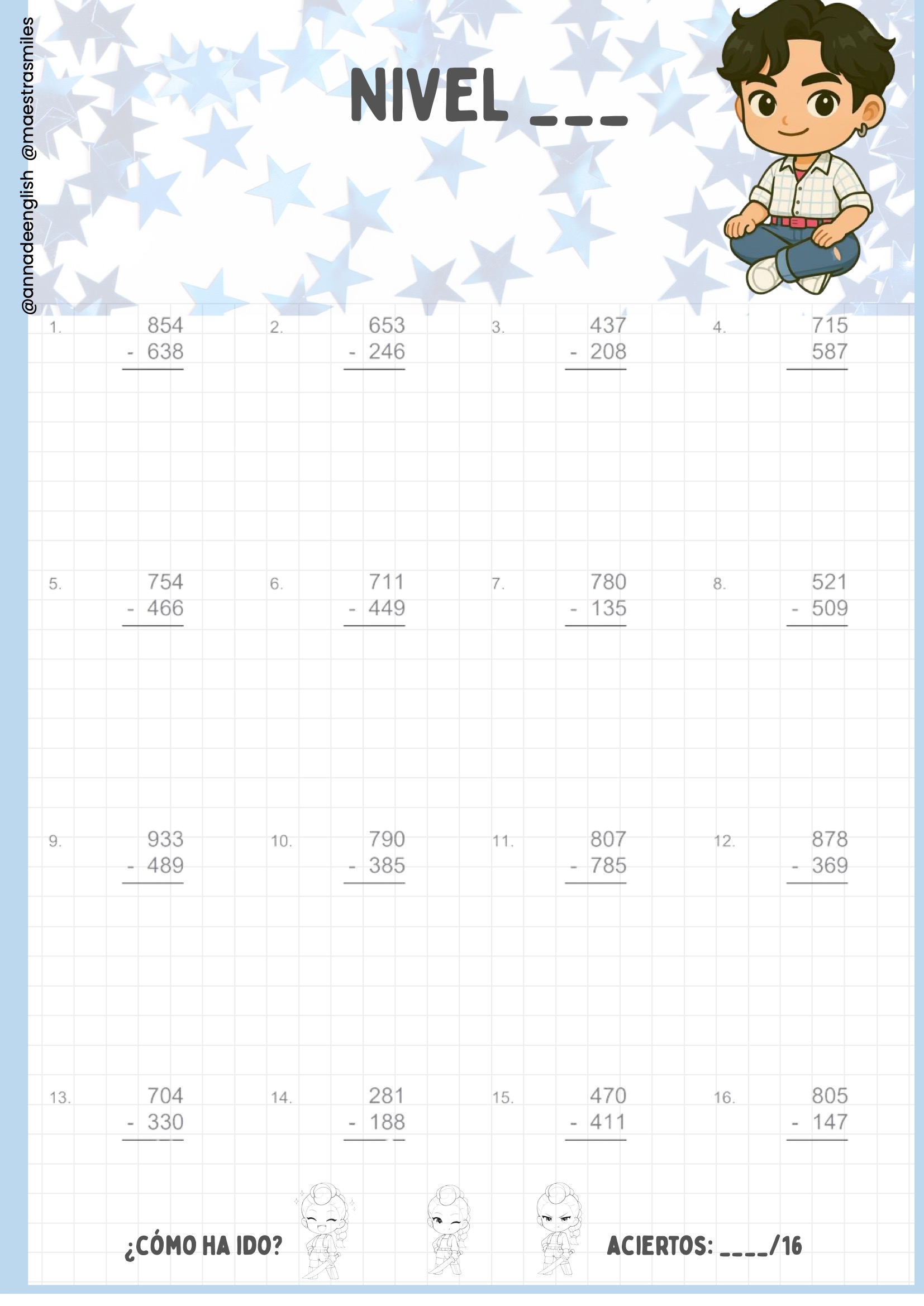 (Como puedes ver en la portada de la página 1 y en las fichas de las páginas 2-20 del cuaderno, cada nivel incluye operaciones adaptadas con espacio para registrar aciertos.)