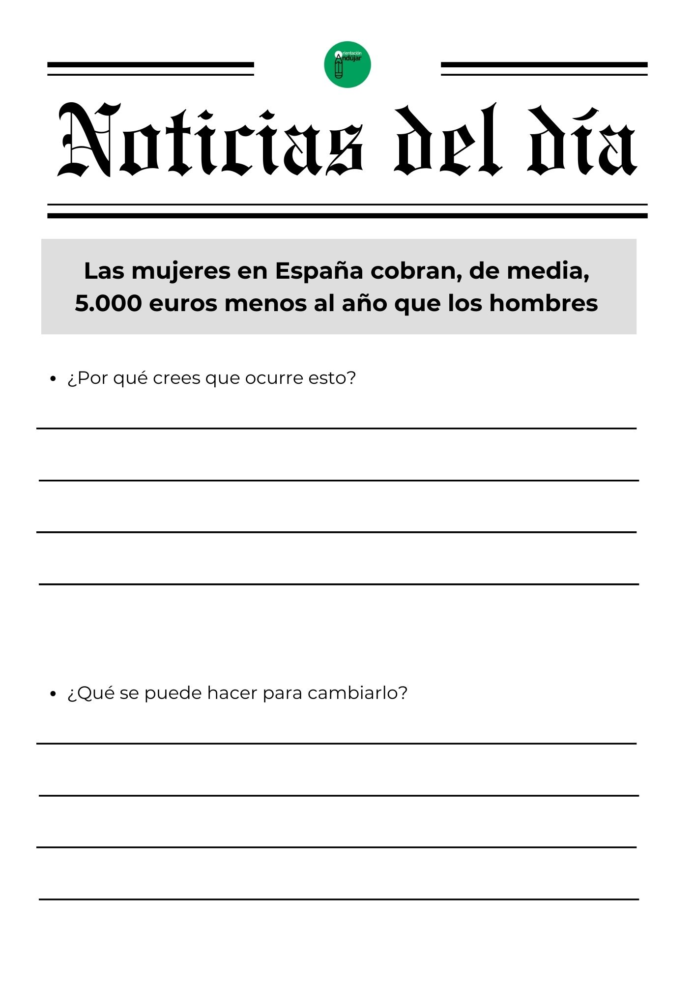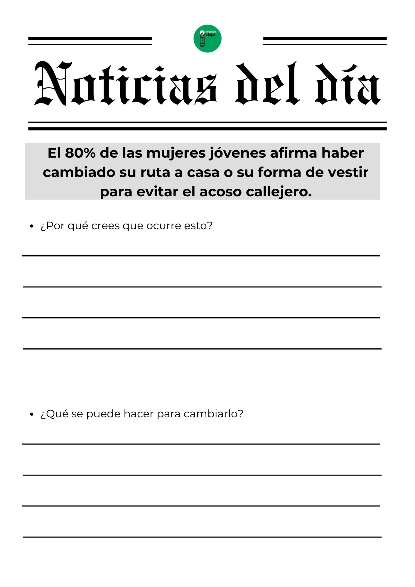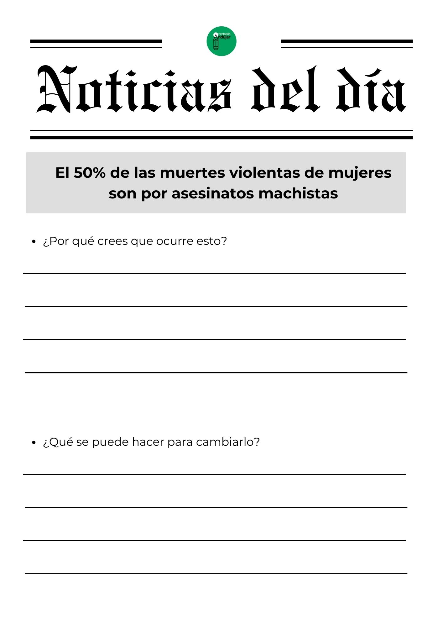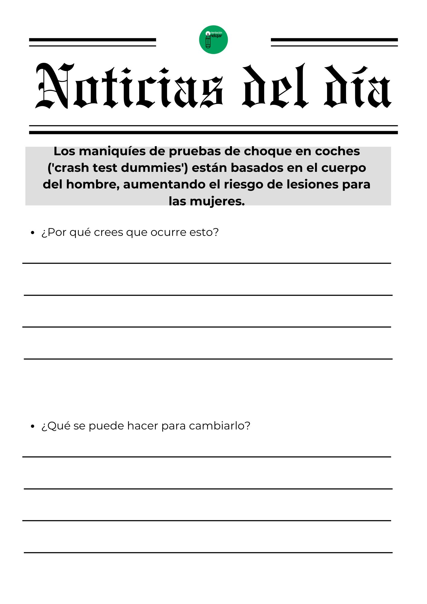 Para responder a este «porqué», hoy compartimos una dinámica basada en el análisis de realidades tangibles. No se trata de teoría, sino de hechos que siguen ocurriendo hoy mismo. La actividad consiste en enfrentar al alumnado a una selección de titulares reales e impactantes que visibilizan las brechas de género en ámbitos tan diversos como la economía, la seguridad vial, la salud y la violencia de control, obligándoles a realizar un ejercicio de «ingeniería inversa» para analizar por qué ocurren y qué acciones concretas podrían cambiarlos.