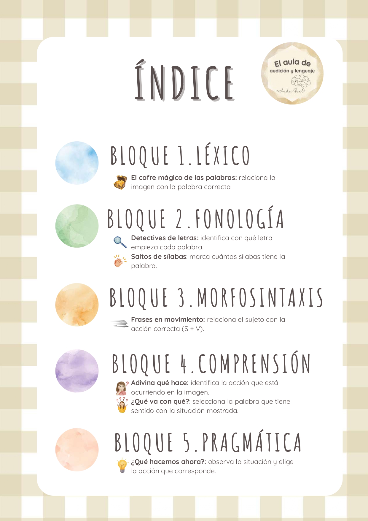 Este pack reúne actividades breves, visuales y muy funcionales que permiten trabajar léxico, fonología, morfosintaxis, comprensión y pragmática de manera ordenada y atractiva.