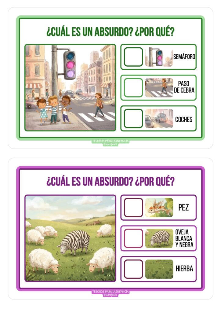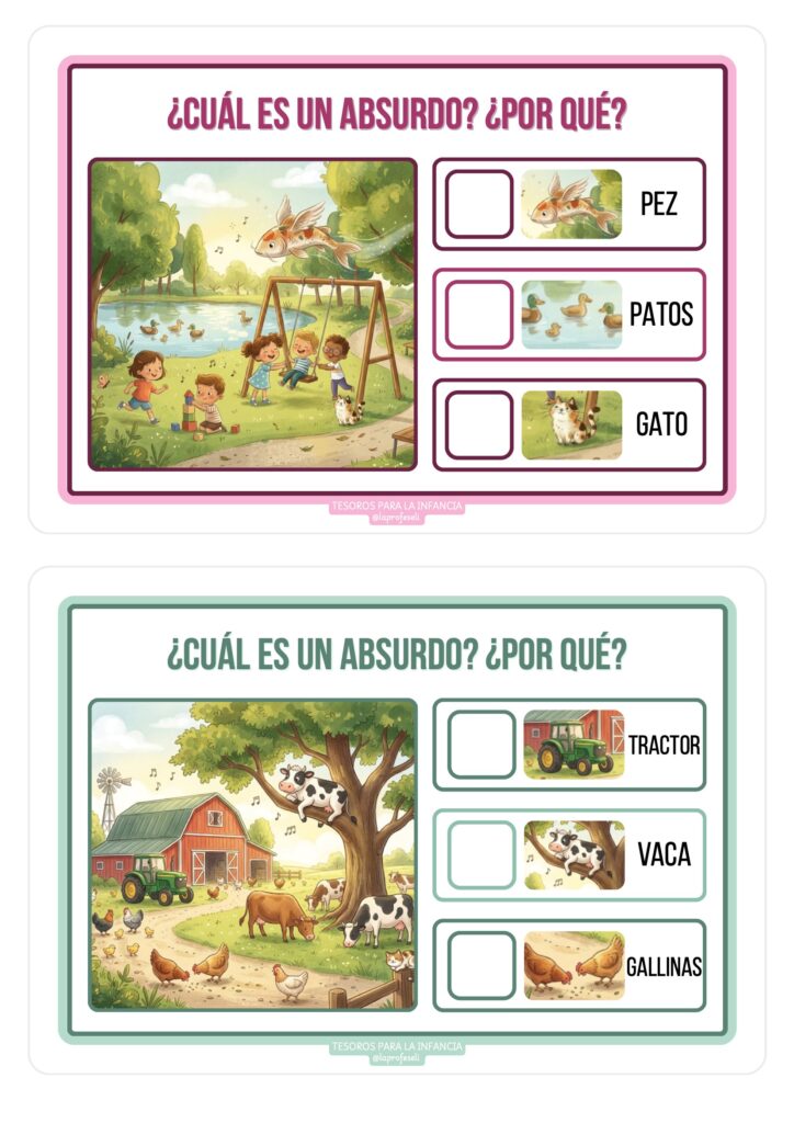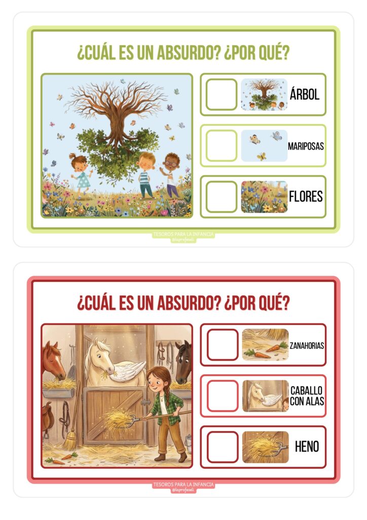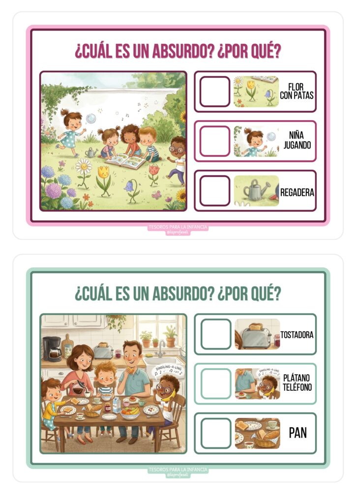 Los absurdos visuales combinan humor, sorpresa y reto cognitivo. Esto hace que los niños y niñas participen con entusiasmo, hablen más, se expresen mejor y disfruten del aprendizaje. Además, son un recurso muy versátil que se adapta a diferentes edades y niveles.