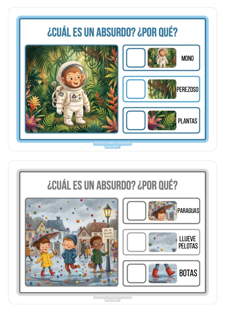 Las 20 tarjetas de absurdos visuales son un material precioso, práctico y muy estimulante para trabajar lenguaje, observación y pensamiento crítico en Infantil y Primaria. Perfectas para usar en el aula, en sesiones de AL o como actividad divertida para casa.