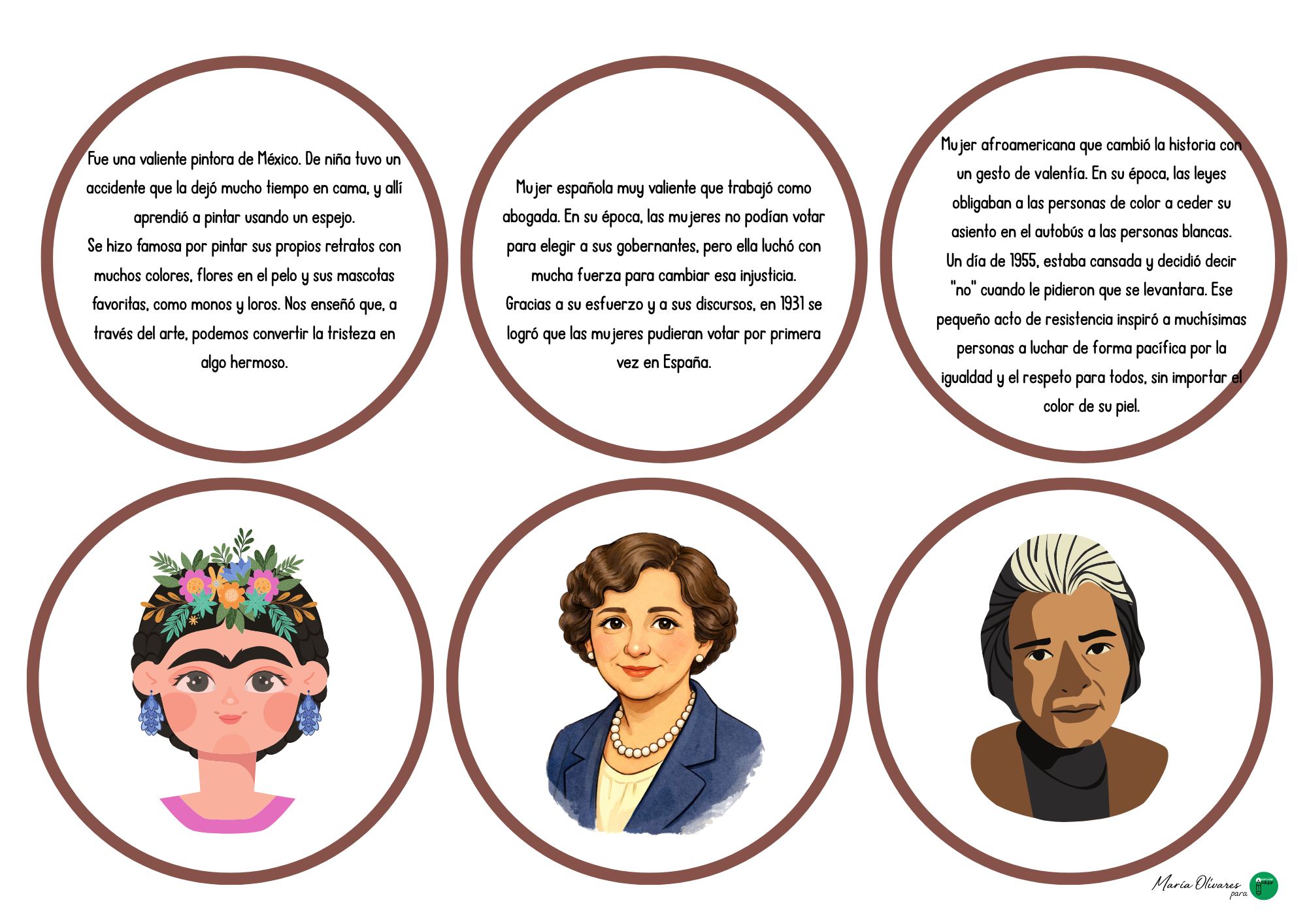 Con motivo de la celebración del Día Internacional de la Mujer, es fundamental acercar a nuestros alumnos las figuras femeninas que han transformado el mundo en disciplinas tan diversas como la ciencia, el arte, la política o los derechos humanos. Para conmemorar esta fecha de una forma dinámica y participativa, hoy compartimos un recurso educativo diseñado en formato de tarjetas circulares. Este material busca que el alumnado no solo reconozca los rostros de estas pioneras, sino que profundice en sus logros y trayectorias mediante un ejercicio de asociación que fomenta la curiosidad y el respeto por la igualdad de género.