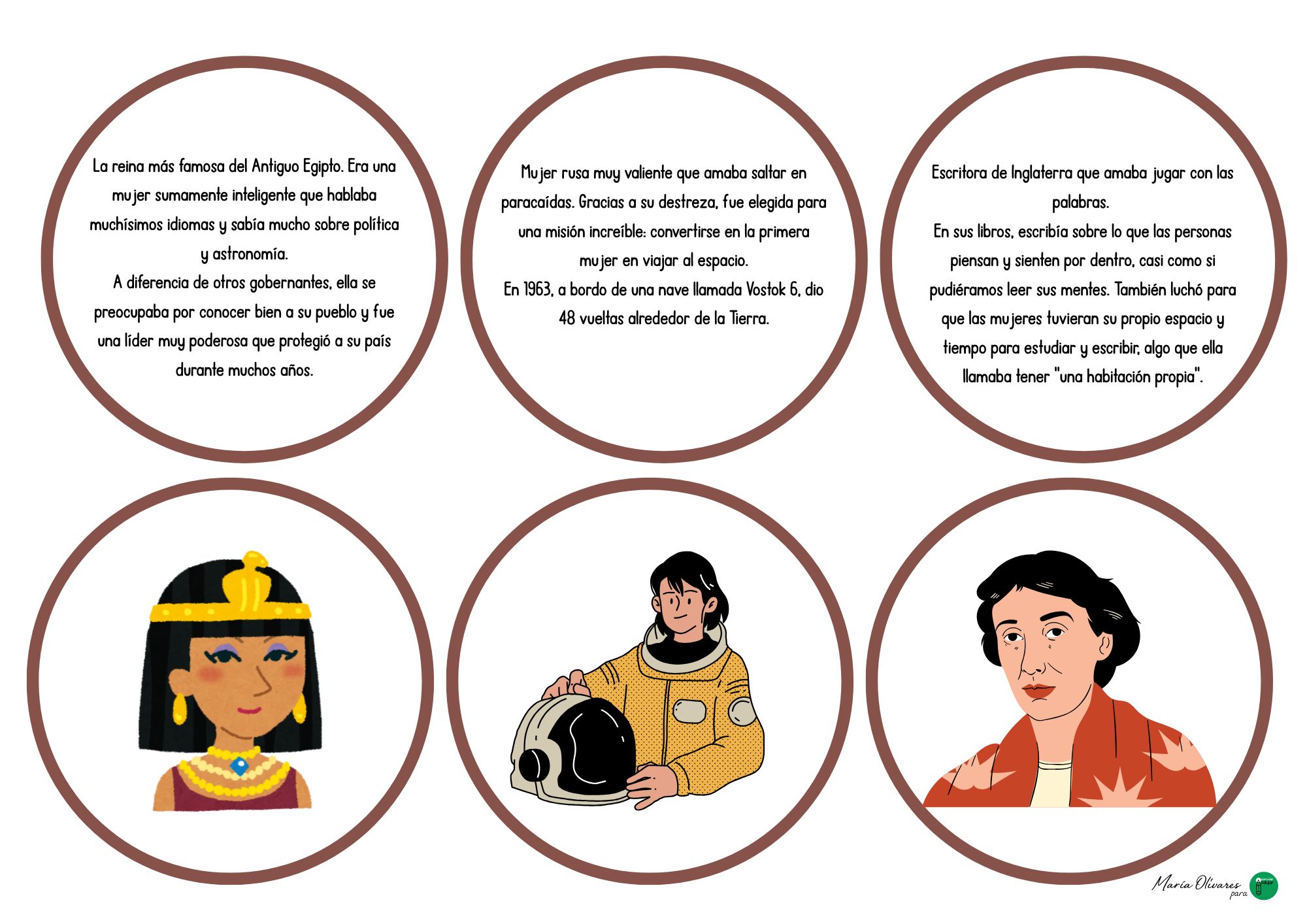 El funcionamiento del recurso es intuitivo y visualmente muy atractivo, lo que lo hace ideal para diferentes niveles de primaria. El pack contiene una serie de discos divididos en dos tipologías: por un lado, encontramos los retratos ilustrados de mujeres referentes y, por otro, breves reseñas biográficas que destacan sus hitos más importantes. El desafío para el alumno consiste en leer con atención los datos biográficos —como el campo de estudio, el país de origen o el descubrimiento realizado— y emparejarlos con la imagen correspondiente, creando así un vínculo directo entre la identidad de la mujer y su legado histórico.