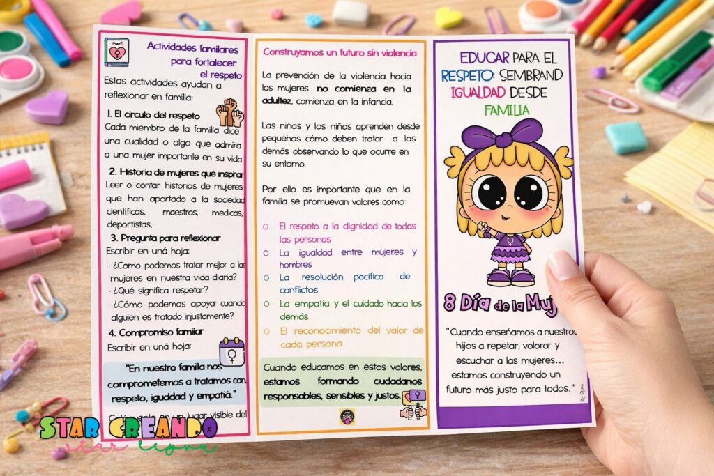 El Tríptico StarCreando para el Día de la Mujer es un recurso precioso, claro y profundamente educativo que permite trabajar el 8M desde la familia, la escuela y la reflexión personal. Su diseño está pensado para acercar a niños y niñas a la historia del Día Internacional de la Mujer, promover valores de igualdad y ofrecer actividades prácticas para fortalecer el respeto dentro del hogar.