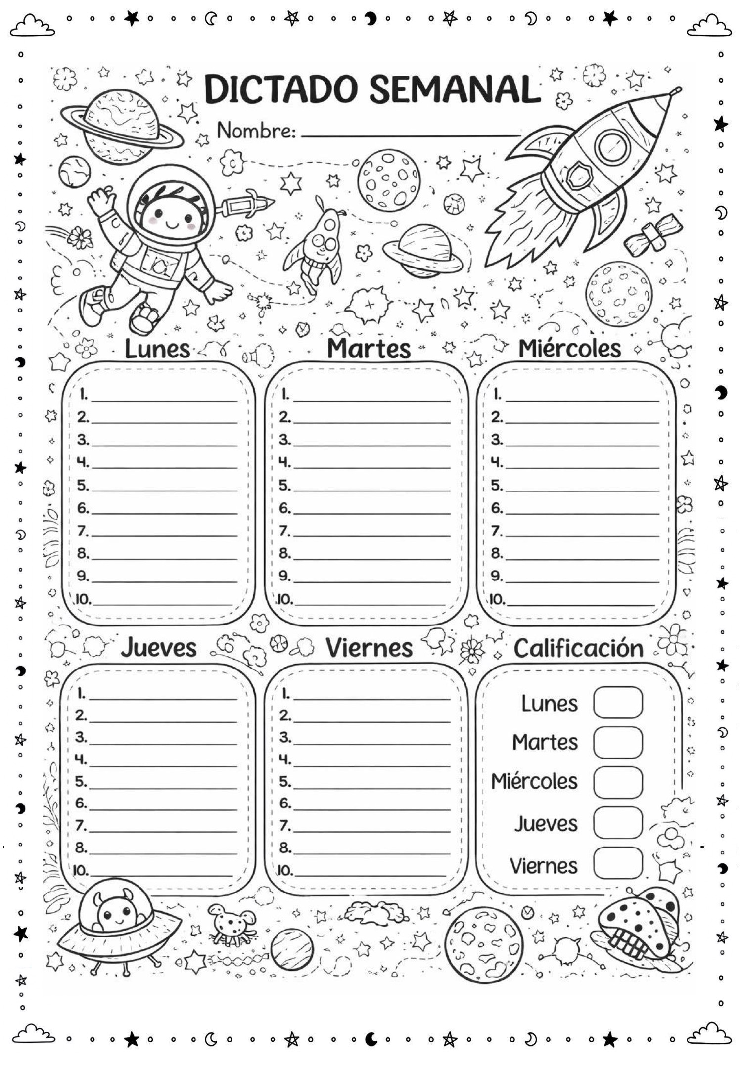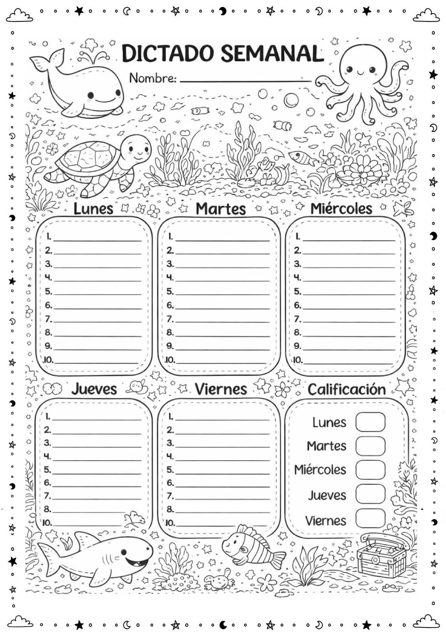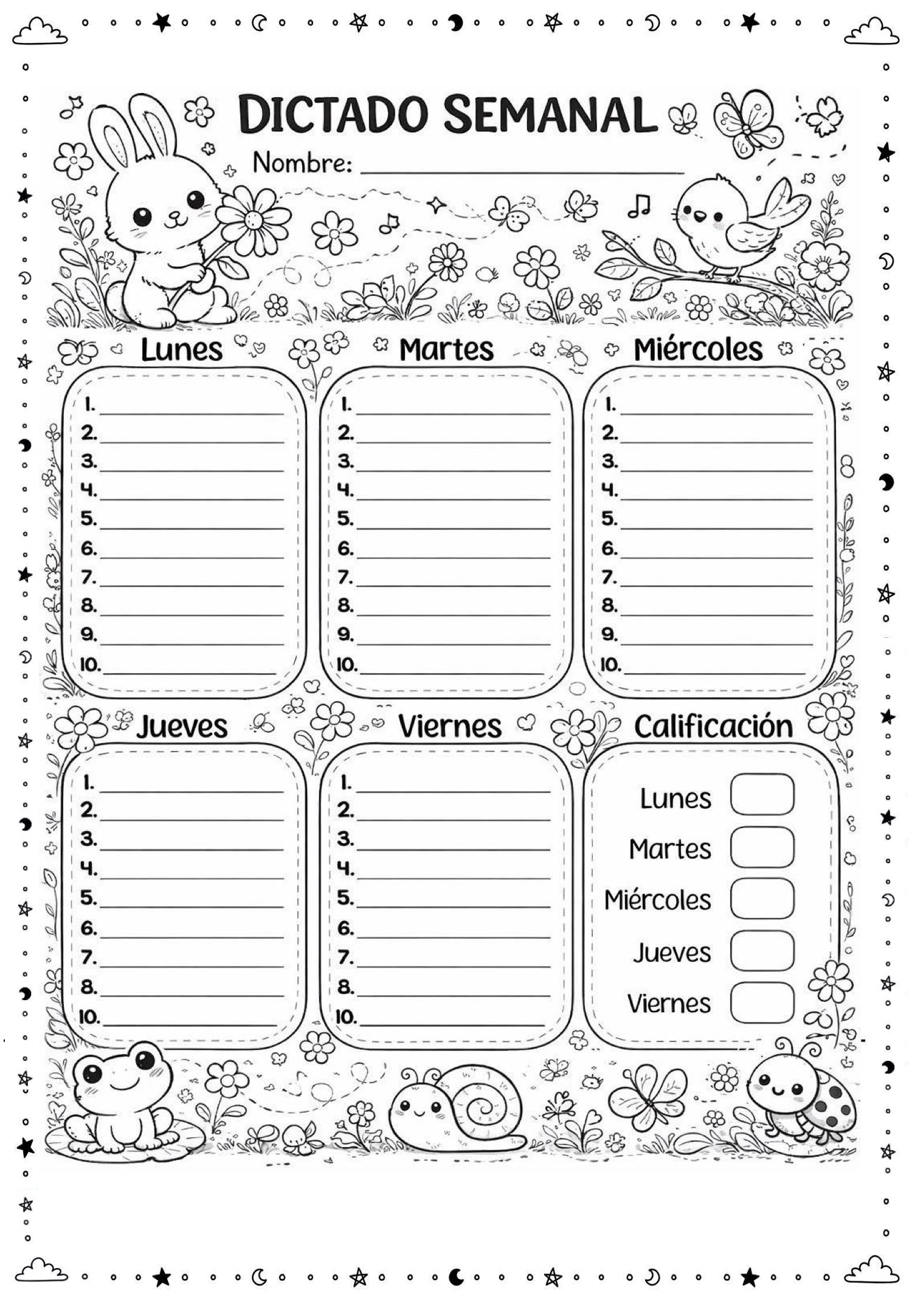 Este tipo de plantillas permiten trabajar cada día de la semana con claridad y orden, ofreciendo un espacio específico para anotar palabras, frases o pequeños dictados según el nivel del grupo. Además, incluyen un apartado de calificación o seguimiento, ideal para observar el progreso del alumnado de forma rápida.