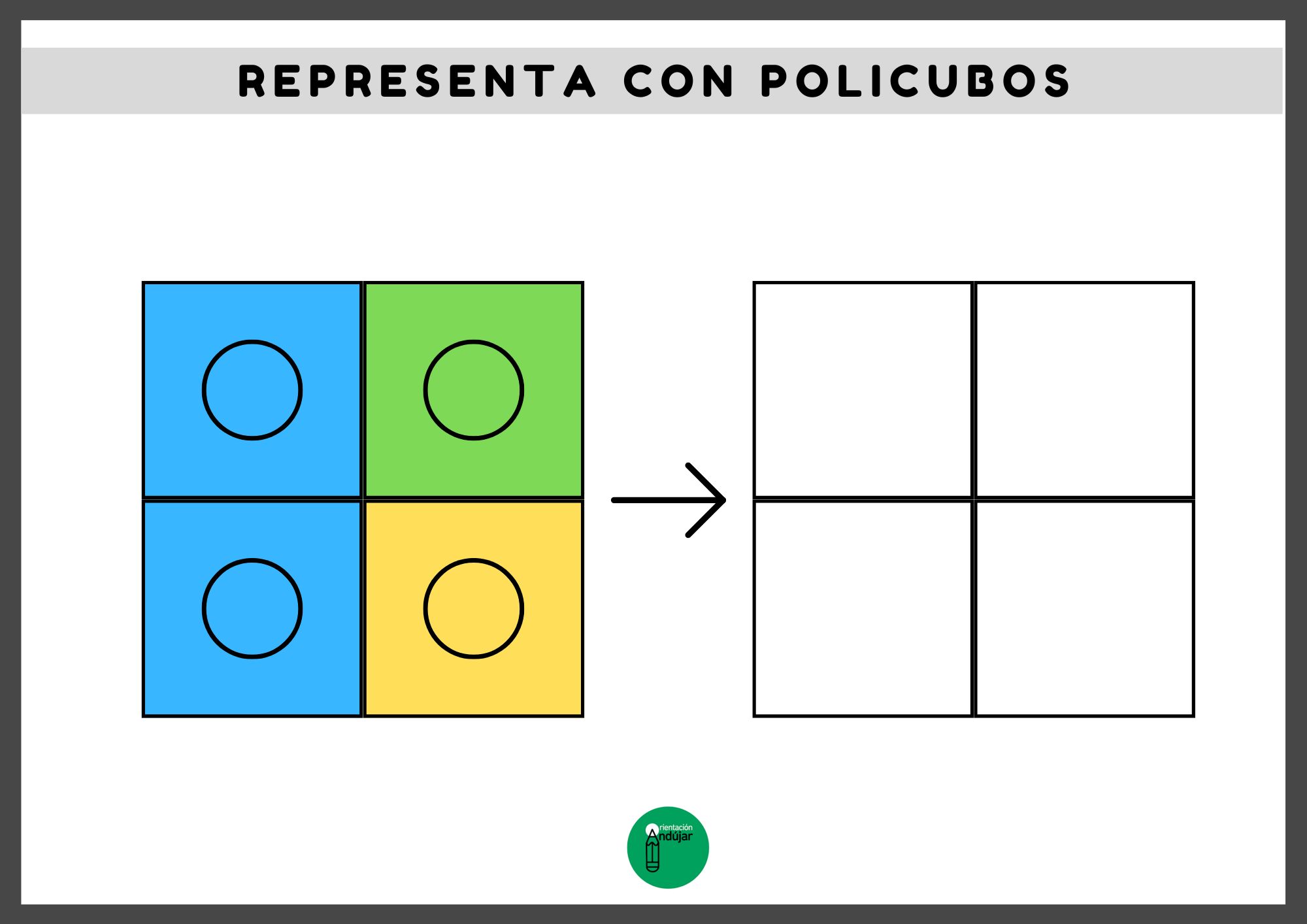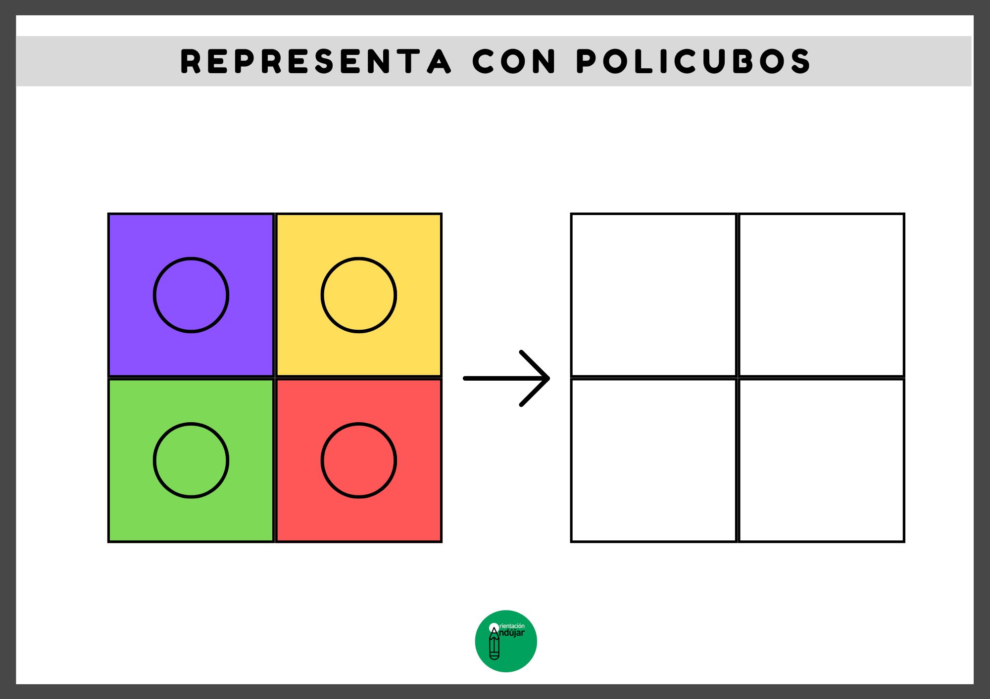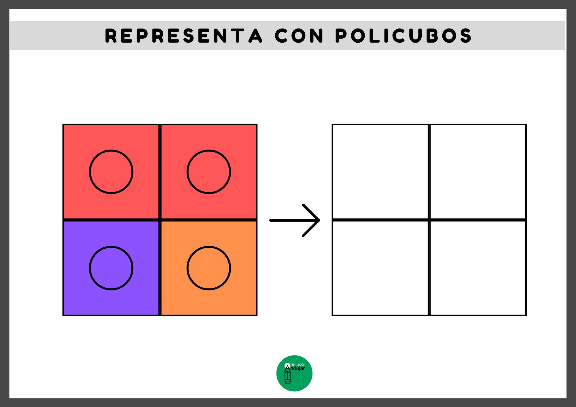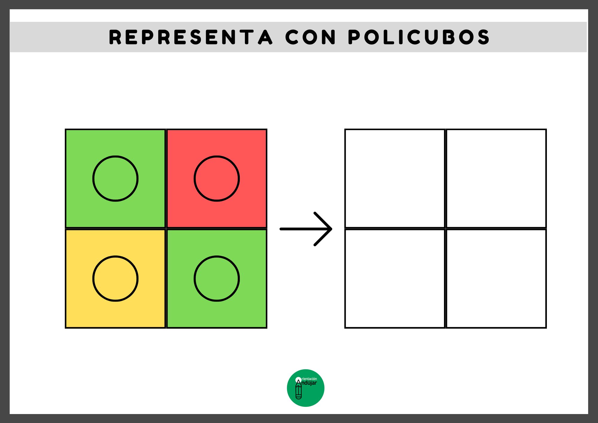 El recurso se compone de una serie de tarjetas o plantillas visuales. En cada una de ellas, el niño encontrará una representación gráfica de cuatro policubos dispuestos en una formación específica y con colores determinados. El objetivo es que el alumno, utilizando sus propios cubos físicos, imite exactamente lo que ve en el papel.