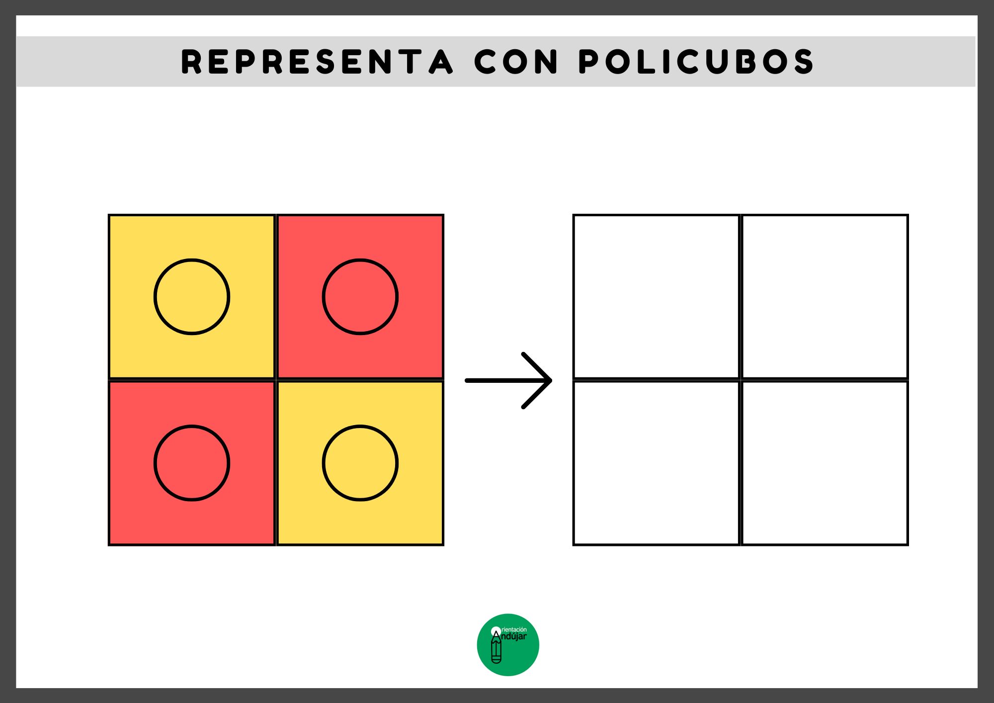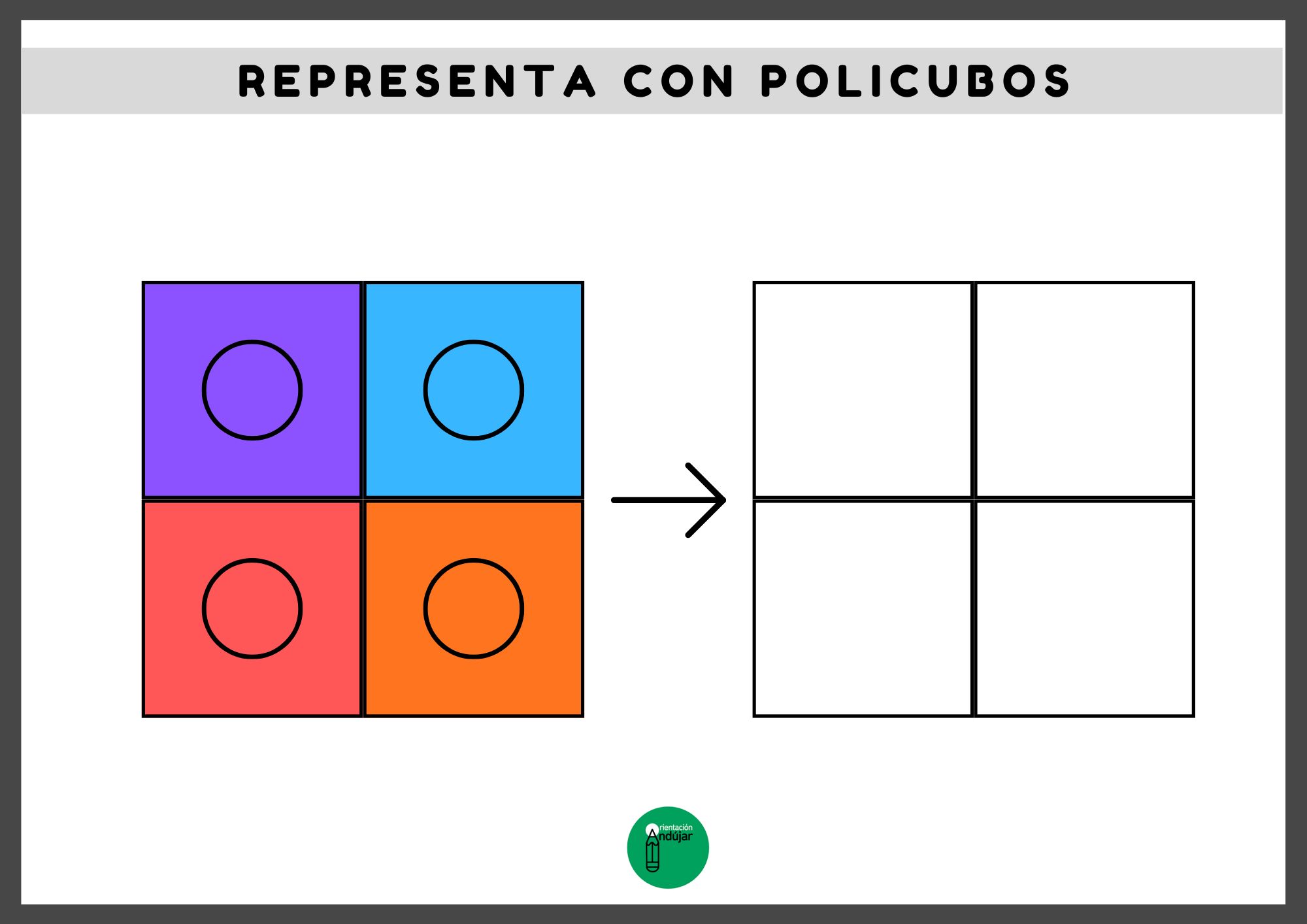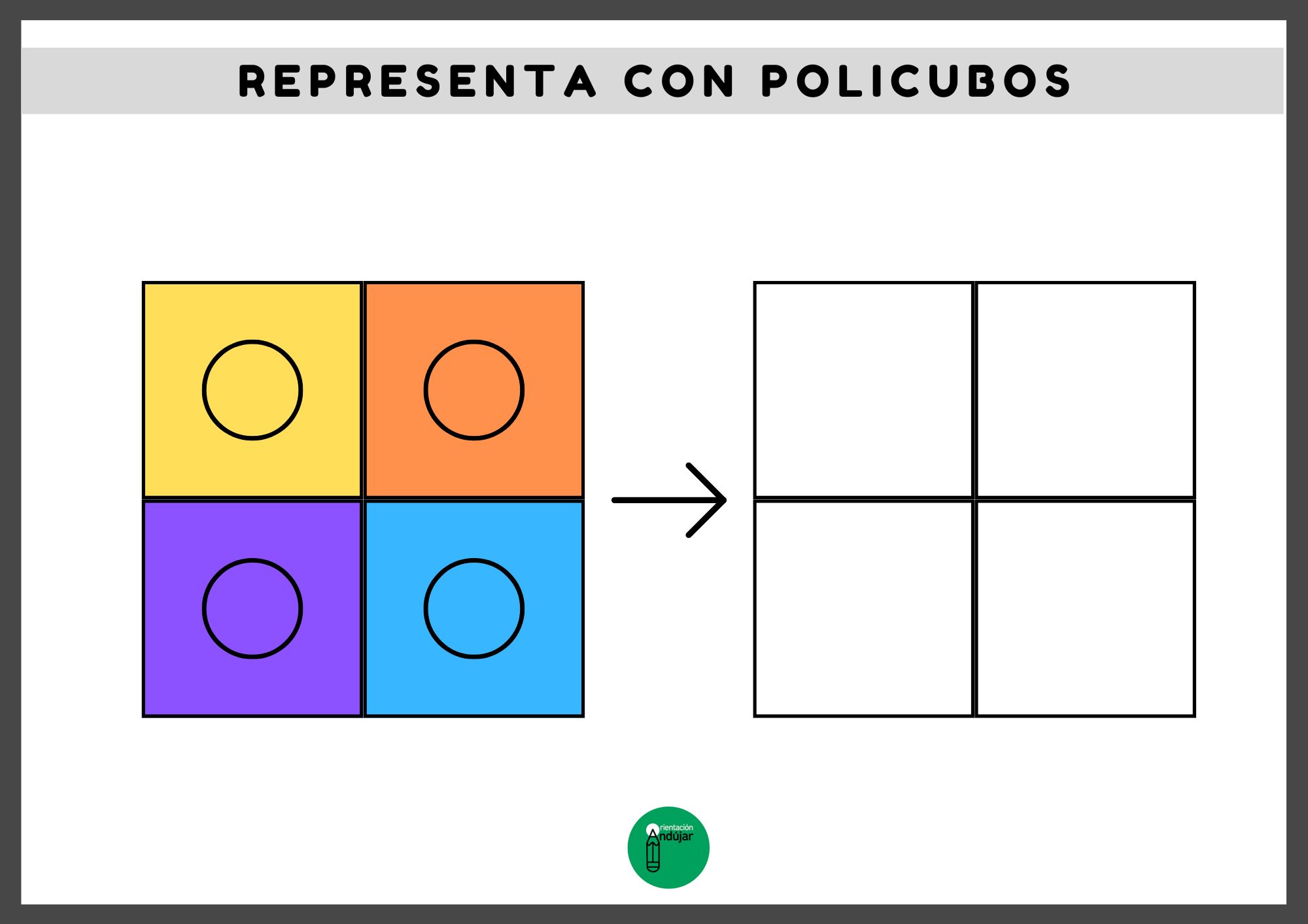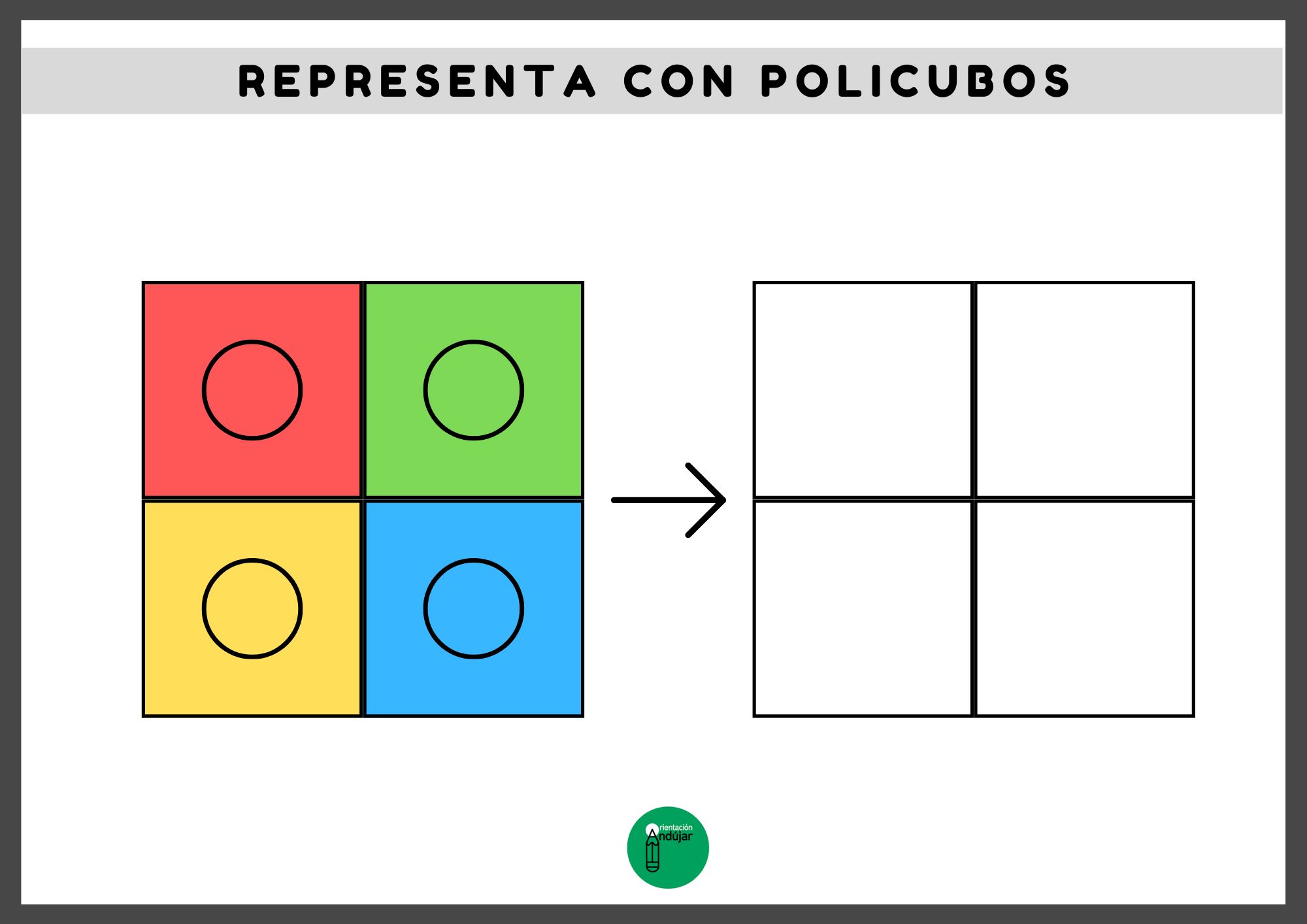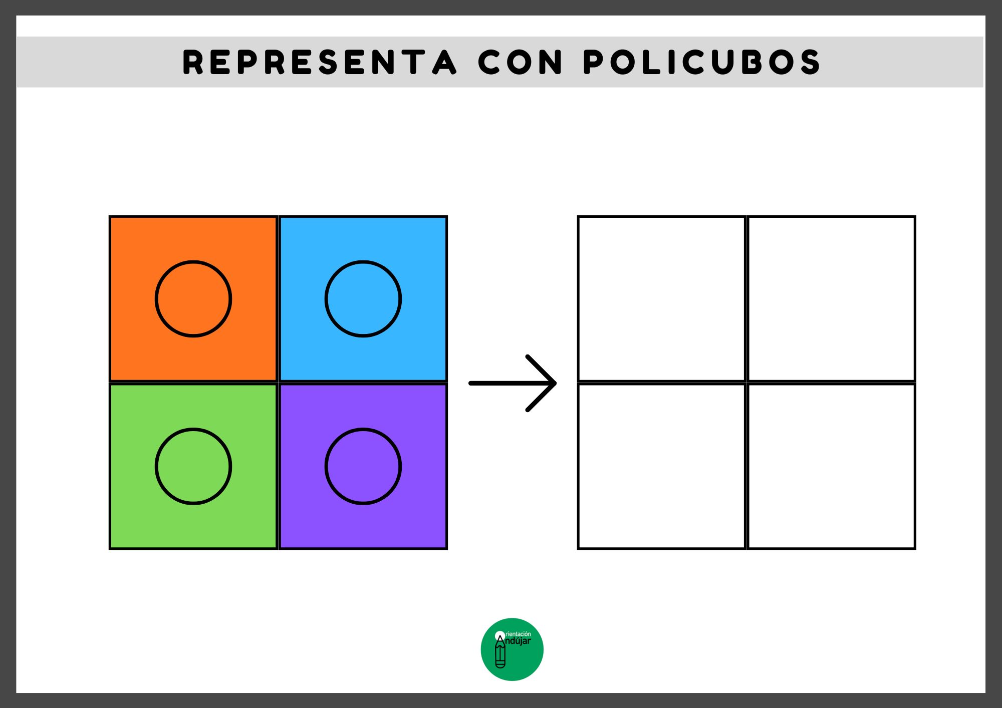 El recurso se compone de una serie de tarjetas o plantillas visuales. En cada una de ellas, el niño encontrará una representación gráfica de cuatro policubos dispuestos en una formación específica y con colores determinados. El objetivo es que el alumno, utilizando sus propios cubos físicos, imite exactamente lo que ve en el papel.
