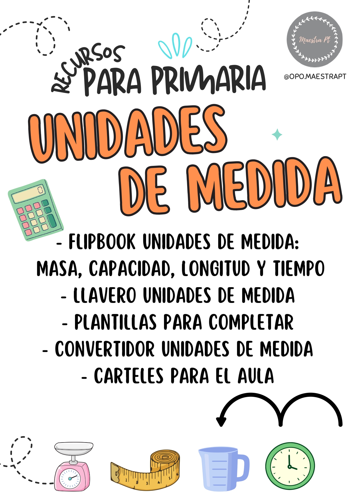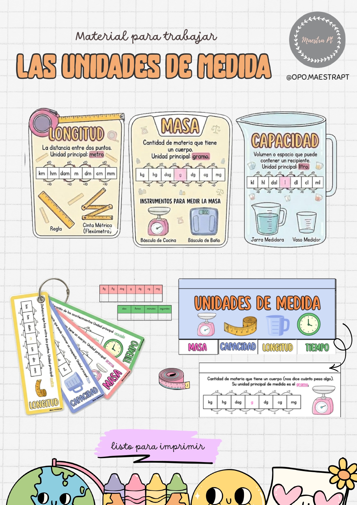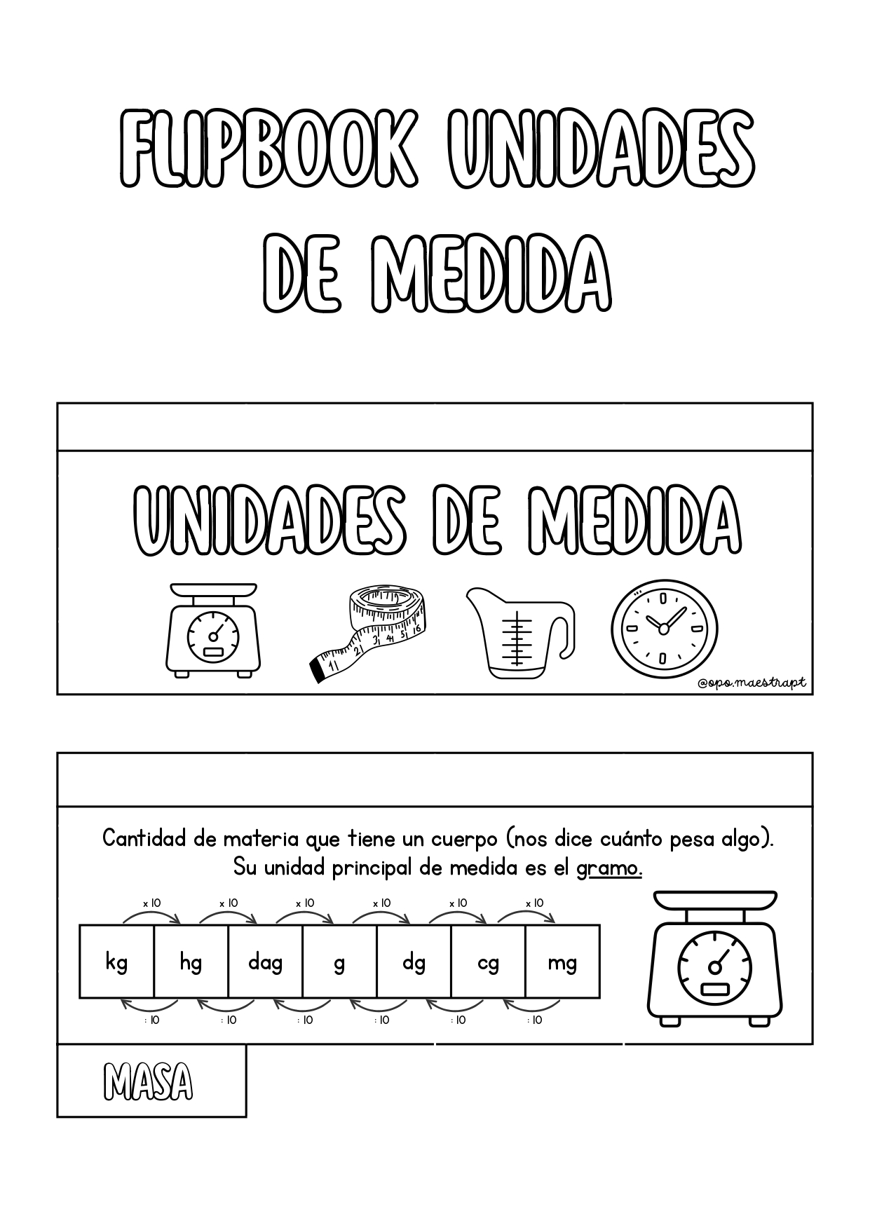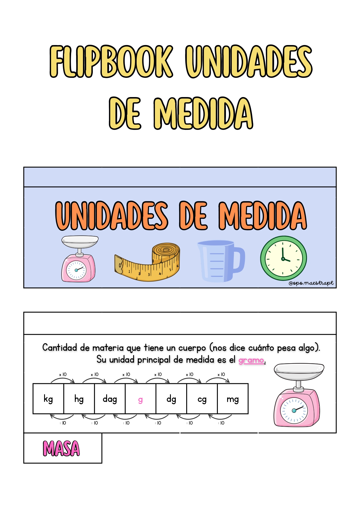 Flipbook de unidades de medida: Un libro interactivo donde cada pestaña corresponde a una magnitud (masa, capacidad, longitud y tiempo). Es ideal para tener toda la teoría organizada y a mano de forma súper visual.