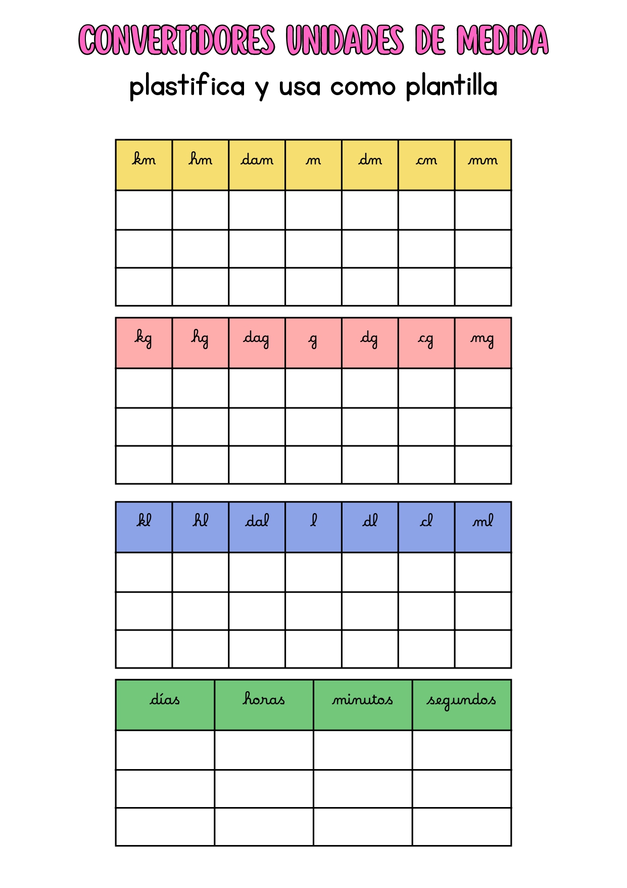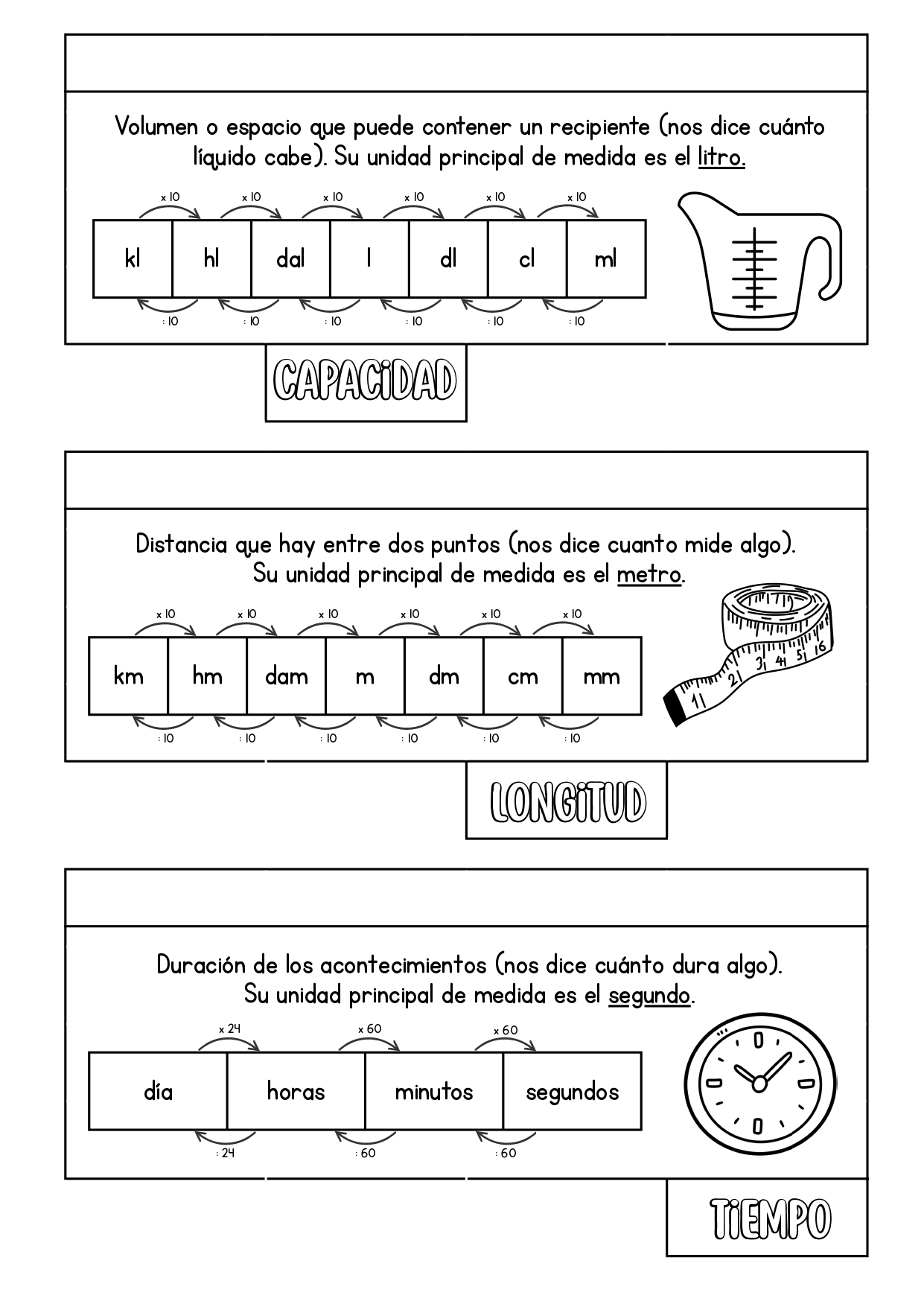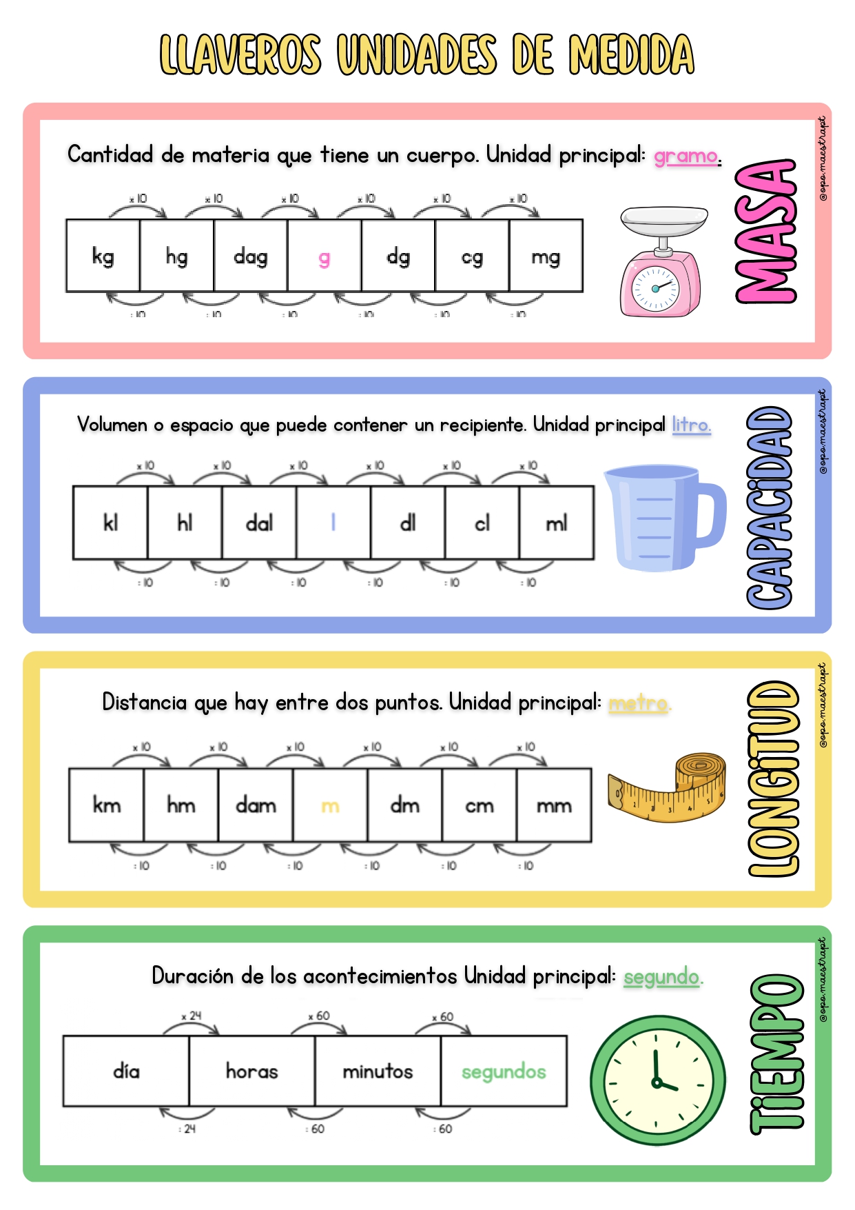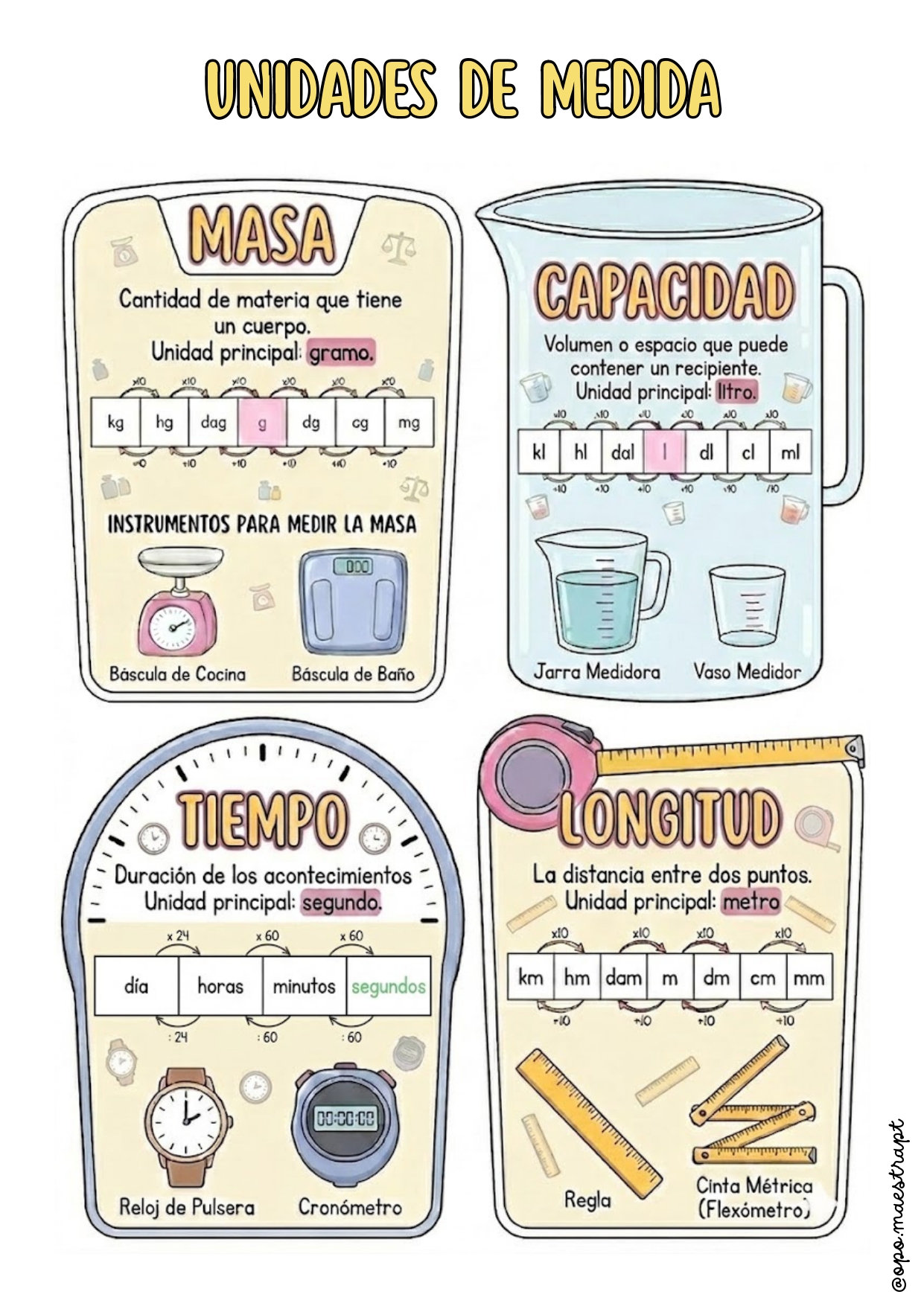 Flipbook de unidades de medida: Un libro interactivo donde cada pestaña corresponde a una magnitud (masa, capacidad, longitud y tiempo). Es ideal para tener toda la teoría organizada y a mano de forma súper visual.