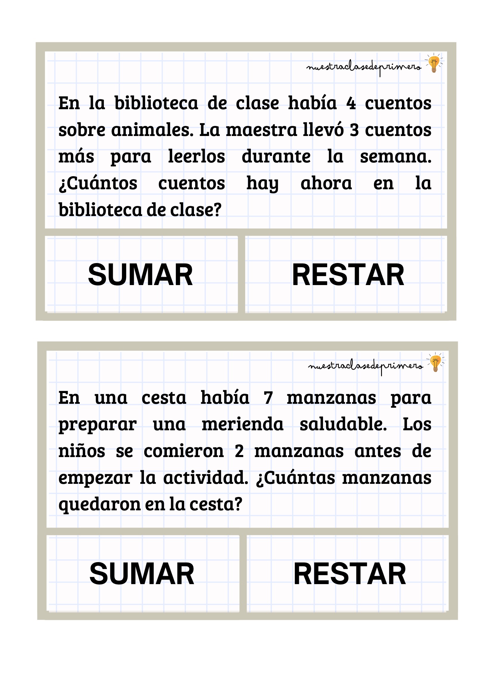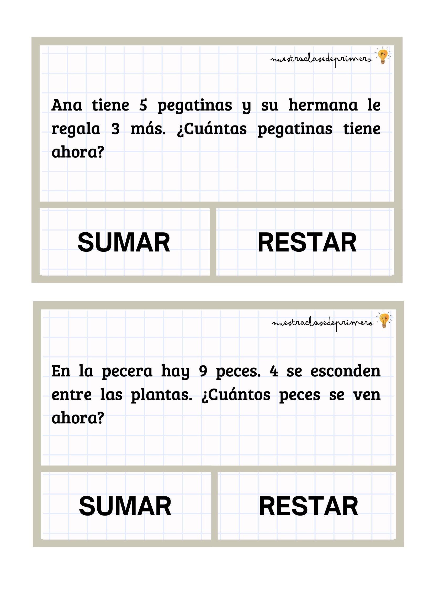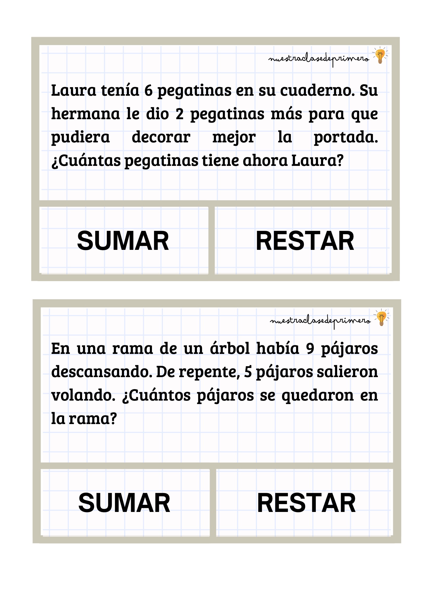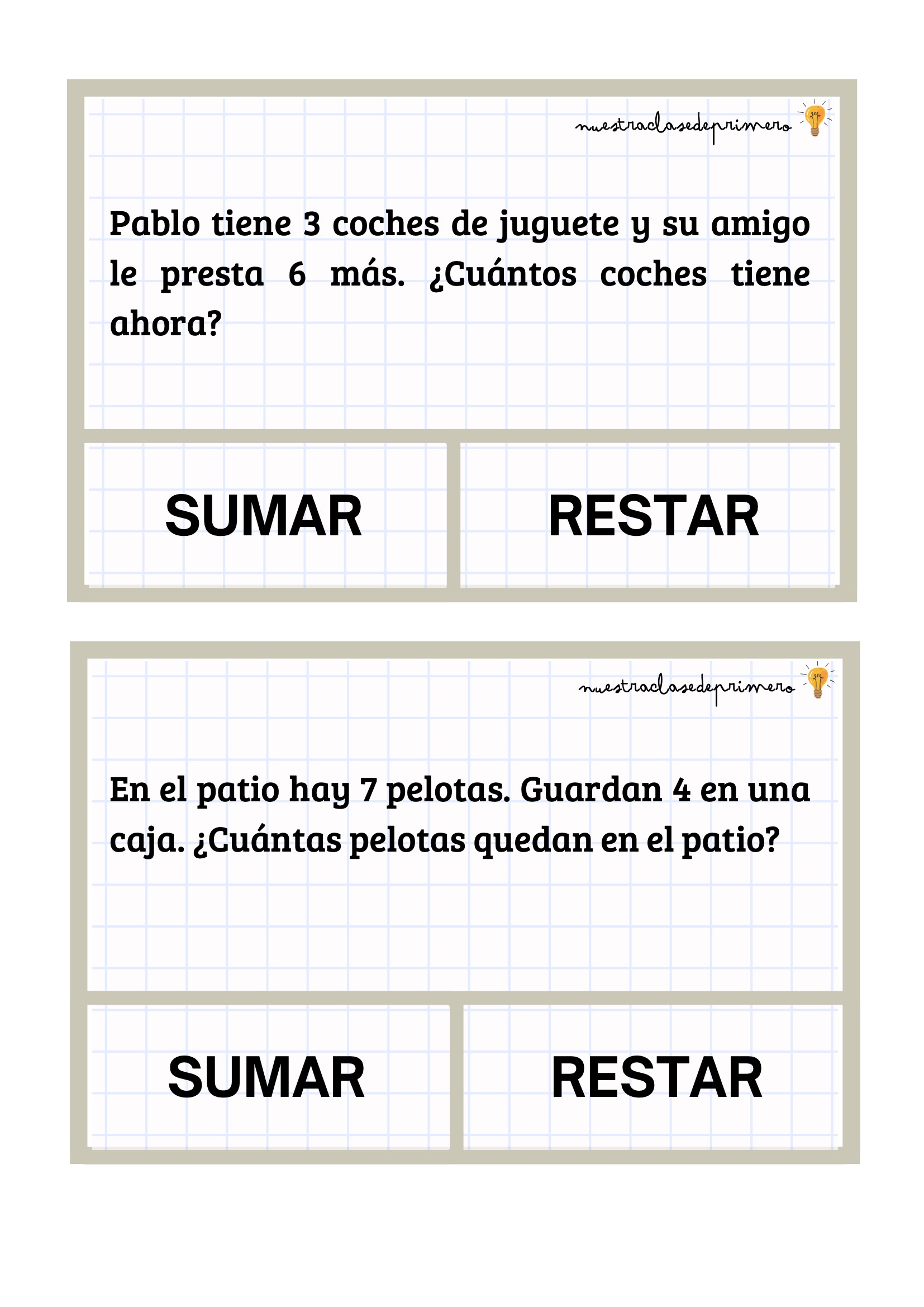 Los problemas que presentamos están diseñados con un formato claro y atractivo: cada enunciado incluye dos botones —SUMAR o RESTAR— para que el alumnado pueda decidir qué operación corresponde antes de resolverla. Esta pequeña decisión favorece la comprensión lectora, el pensamiento lógico y la autonomía.