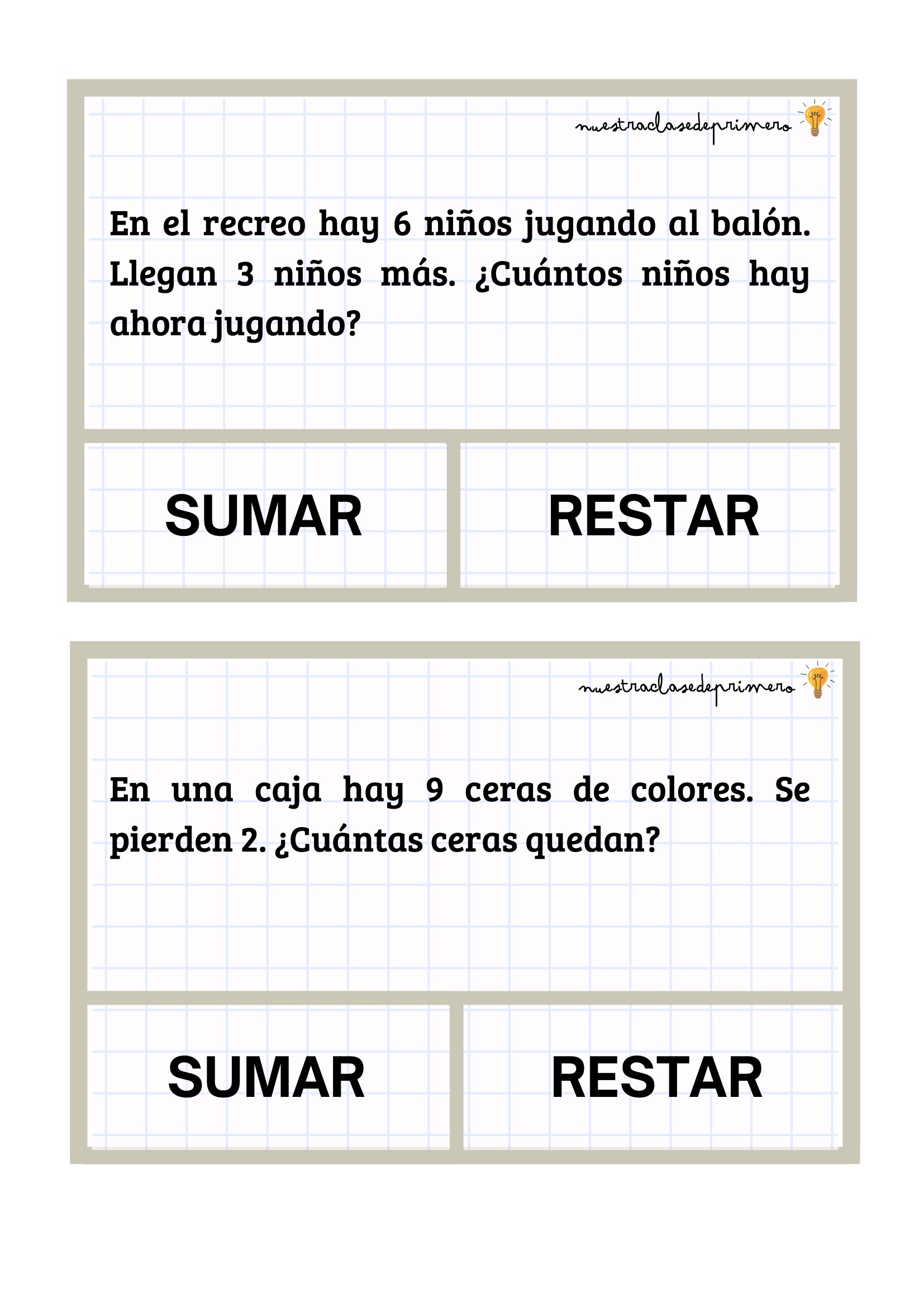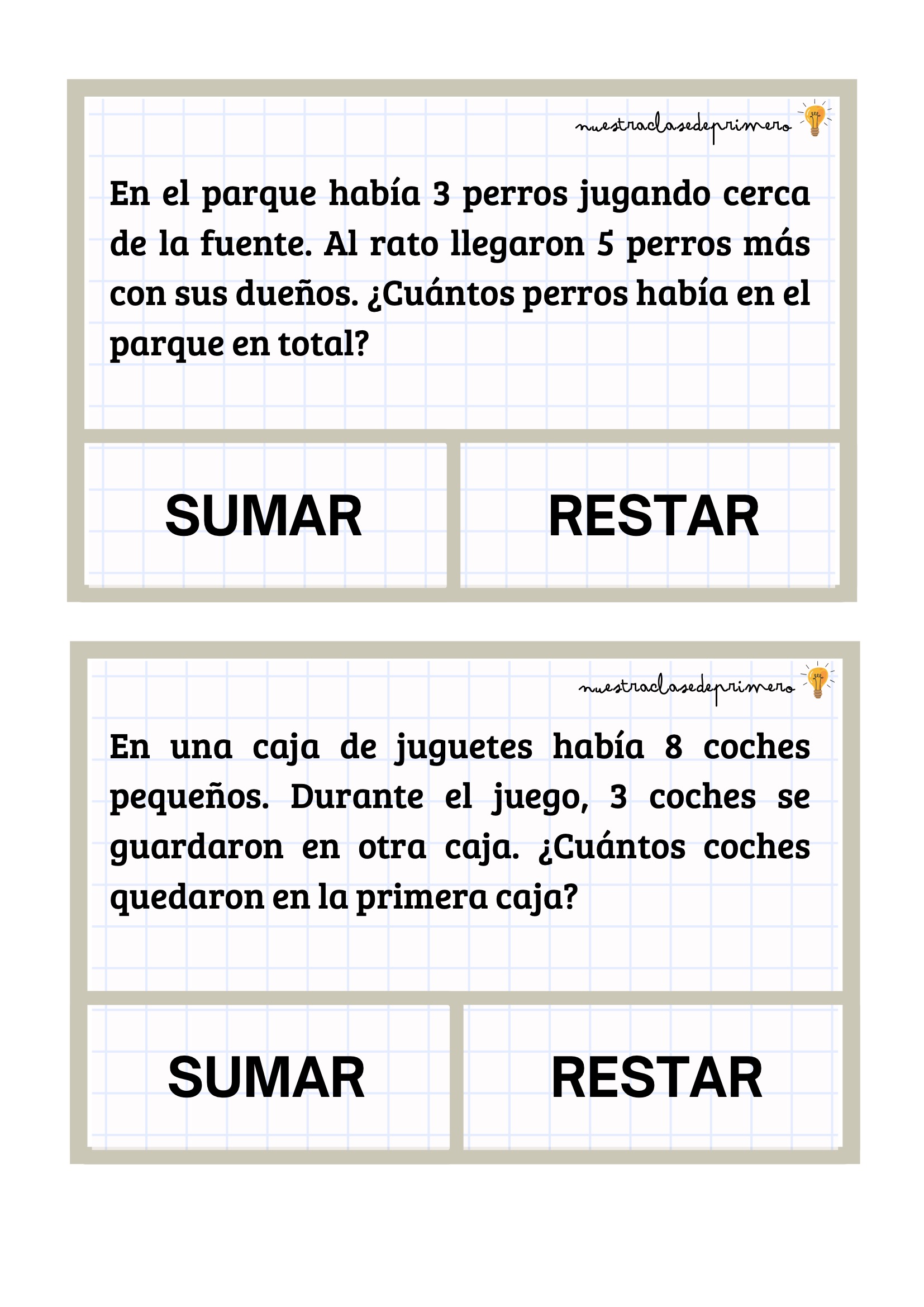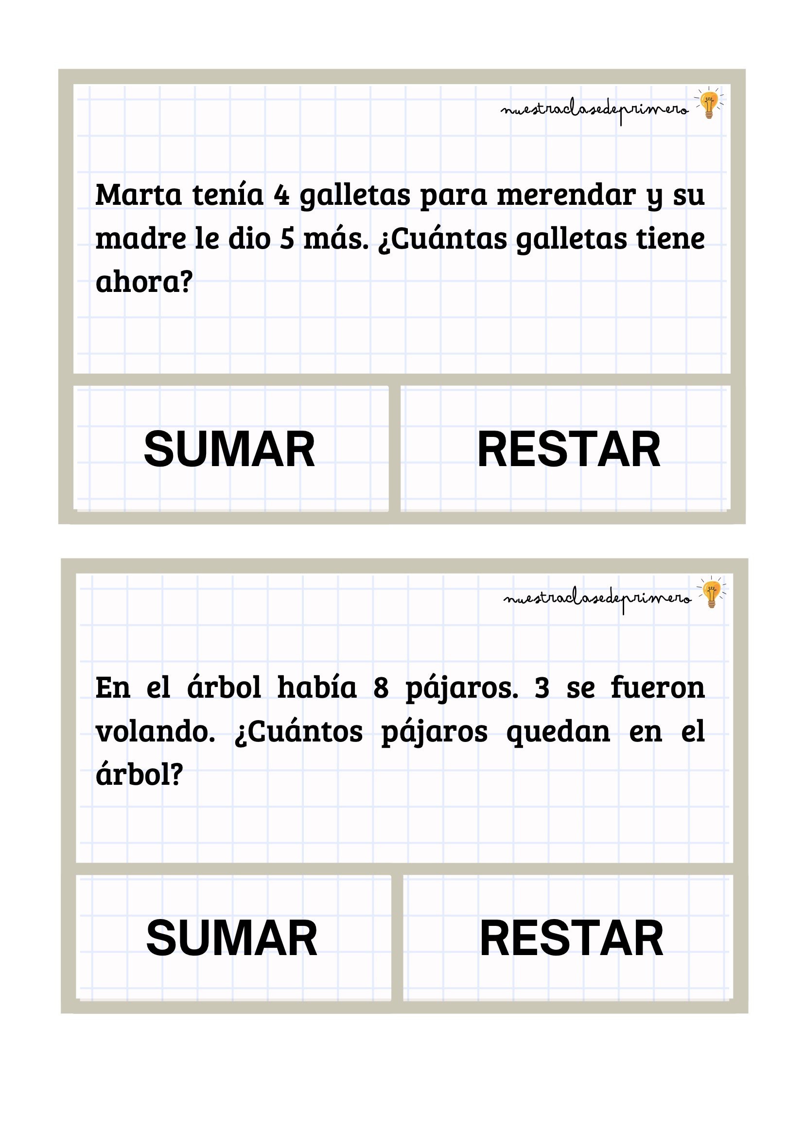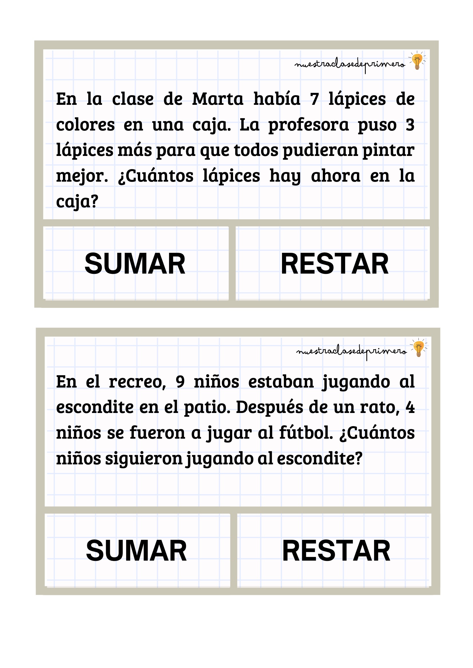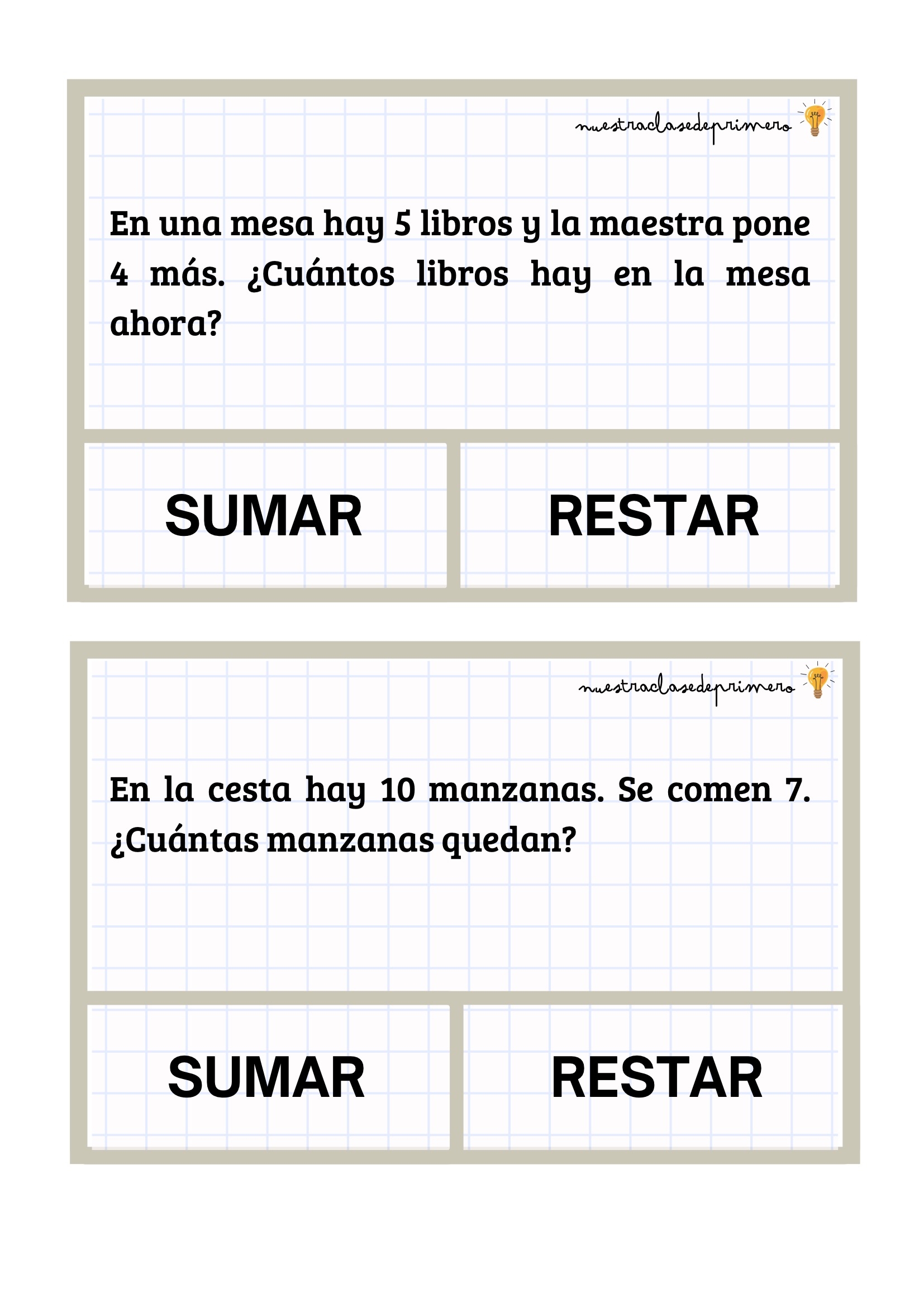Los problemas que presentamos están diseñados con un formato claro y atractivo: cada enunciado incluye dos botones —SUMAR o RESTAR— para que el alumnado pueda decidir qué operación corresponde antes de resolverla. Esta pequeña decisión favorece la comprensión lectora, el pensamiento lógico y la autonomía.