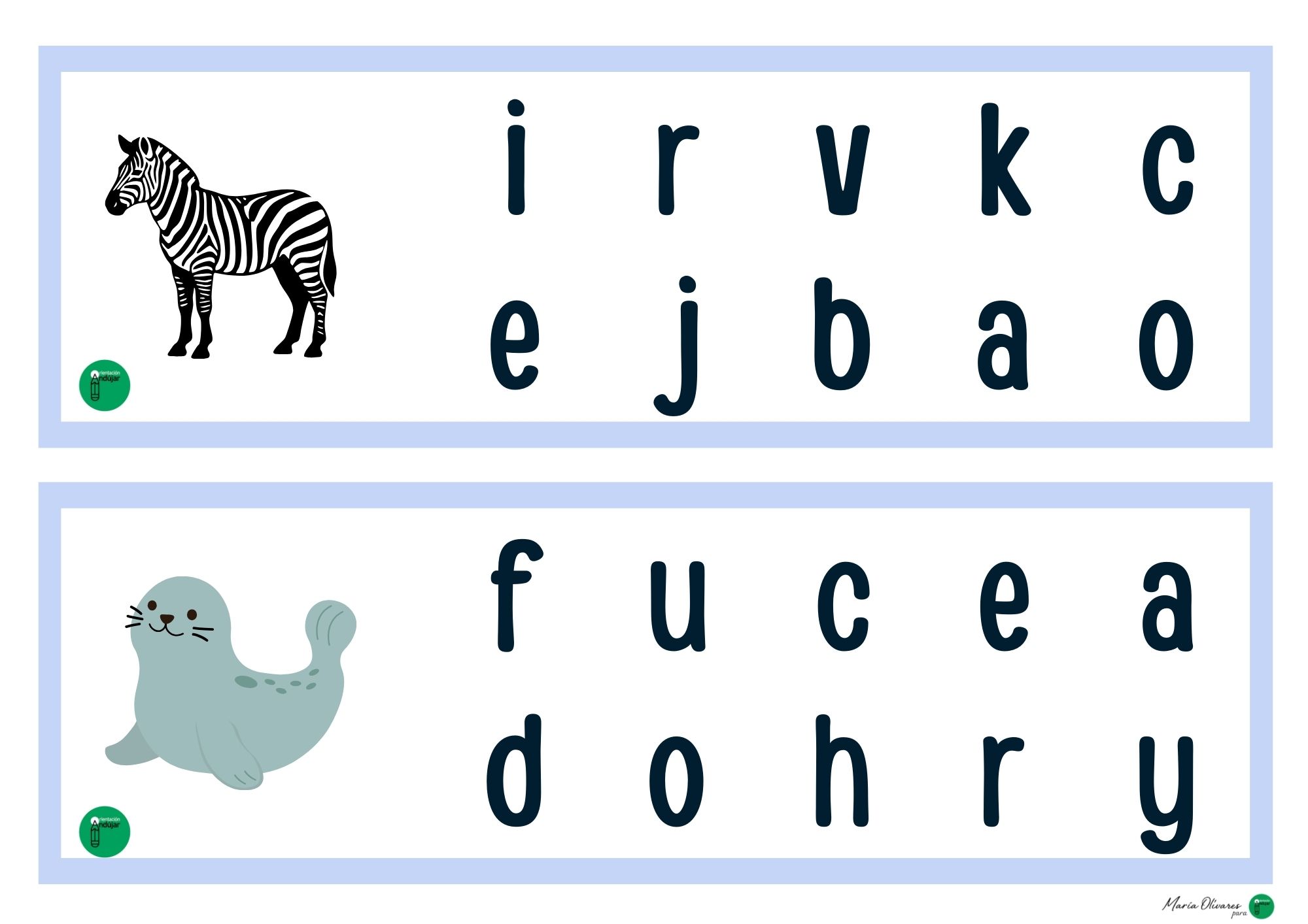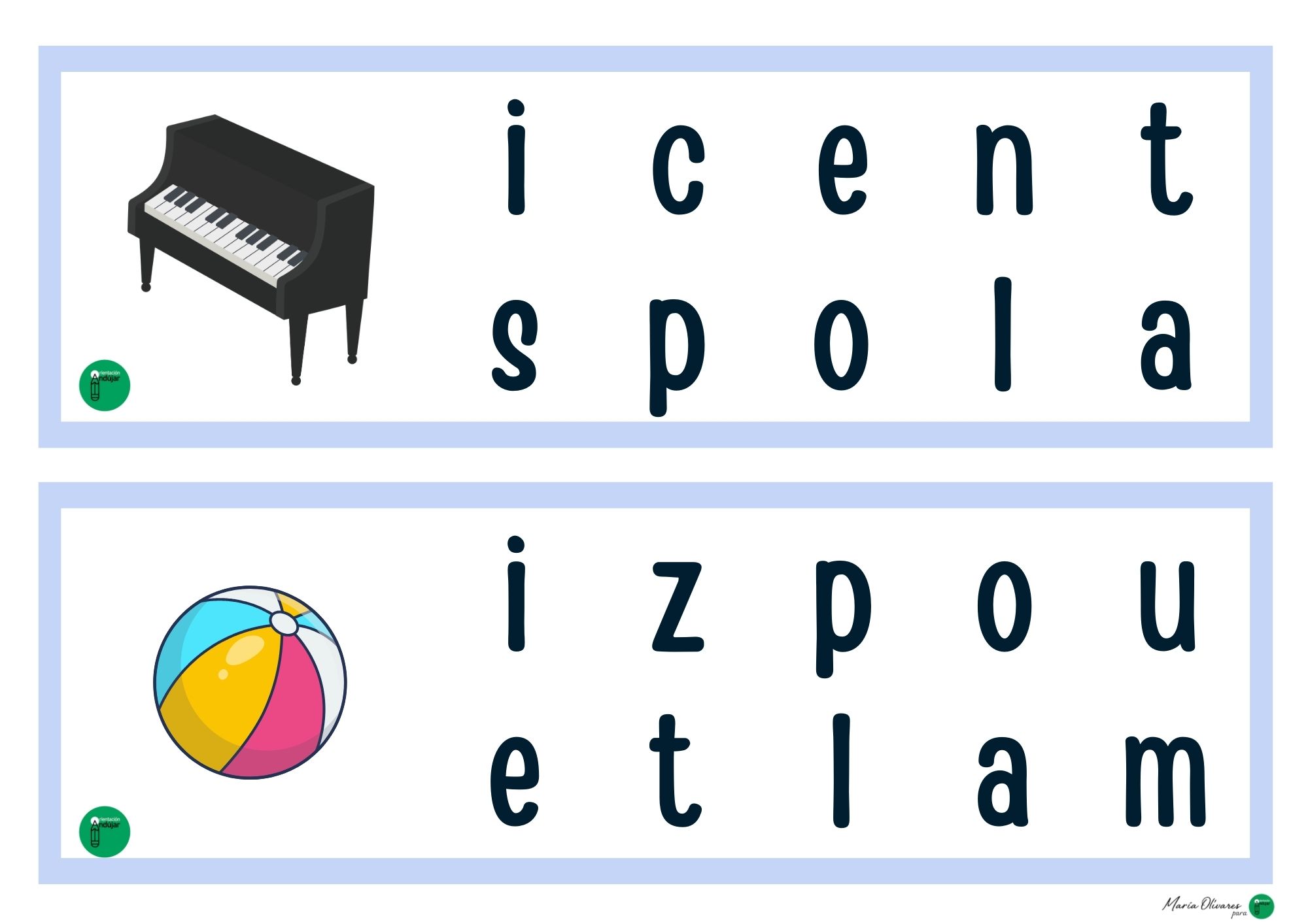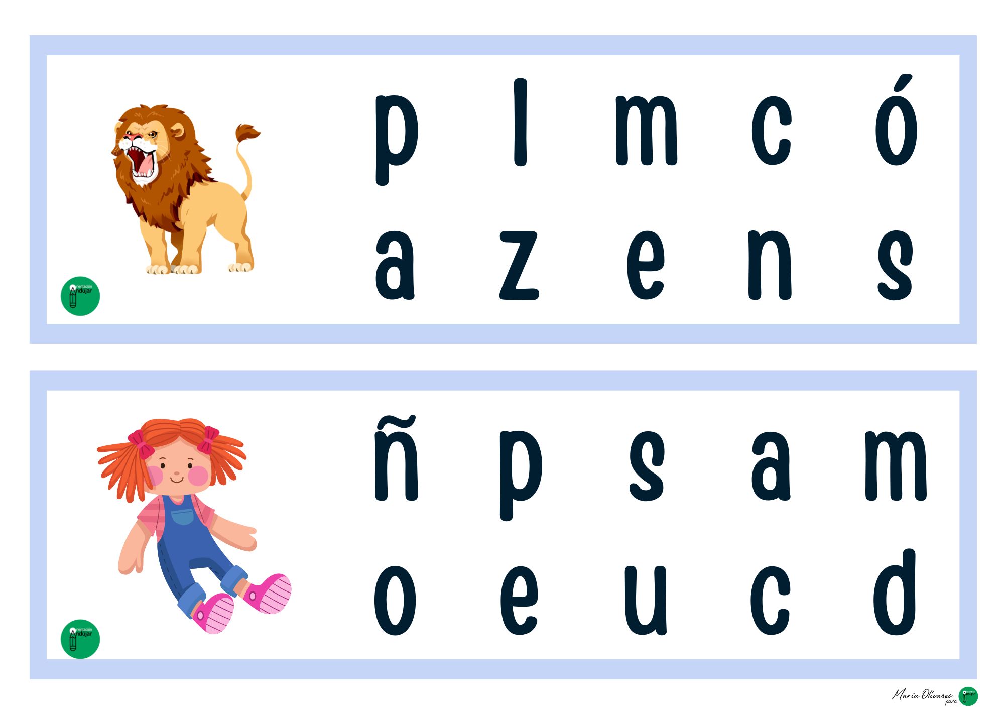 Si buscáis una forma divertida de trabajar la lectoescritura más allá de la típica caligrafía, este material es para vosotros. Cada tarjeta presenta una ilustración acompañada de una colección de letras desordenadas. El objetivo es sencillo pero potente: identificar, señalar (o marcar) solo las letras que forman el nombre del dibujo.