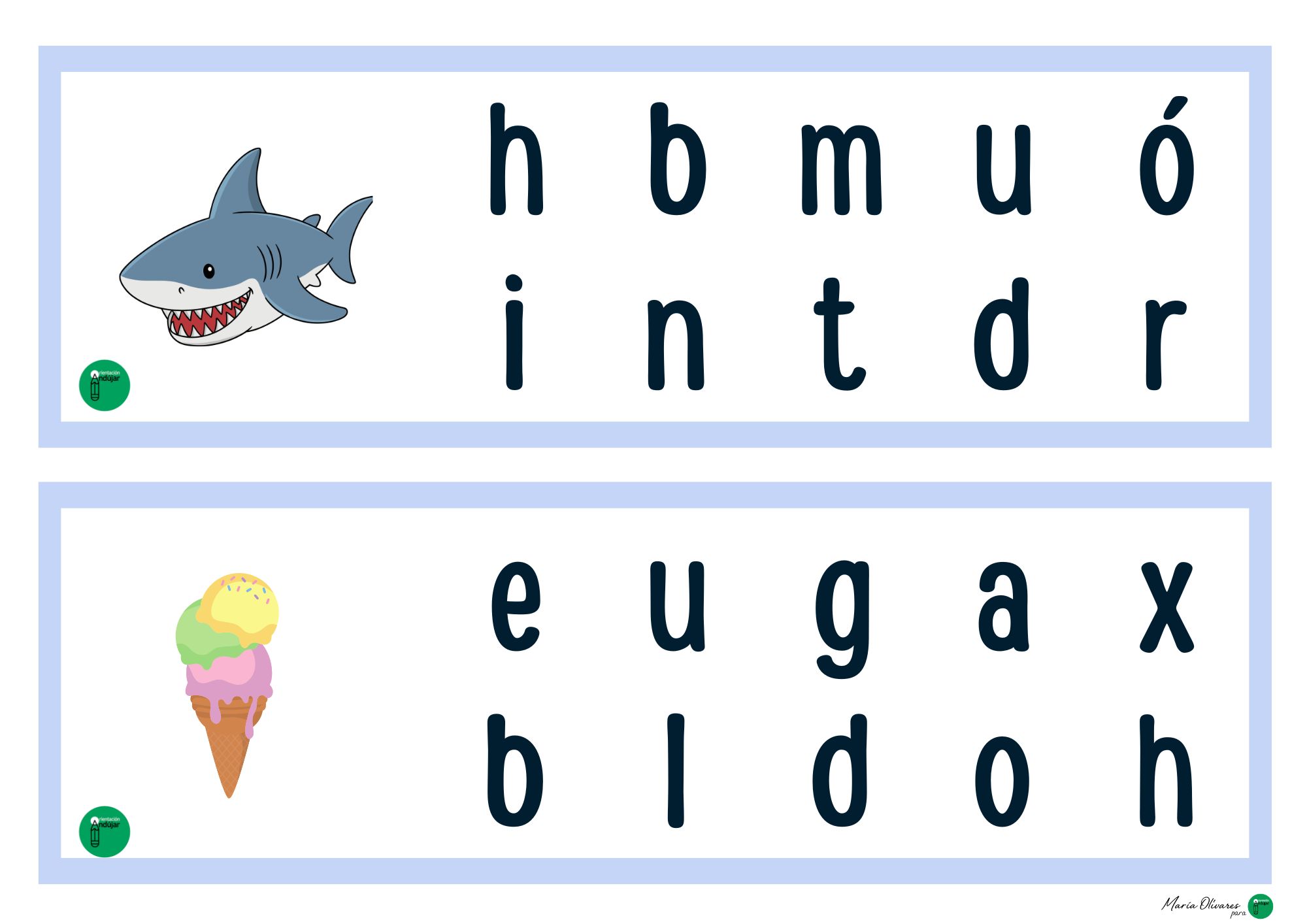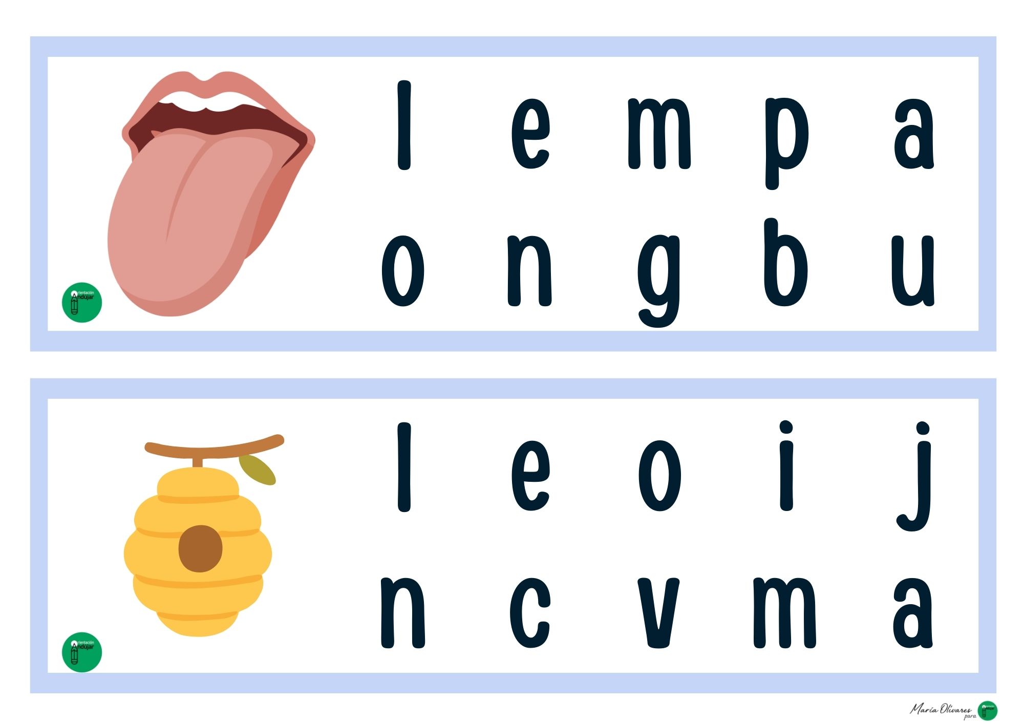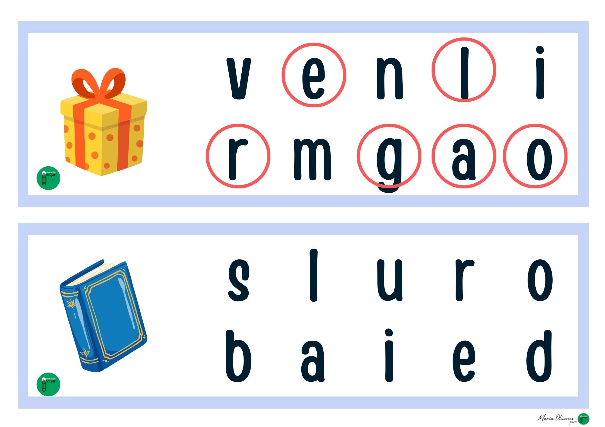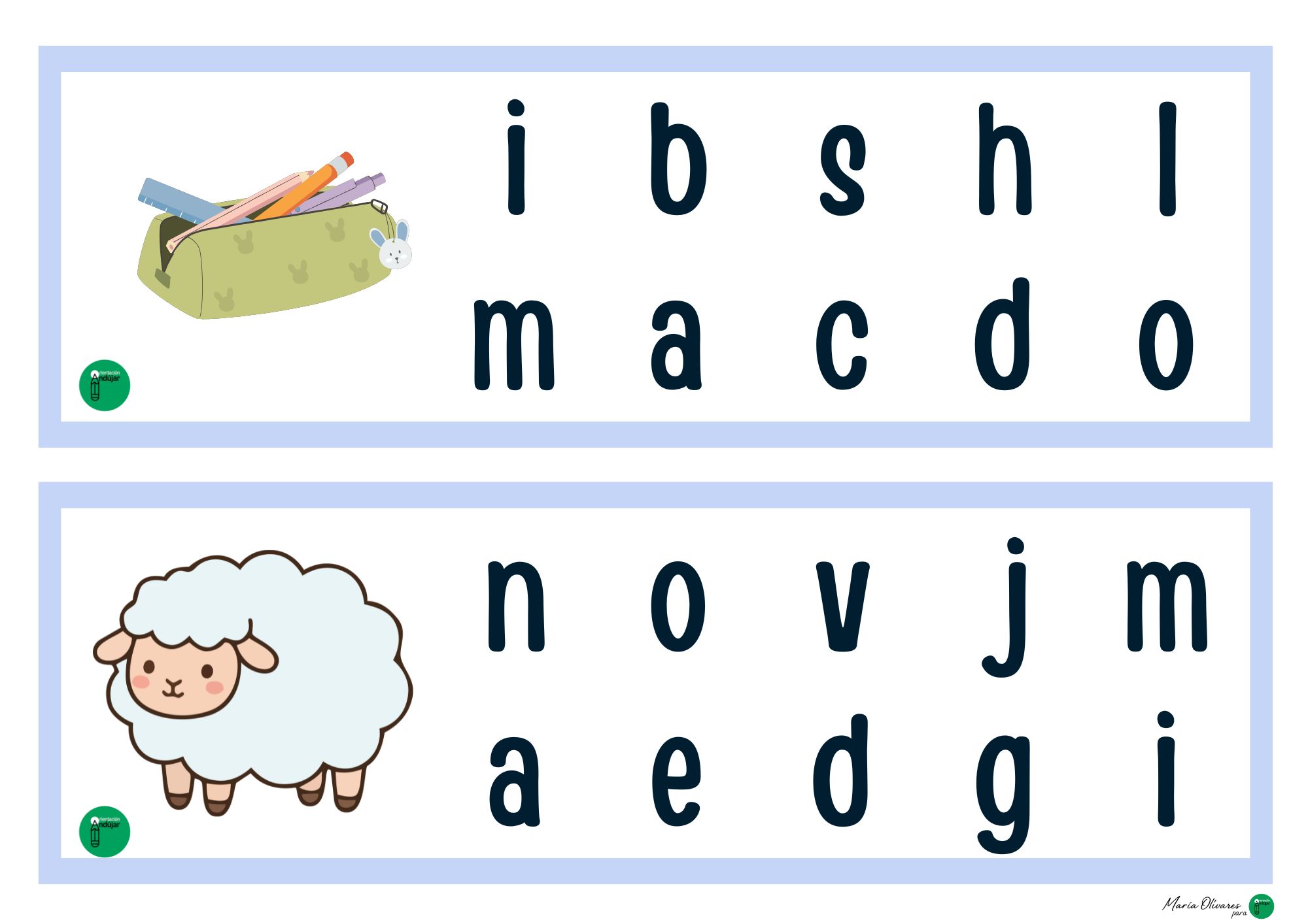 Si buscáis una forma divertida de trabajar la lectoescritura más allá de la típica caligrafía, este material es para vosotros. Cada tarjeta presenta una ilustración acompañada de una colección de letras desordenadas. El objetivo es sencillo pero potente: identificar, señalar (o marcar) solo las letras que forman el nombre del dibujo.
