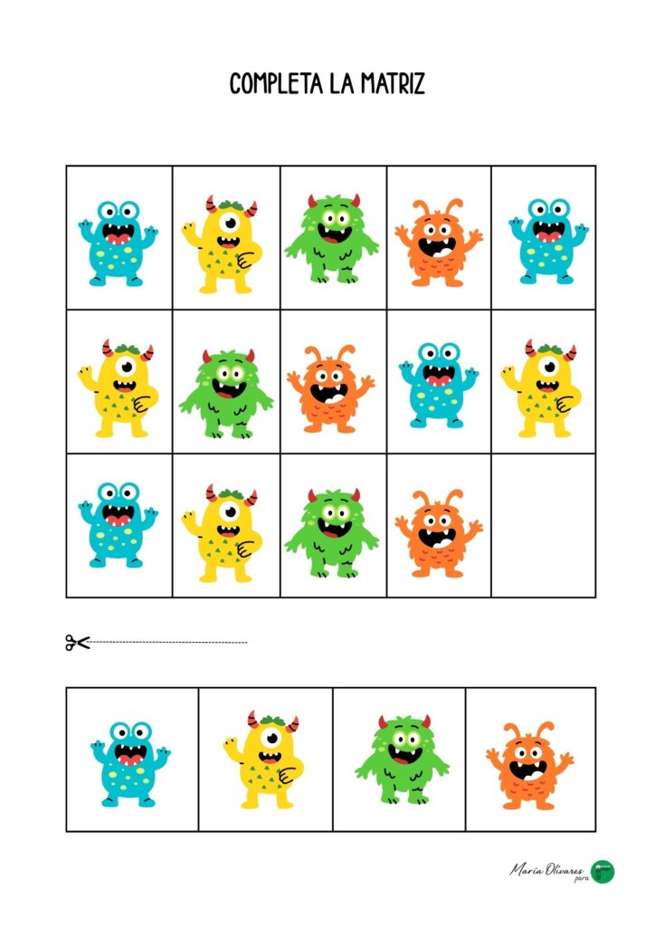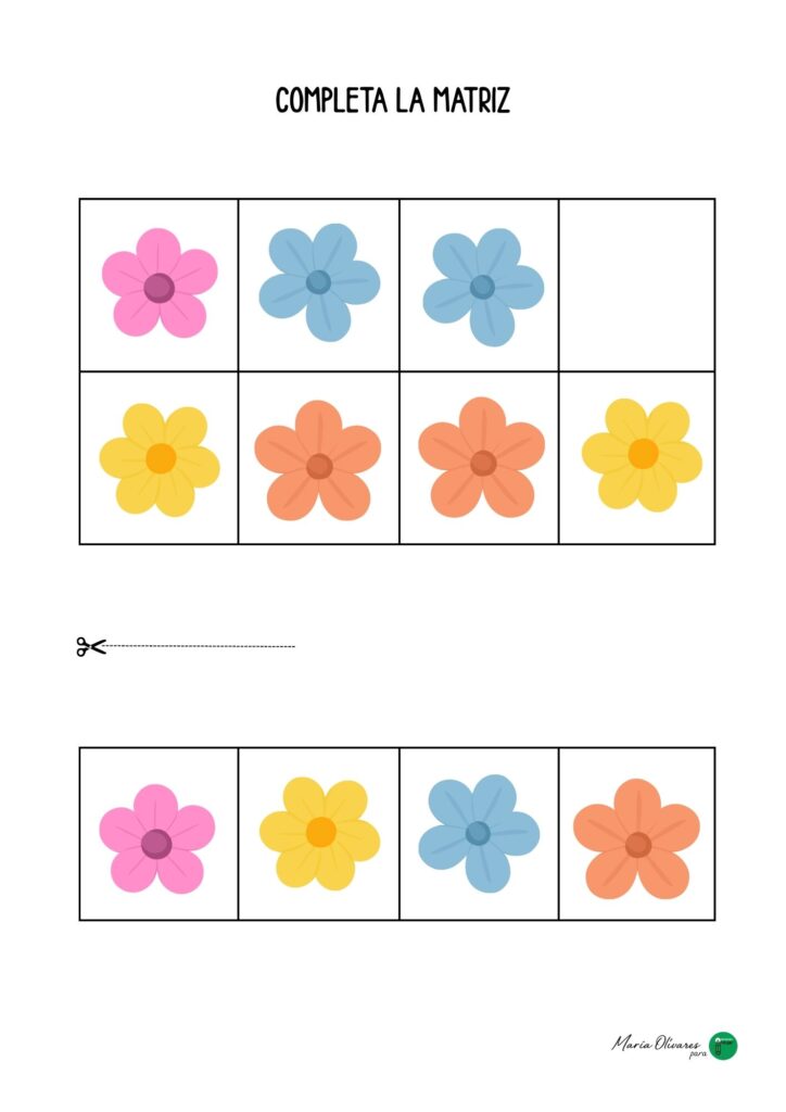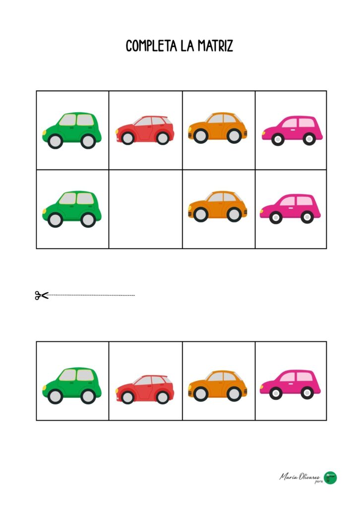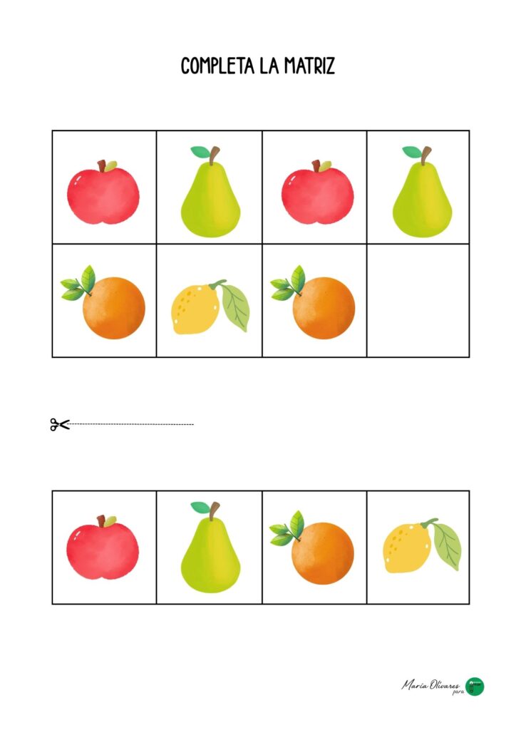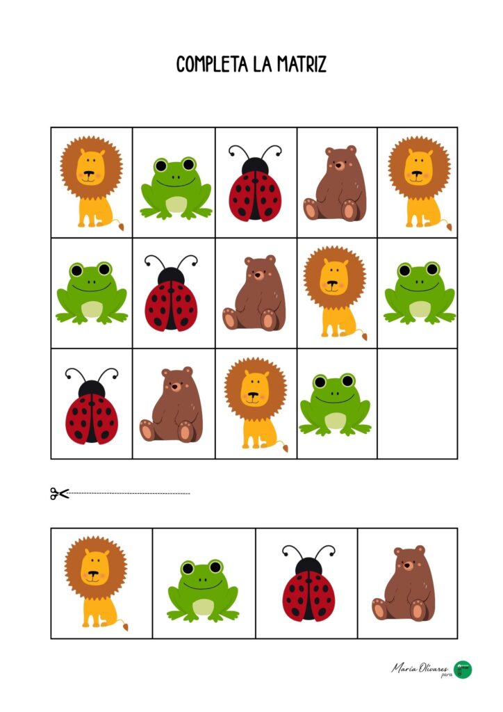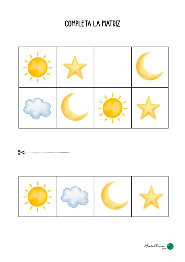 El entrenamiento de las funciones ejecutivas es una pieza clave en el desarrollo cognitivo durante la etapa escolar, y las matrices de figuras se presentan como una de las herramientas más potentes para lograrlo. Hoy compartimos una colección de matrices de imágenes diseñadas específicamente para trabajar la atención sostenida y el razonamiento lógico-matemático. En este recurso, el alumno se enfrenta a un cuadro donde falta una pieza y debe realizar un análisis exhaustivo del entorno para identificar cuál de las cuatro opciones propuestas es la que completa la secuencia de forma coherente, activando procesos mentales de comparación, deducción y exclusión.