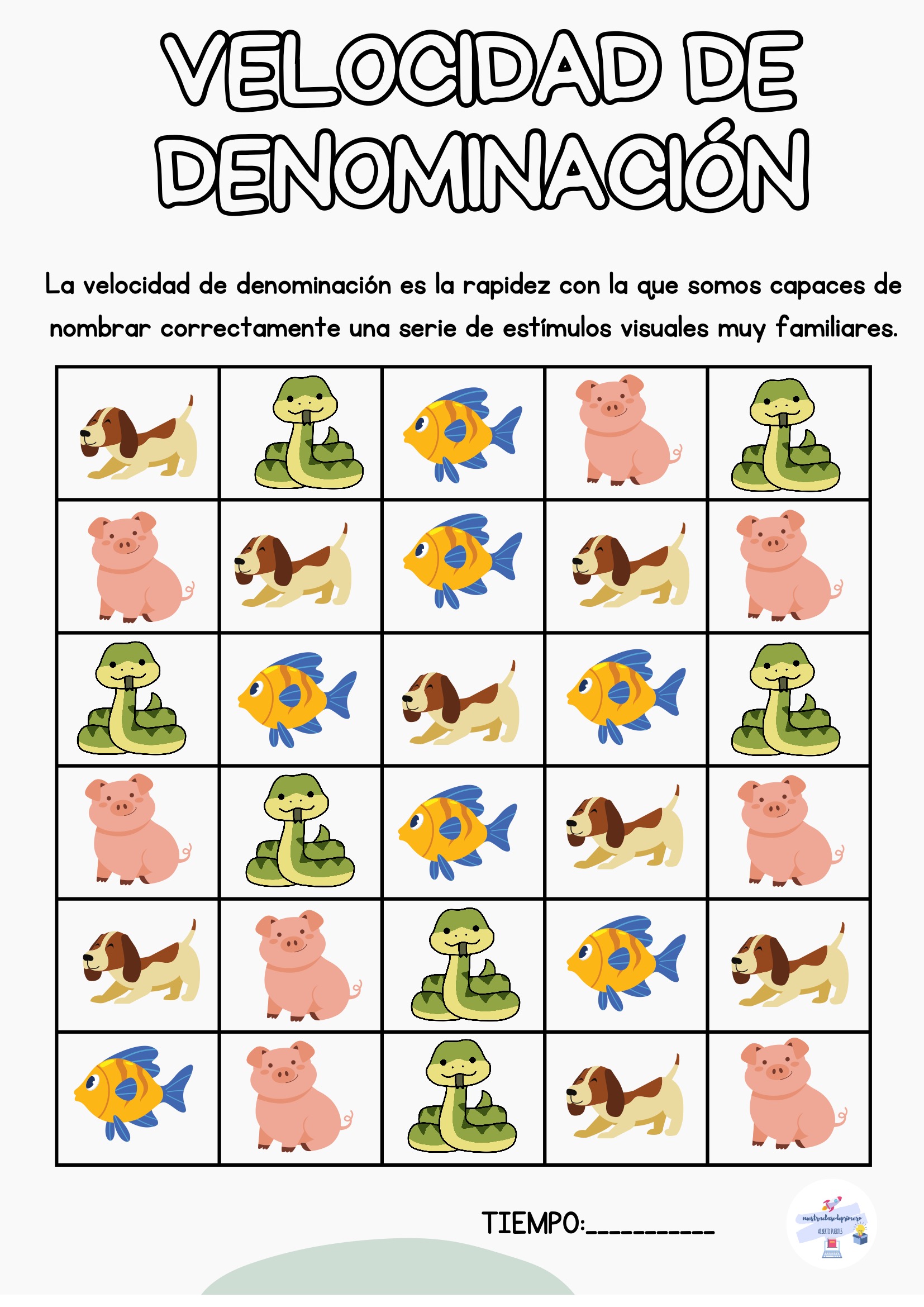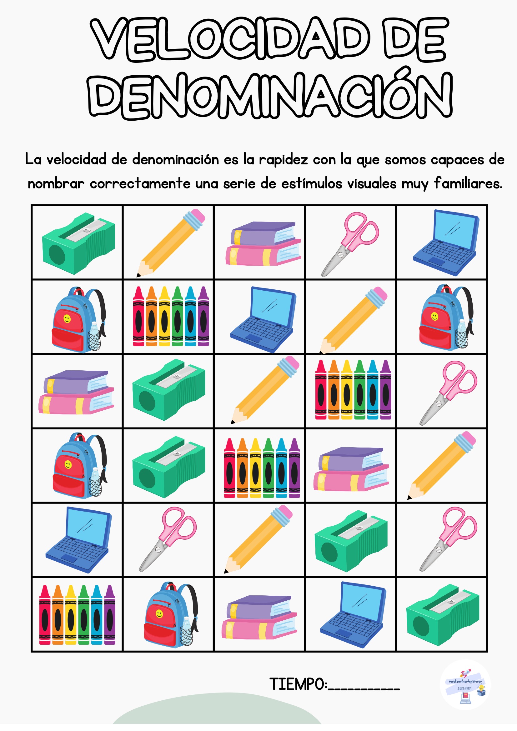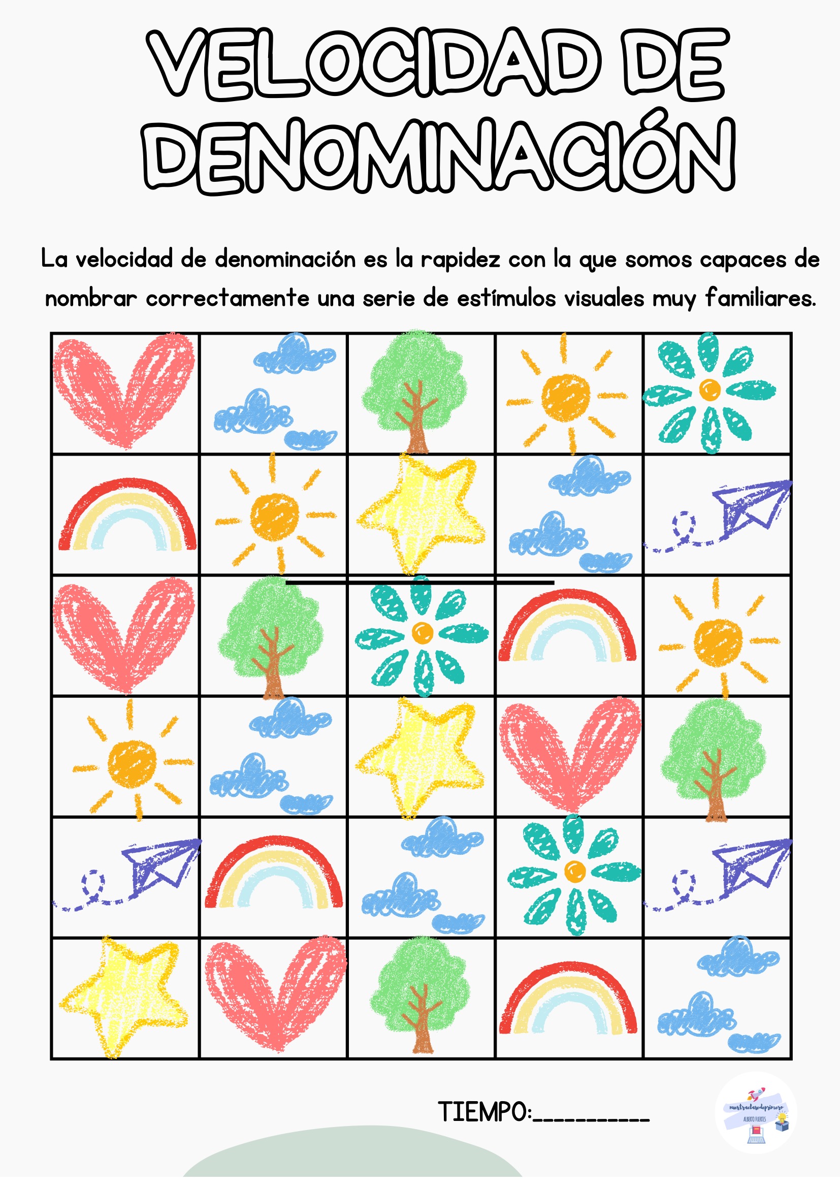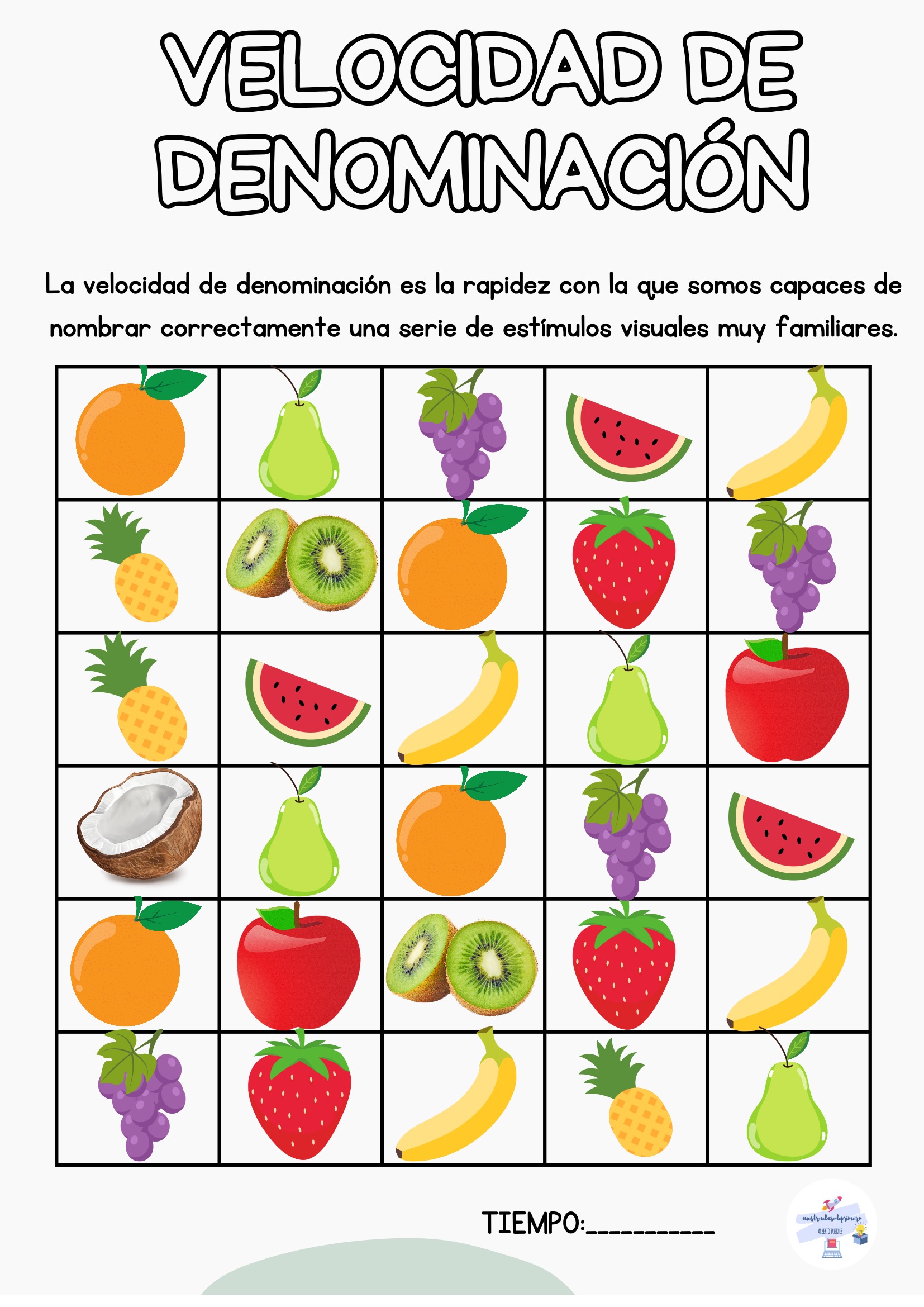 El alumno nombra todos los estímulos de la tabla mientras tú registras el tiempo. Puedes repetir la actividad varias veces a lo largo de la semana para observar mejoras.