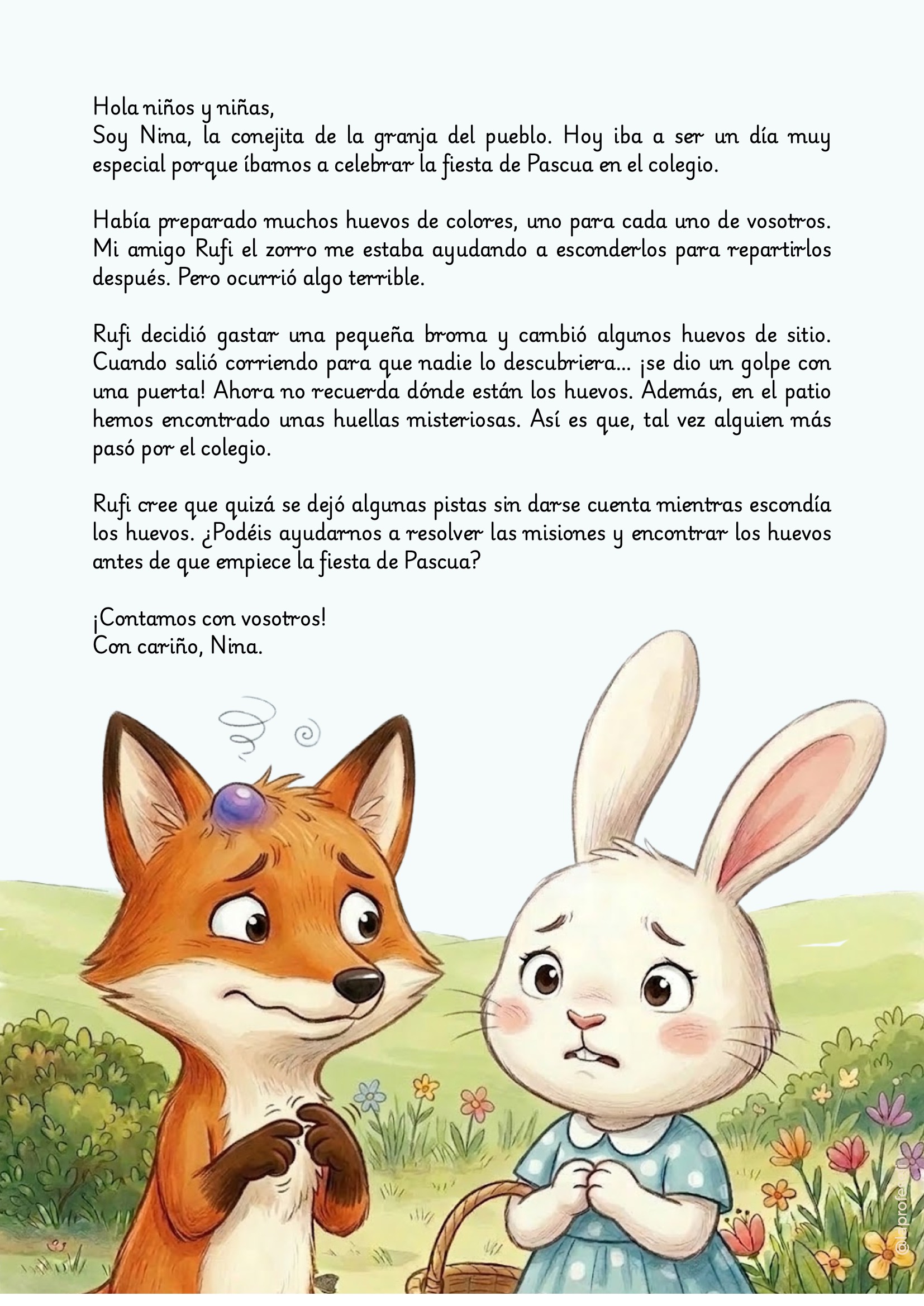 La aventura comienza cuando Nina, la conejita del colegio, descubre que los huevos de Pascua han desaparecido. Rufi, su amigo el zorro, intentó esconderlos… pero tras darse un golpe con una puerta, ¡ha olvidado dónde los dejó! Para complicarlo aún más, unas huellas misteriosas aparecen en el patio. ¿Habrá alguien más involucrado?