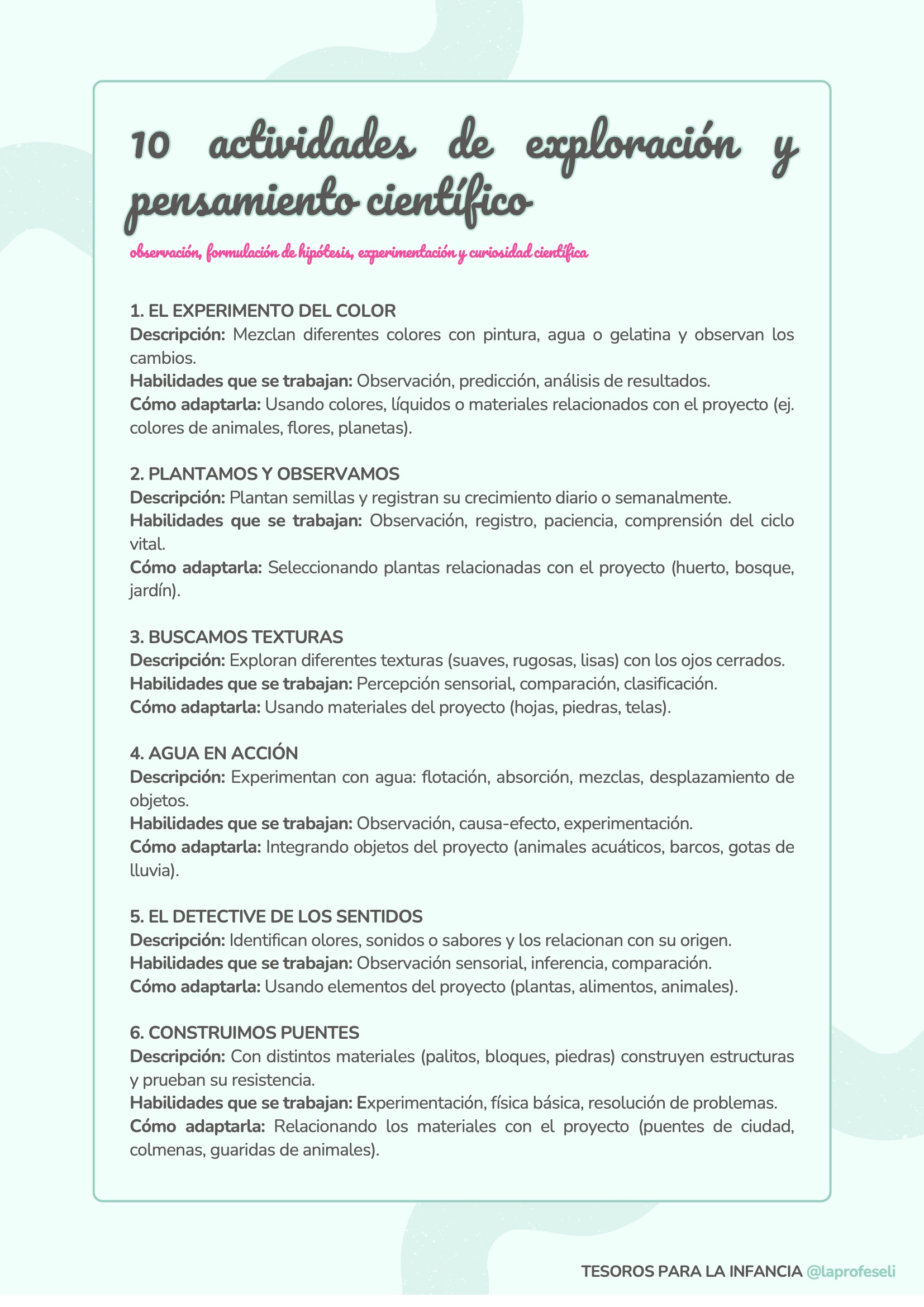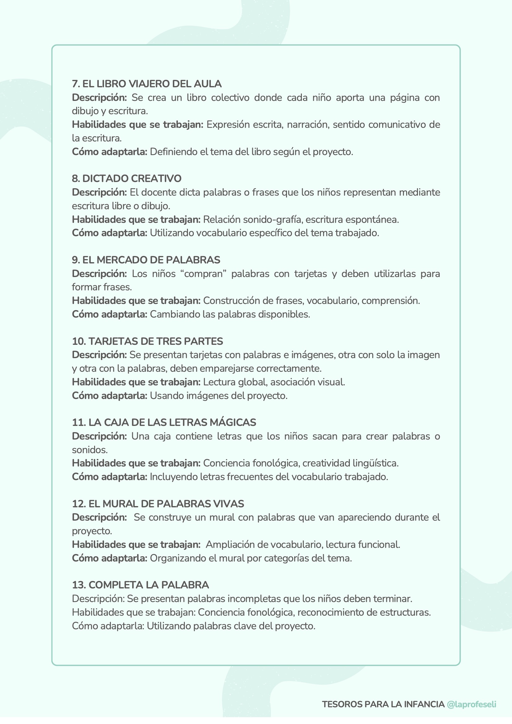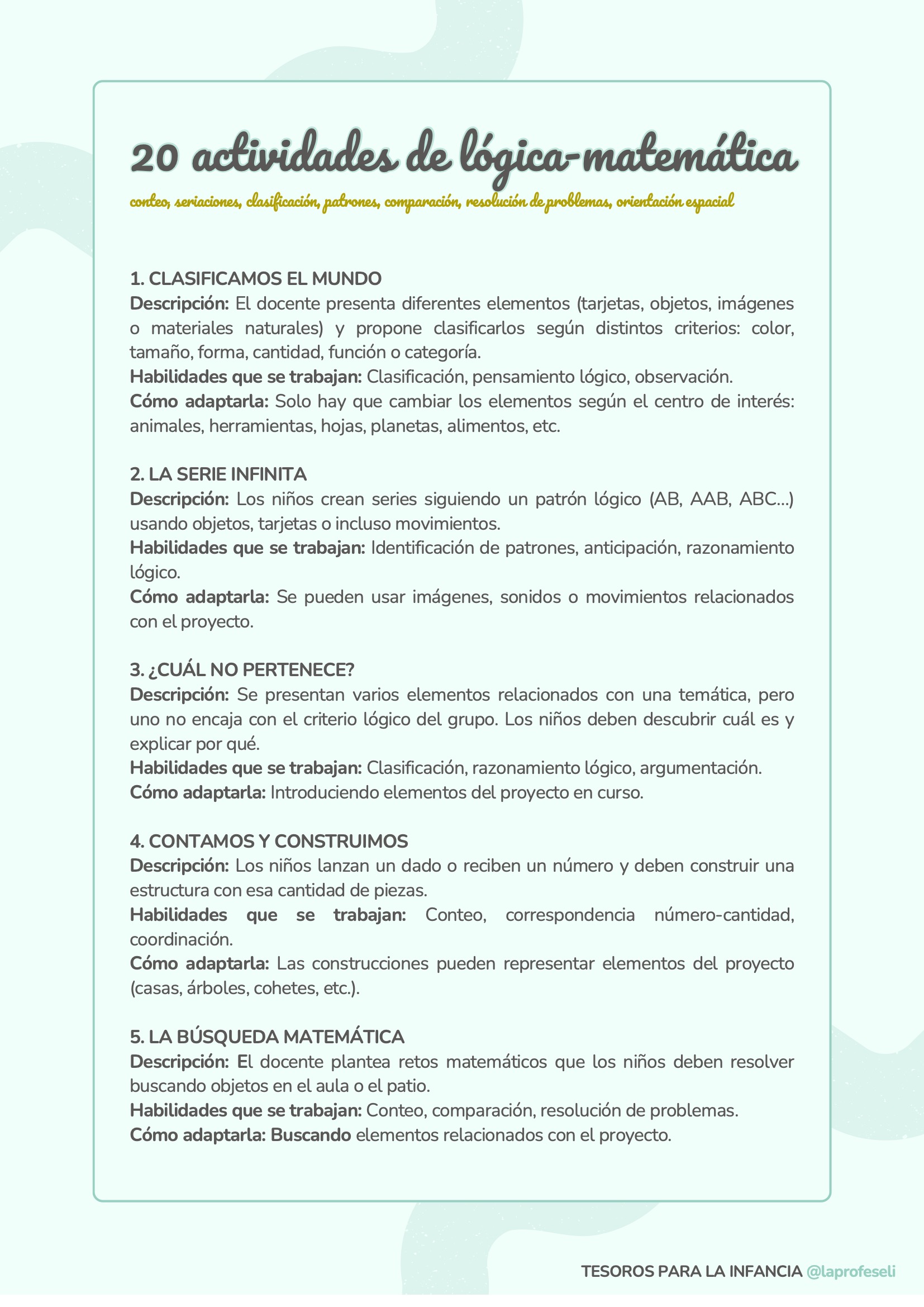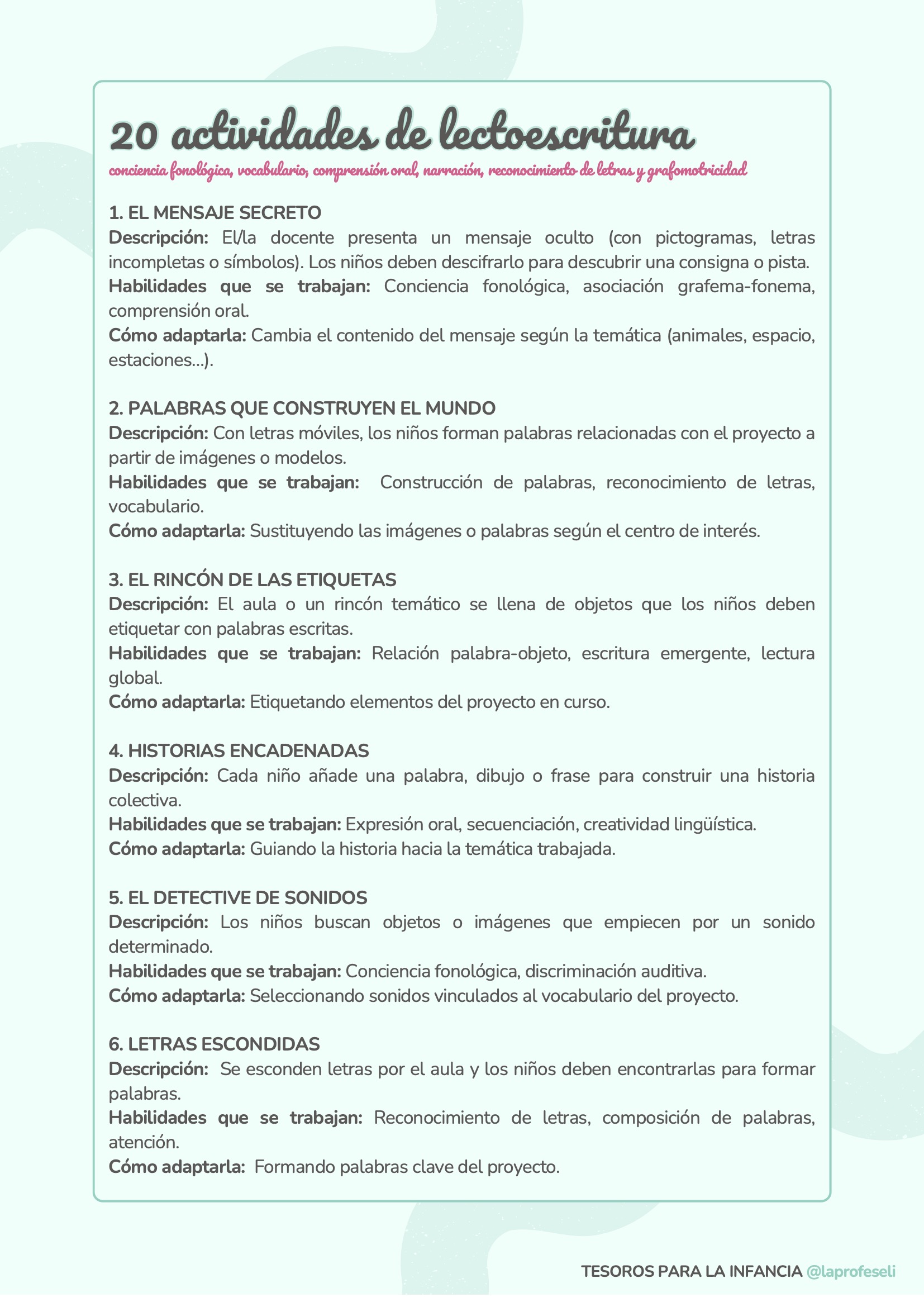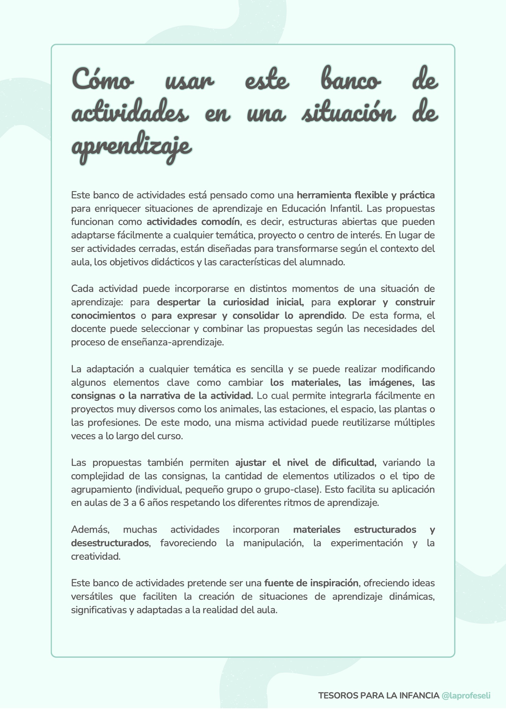 Un banco de actividades diseñado para acompañarte en cualquier situación de aprendizaje, independientemente de la temática o del momento del aula. Esta recopilación incluye 120 propuestas organizadas por habilidades clave como son: lectoescritura, lógica-matemática, arte, música y ritmo, expresión corporal, dramatización, psicomotricidad, exploración y pensamiento científico y habilidades socioemocionales.