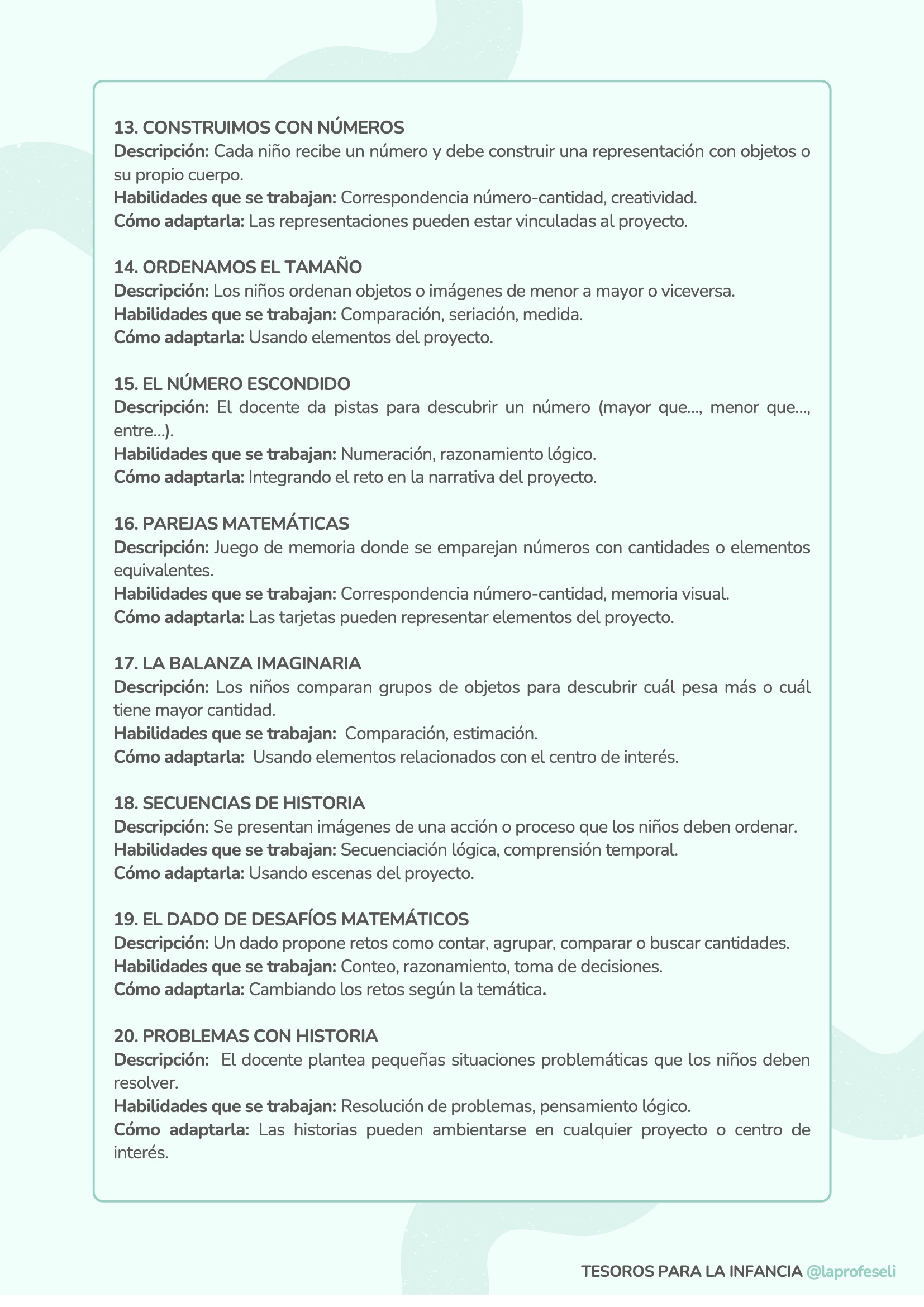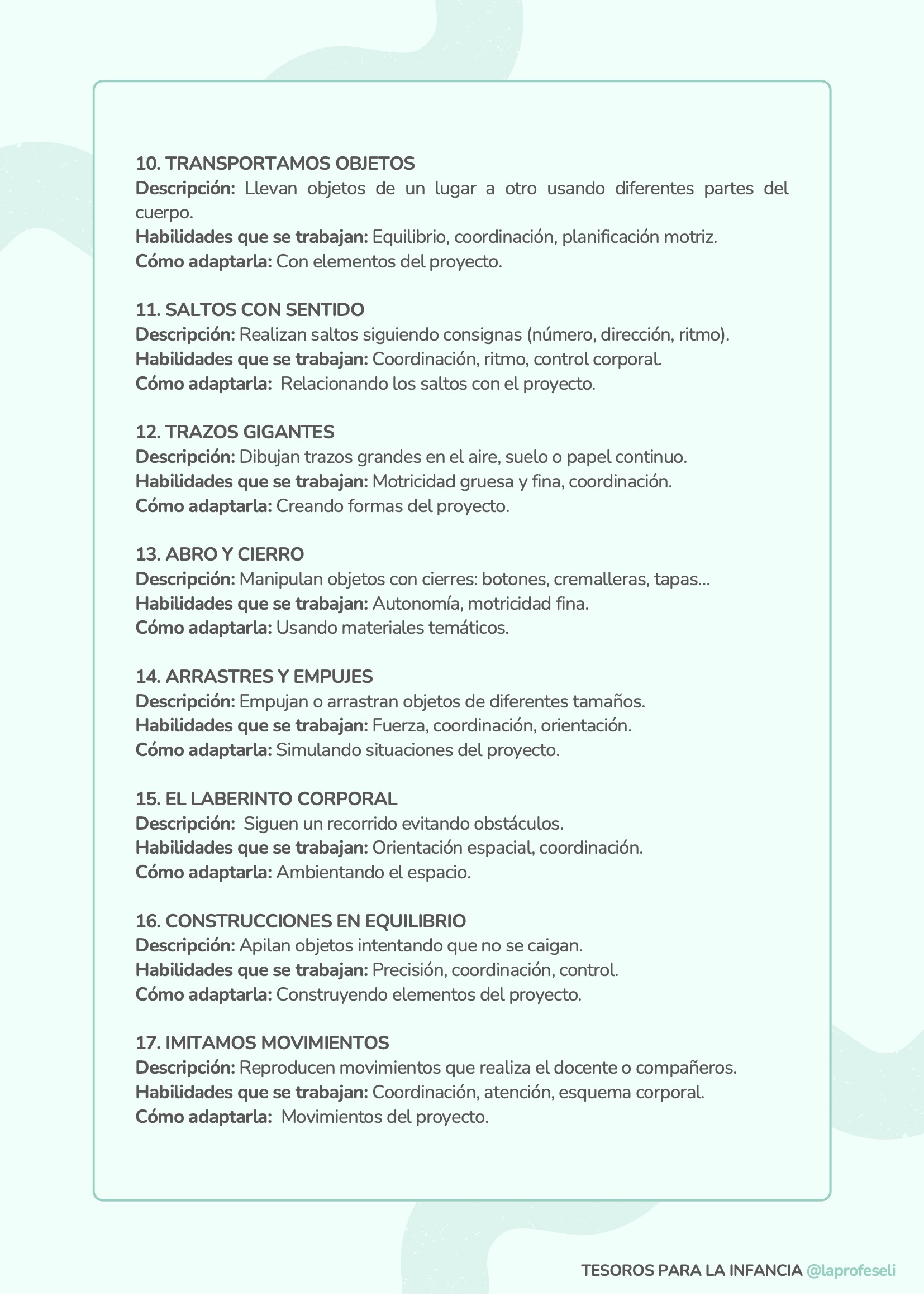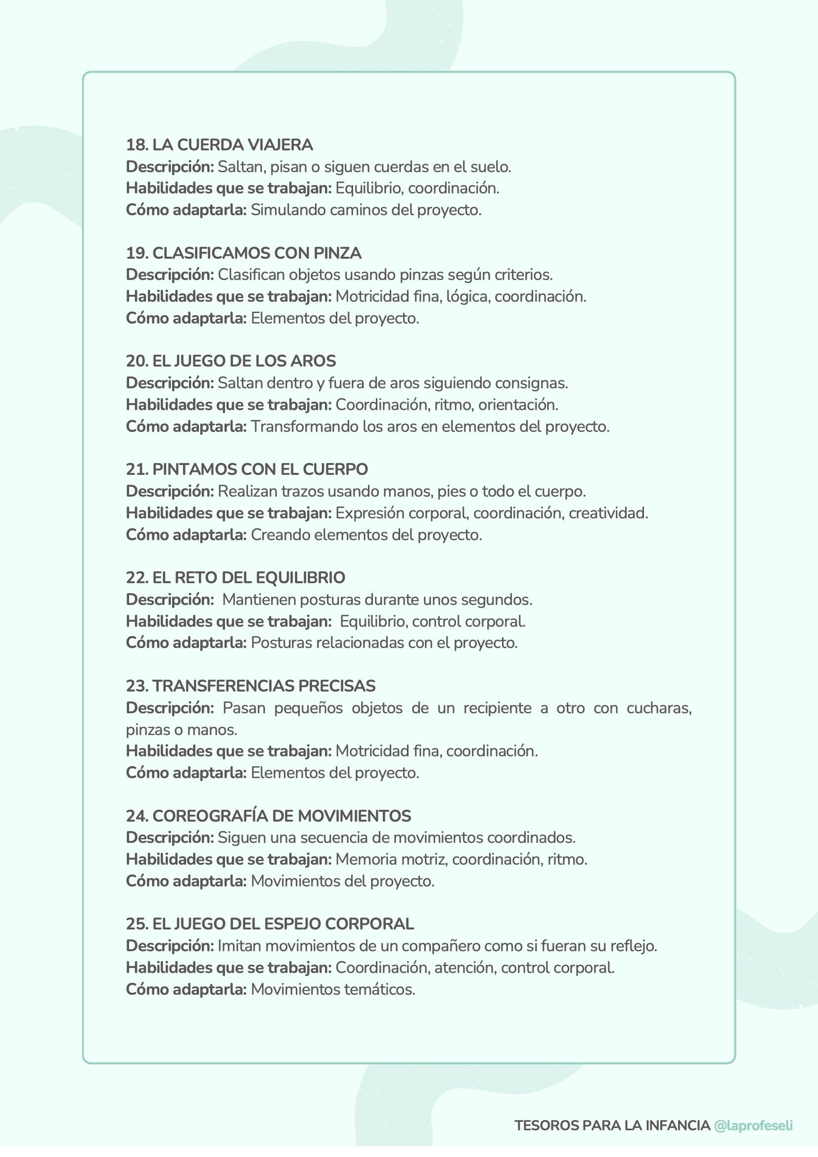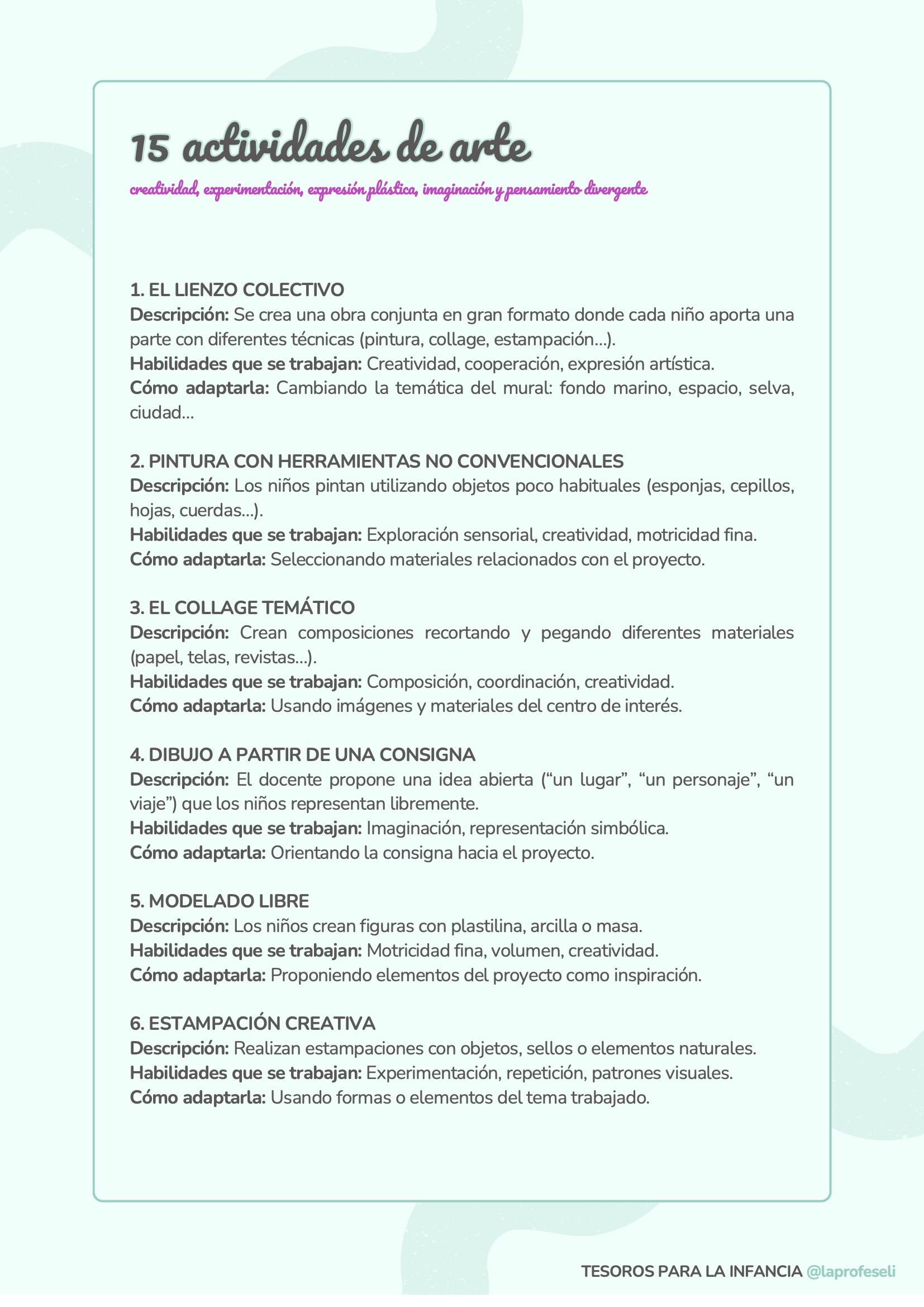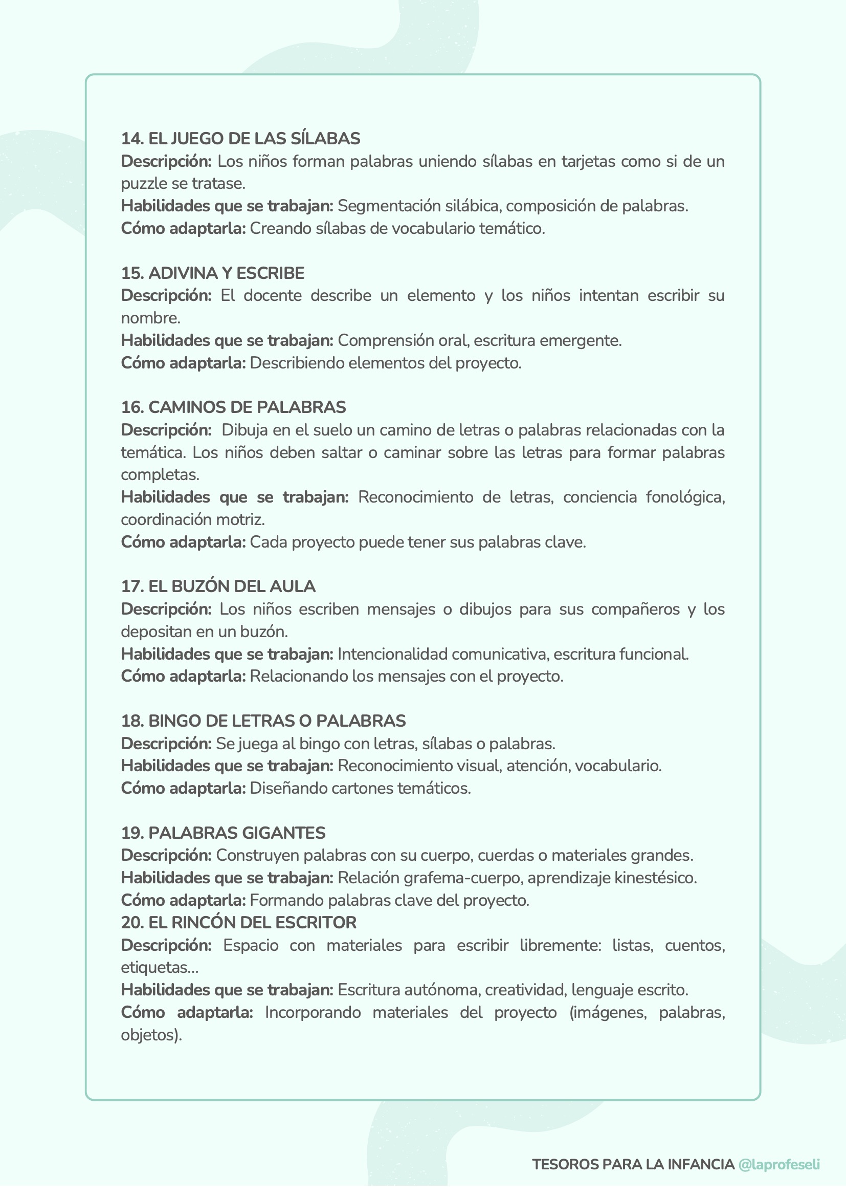 Un banco de actividades diseñado para acompañarte en cualquier situación de aprendizaje, independientemente de la temática o del momento del aula. Esta recopilación incluye 120 propuestas organizadas por habilidades clave como son: lectoescritura, lógica-matemática, arte, música y ritmo, expresión corporal, dramatización, psicomotricidad, exploración y pensamiento científico y habilidades socioemocionales.