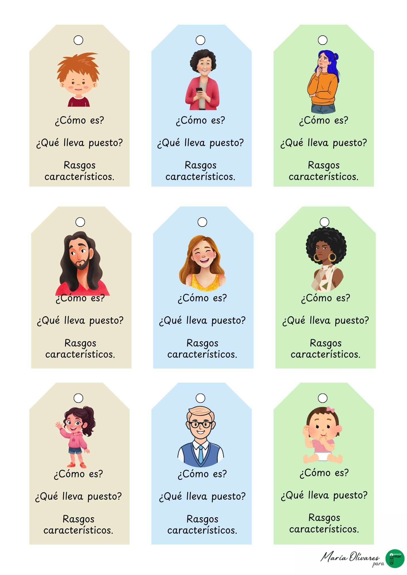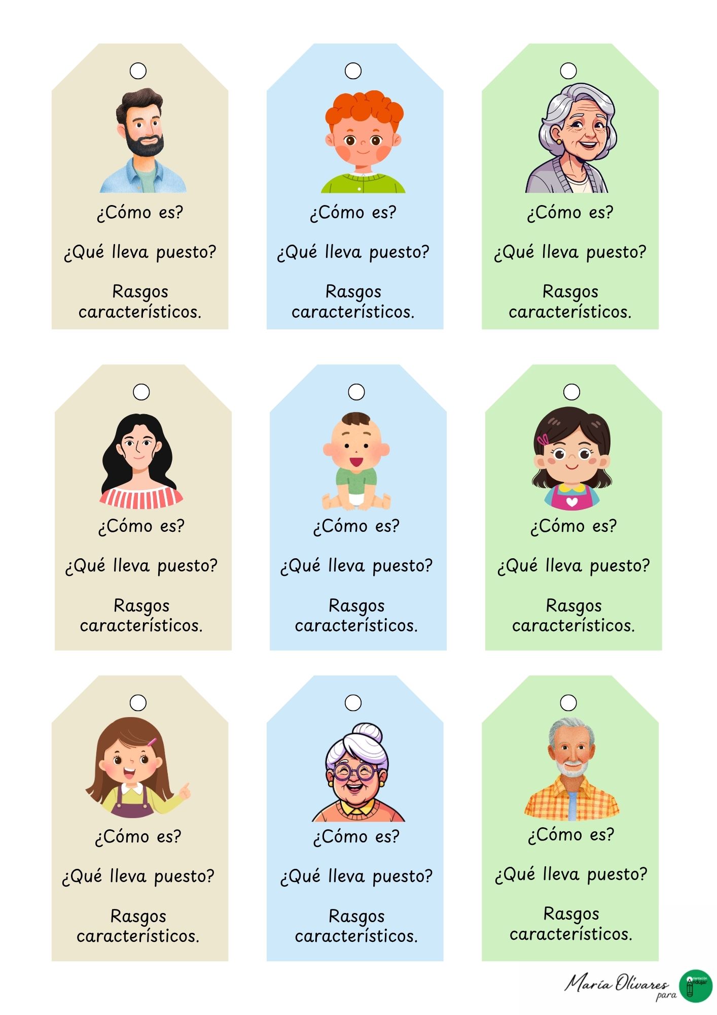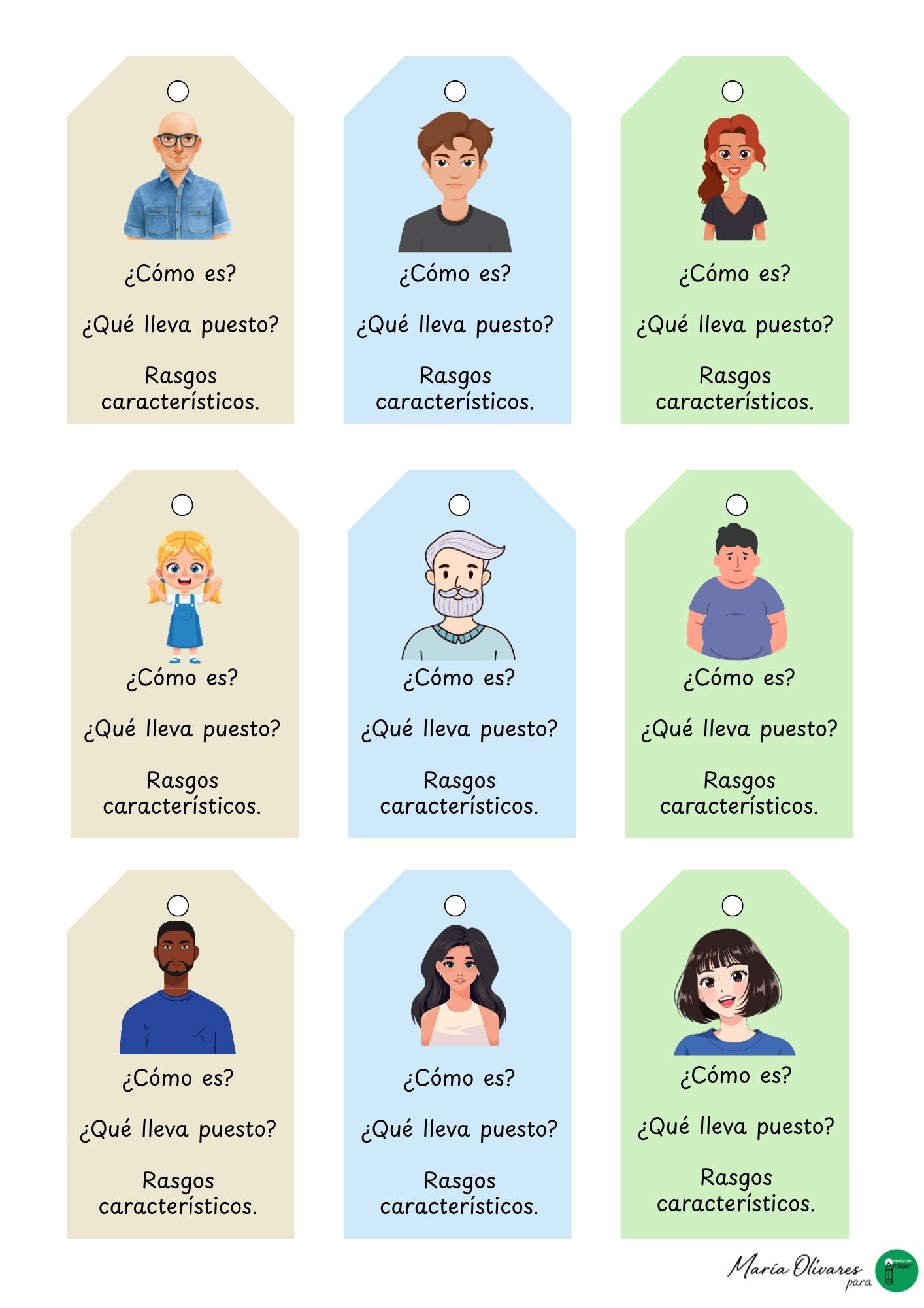 El recurso que os comparto hoy utiliza diferentes personajes como punto de partida para que los alumnos se conviertan en verdaderos observadores y narradores. A diferencia de los objetos, las personas nos permiten explorar una capa más profunda del lenguaje, ya que no solo describimos lo que vemos (colores, formas, tamaños), sino que empezamos a trabajar con conceptos abstractos, inferencias y estados emocionales. Es una oportunidad de oro para que el alumnado aprenda a estructurar frases más complejas y ricas en matices.