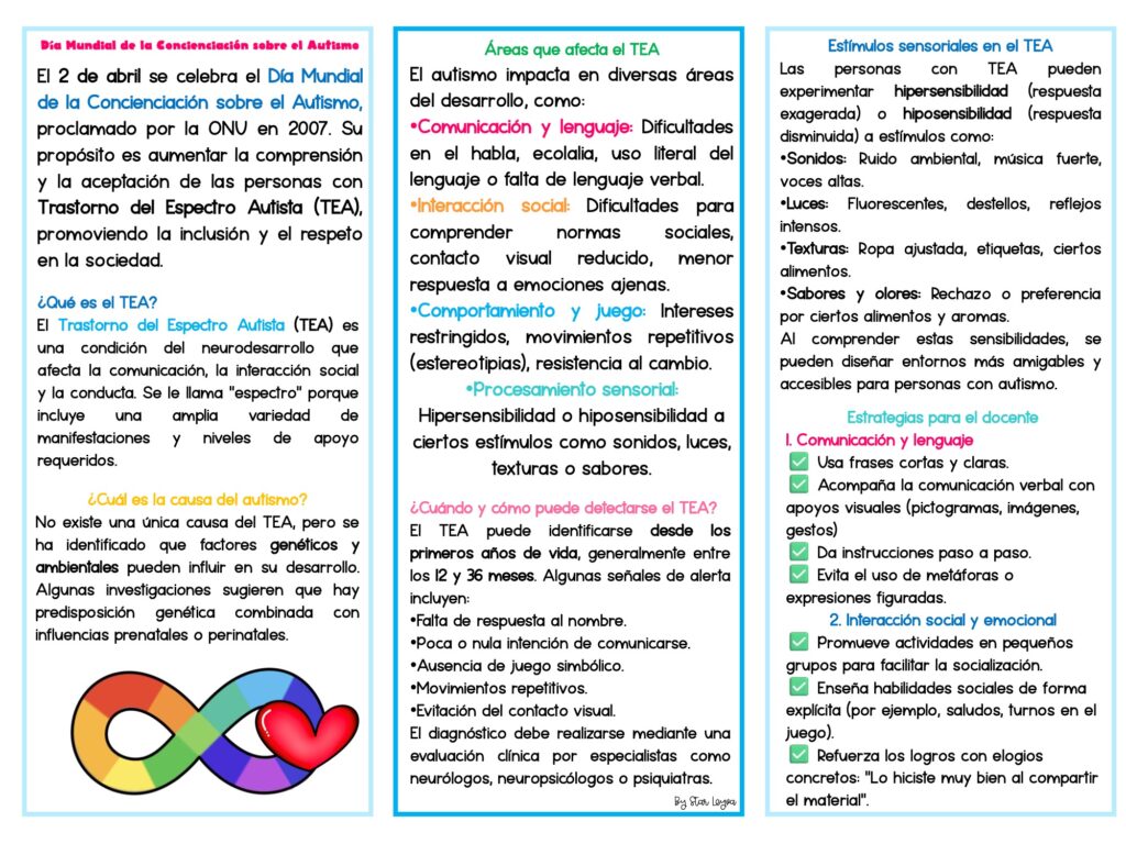 El Tríptico Autismo 2 de abril elaborado por StarCreando – StarLeyva es un material informativo diseñado para acompañar la conmemoración del Día Mundial de la Concienciación sobre el Autismo. Su enfoque combina información rigurosa, estrategias prácticas para el aula y mensajes de sensibilización que promueven el respeto, la empatía y la inclusión.