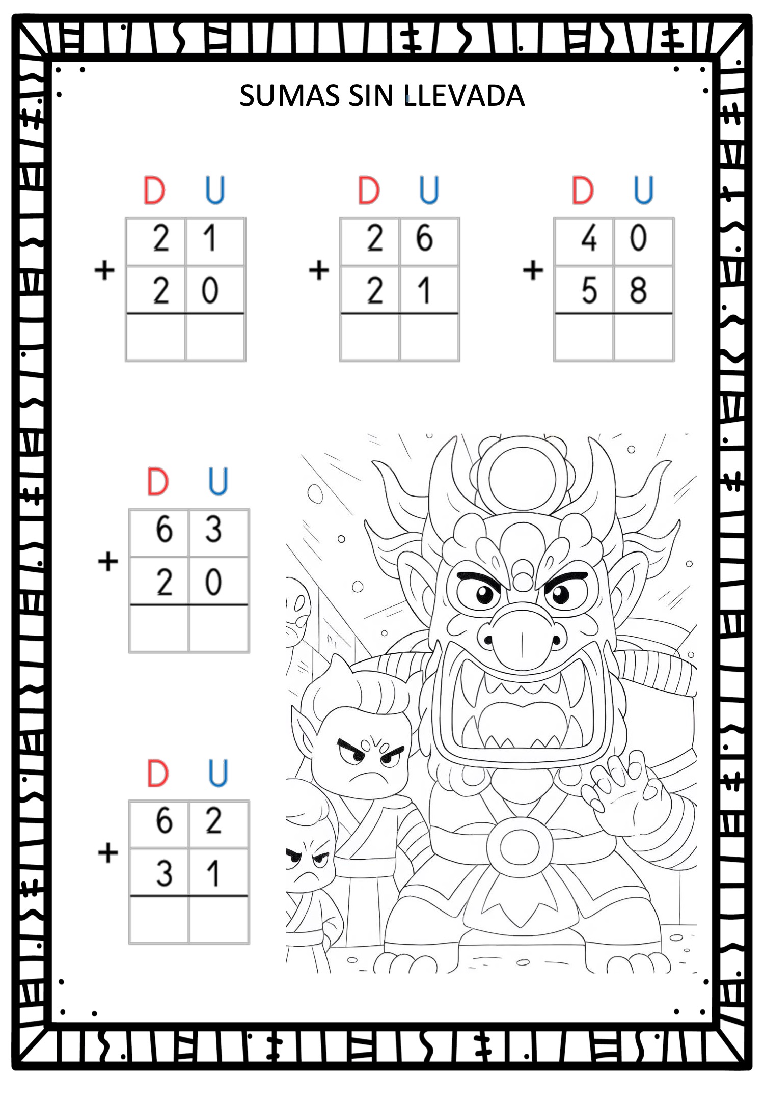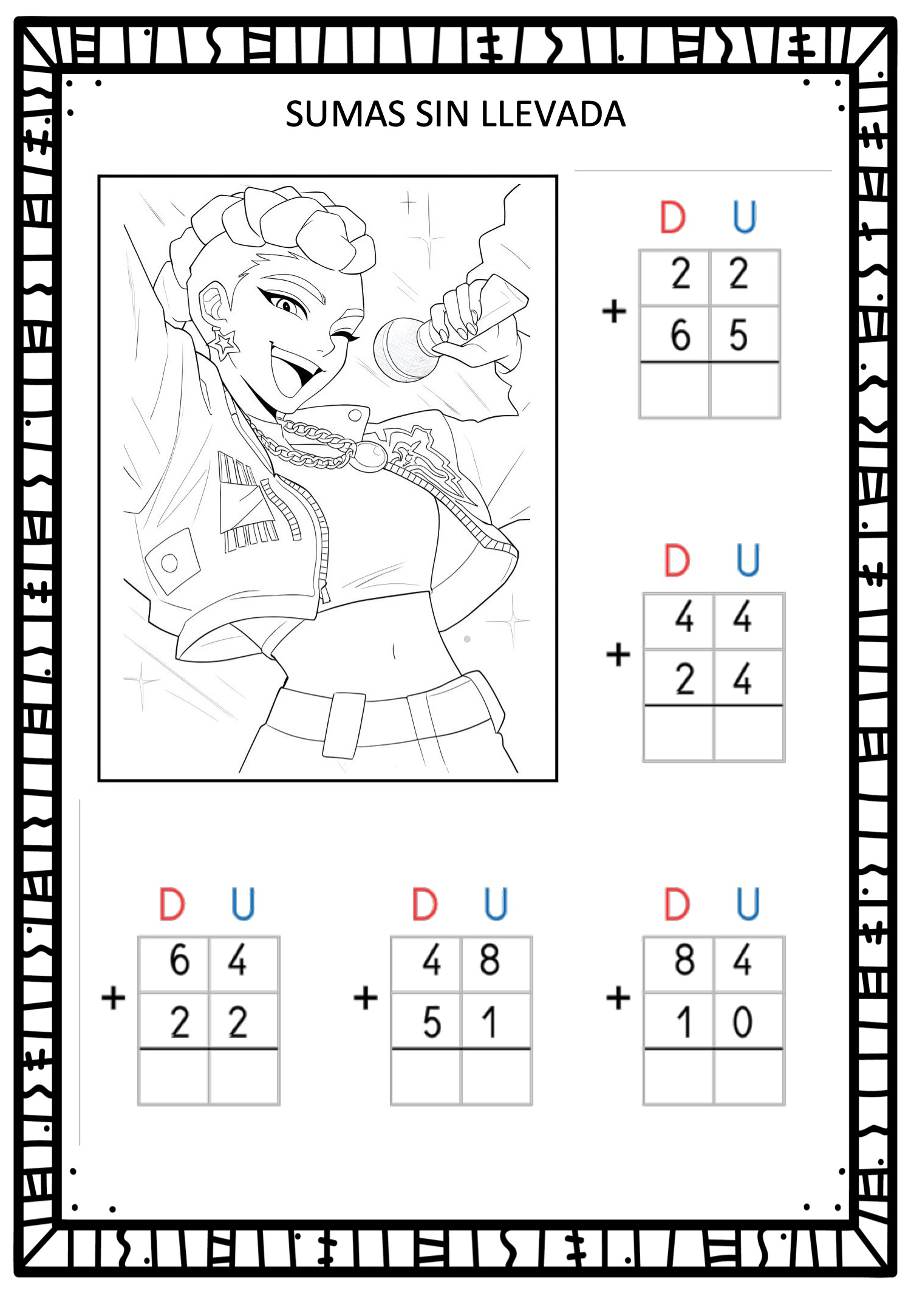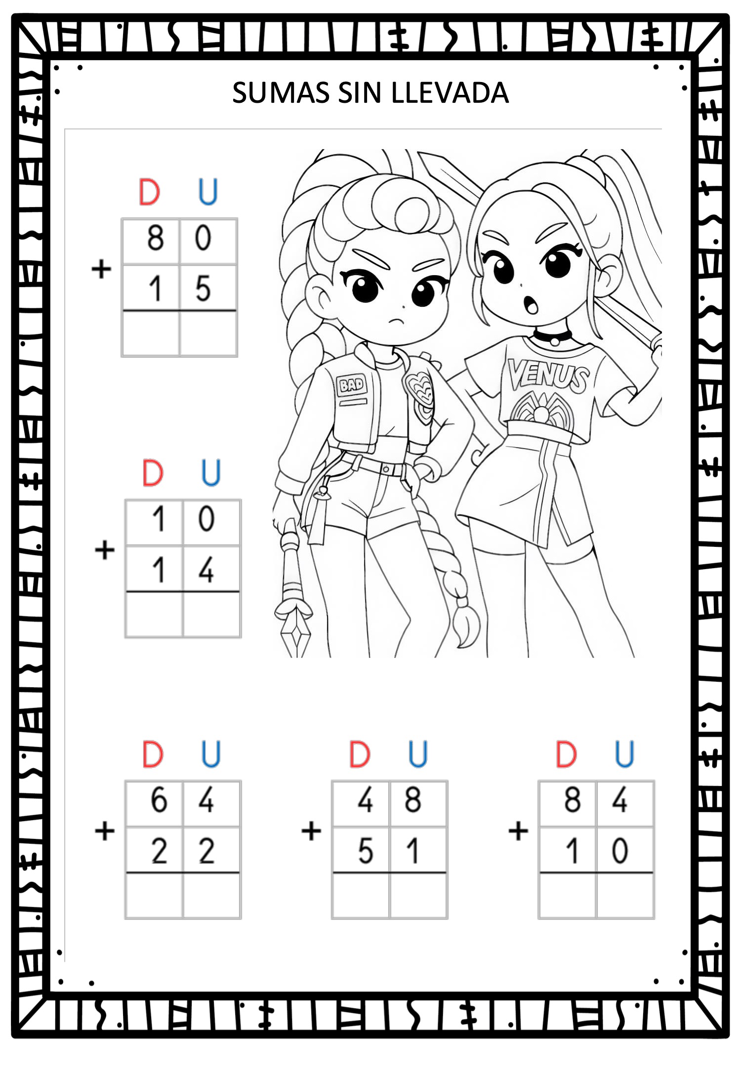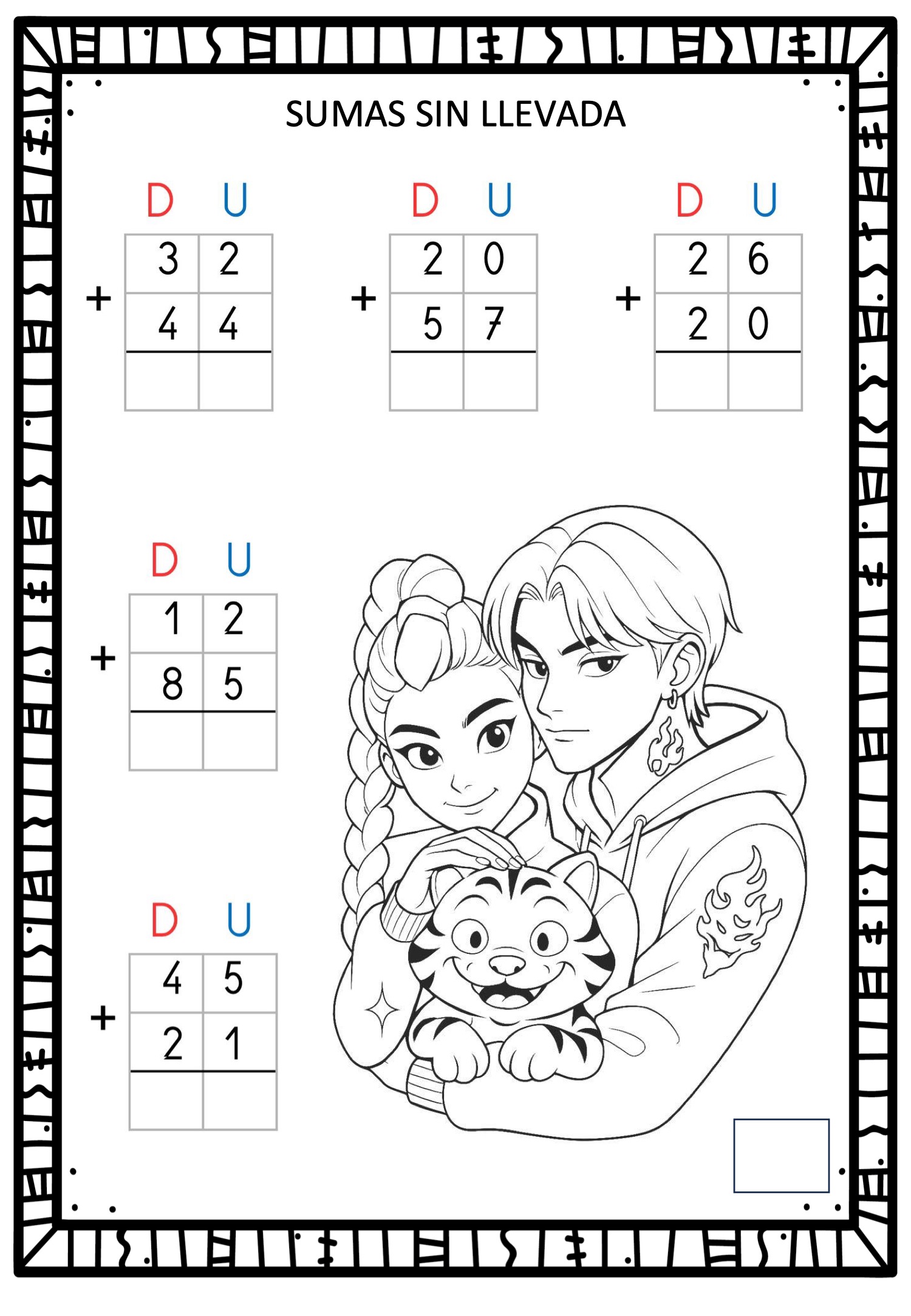 Este cuaderno de Sumas sin llevada combina práctica matemática con ilustraciones de personajes estilo Demon Hunter y Saja Boys, creando una experiencia divertida y motivadora para el alumnado. Cada ficha incluye operaciones de dos cifras (D–U) presentadas de forma clara, ordenada y perfecta para trabajar cálculo mental, atención y autonomía.