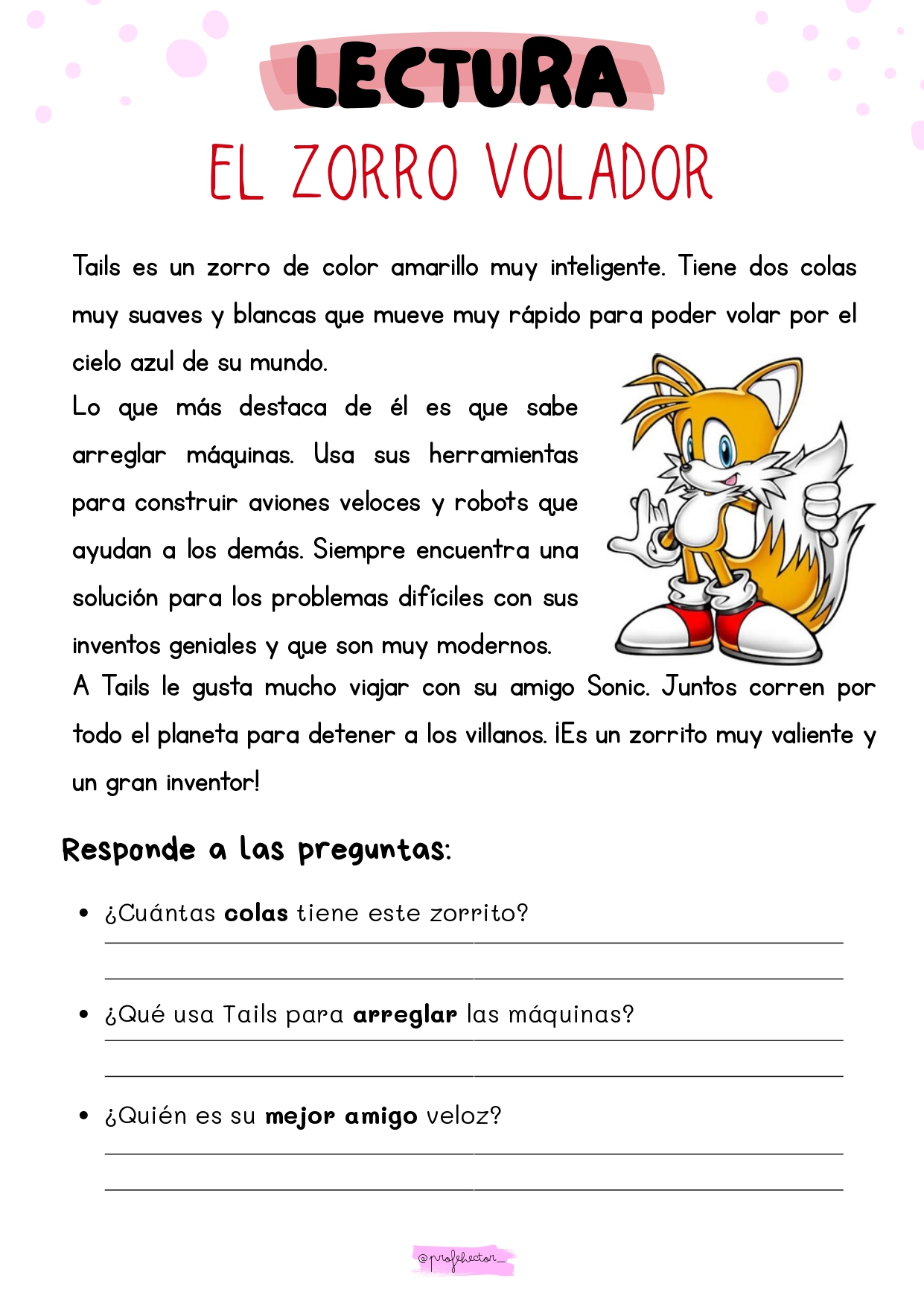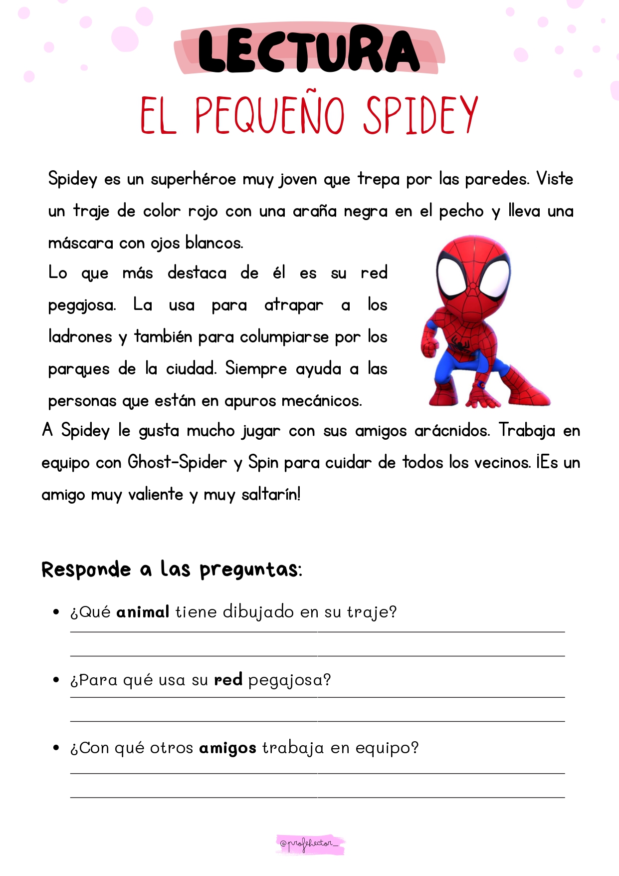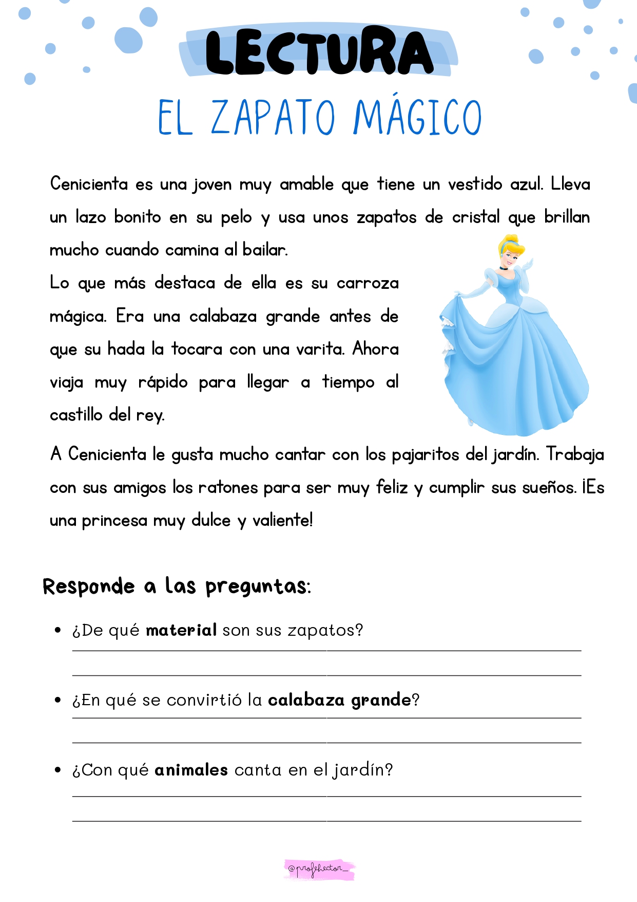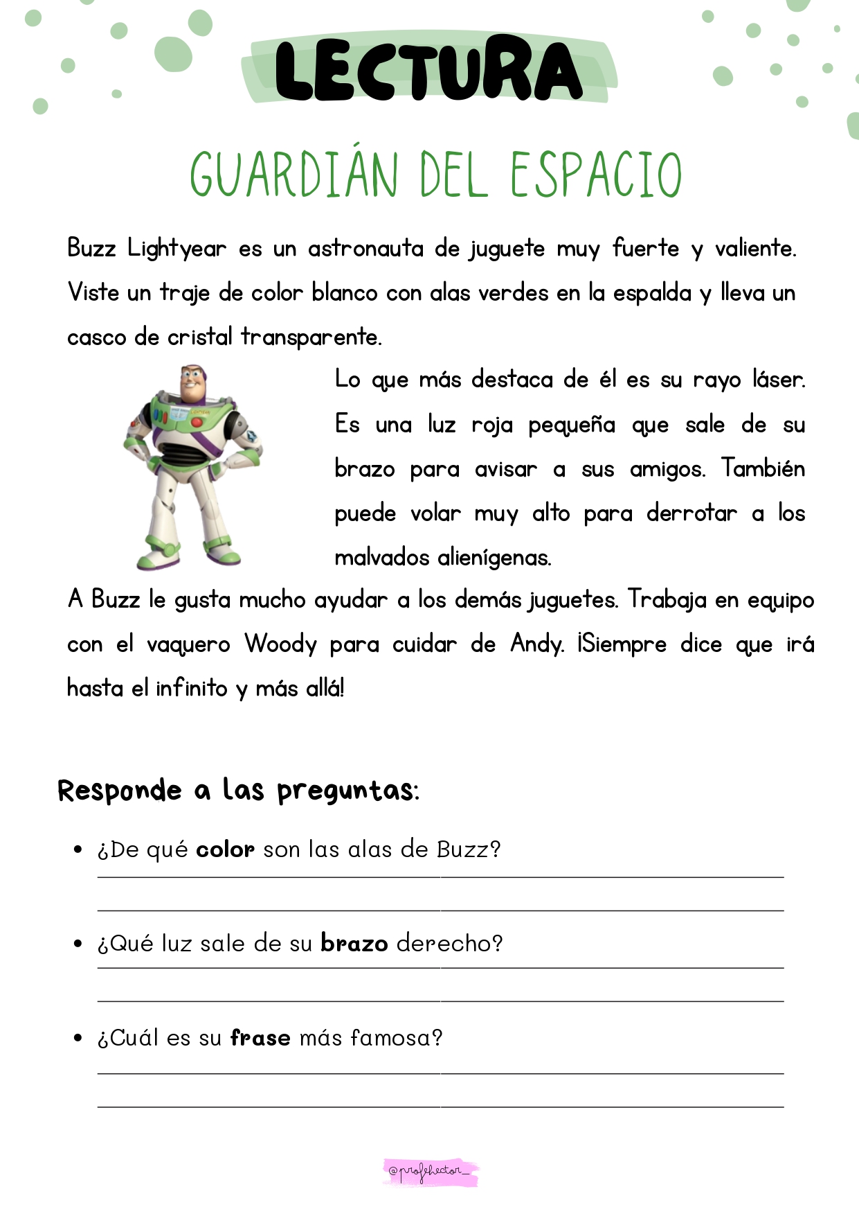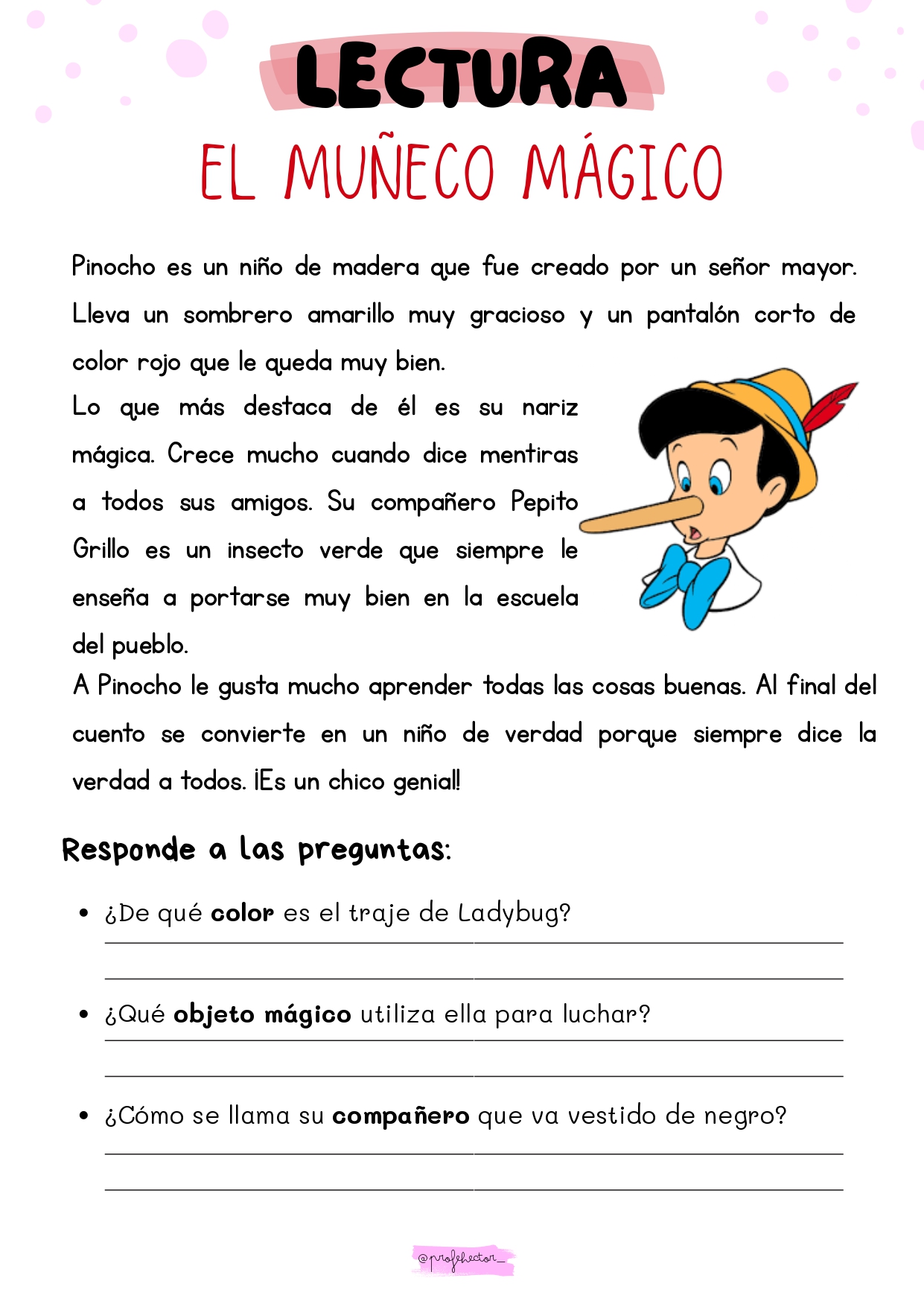 El material contiene más de 20 lecturas breves, cada una con su ilustración y tres preguntas de comprensión. Entre los personajes incluidos encontramos: