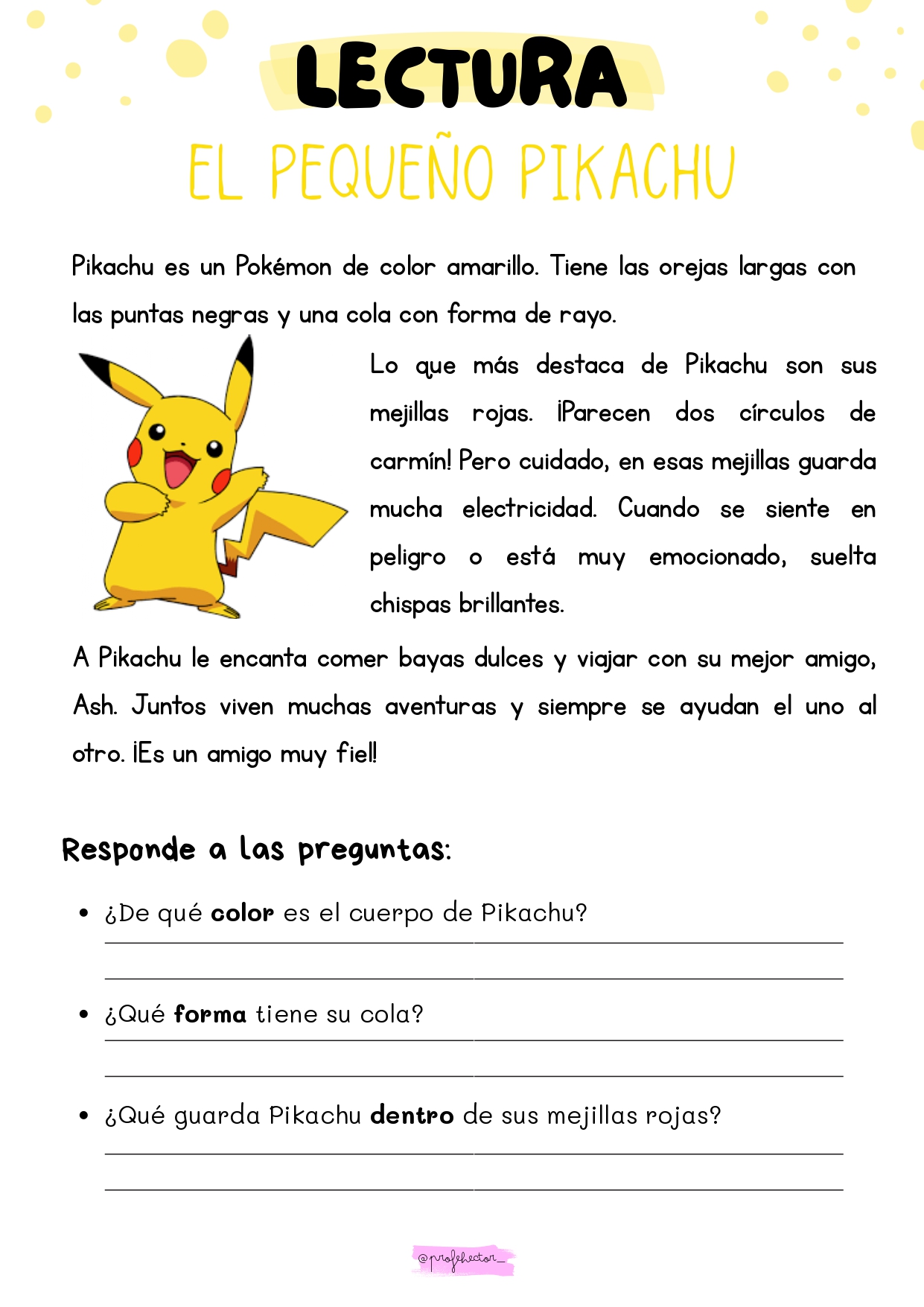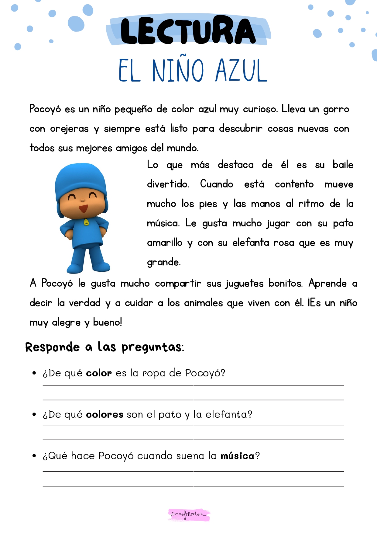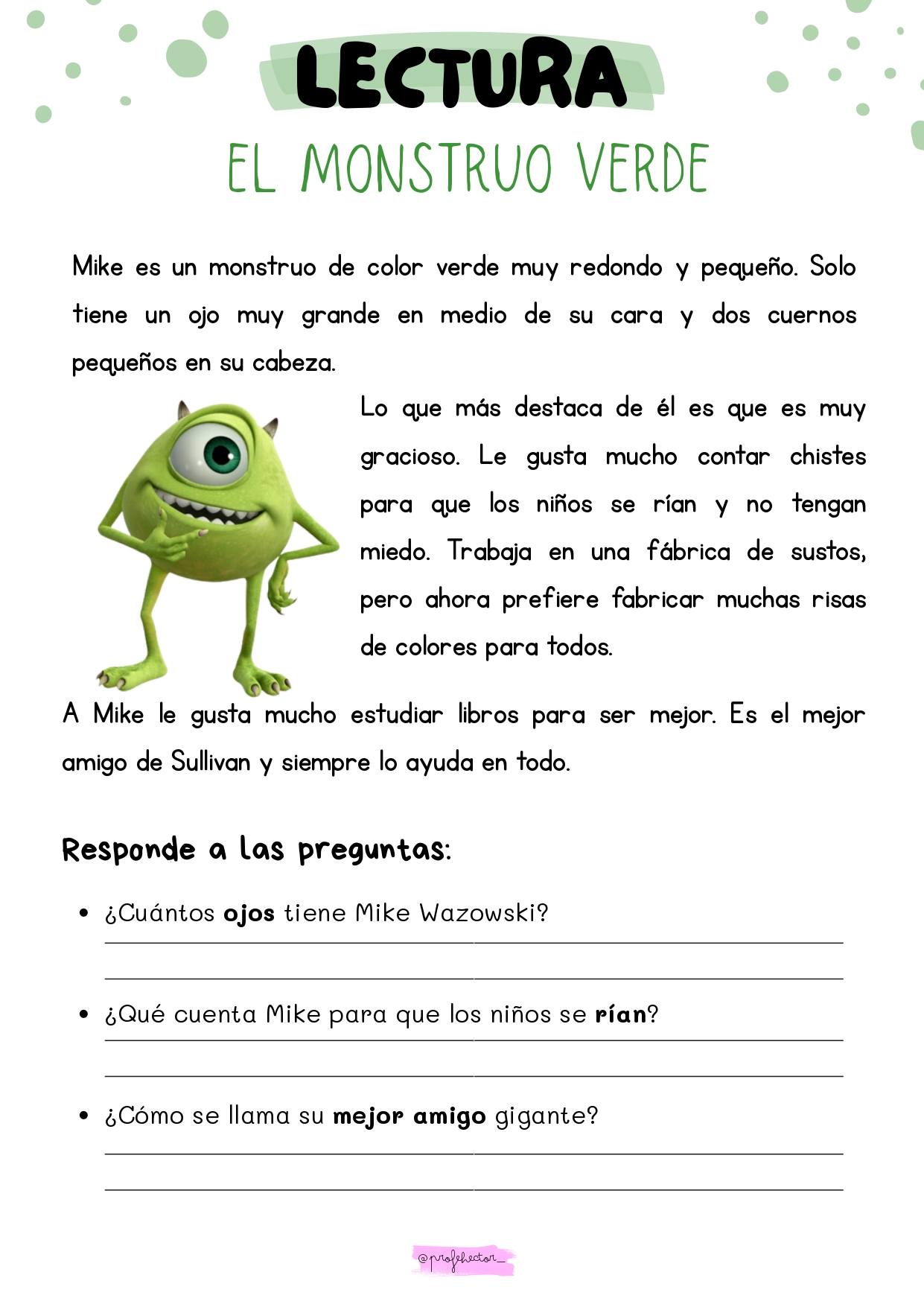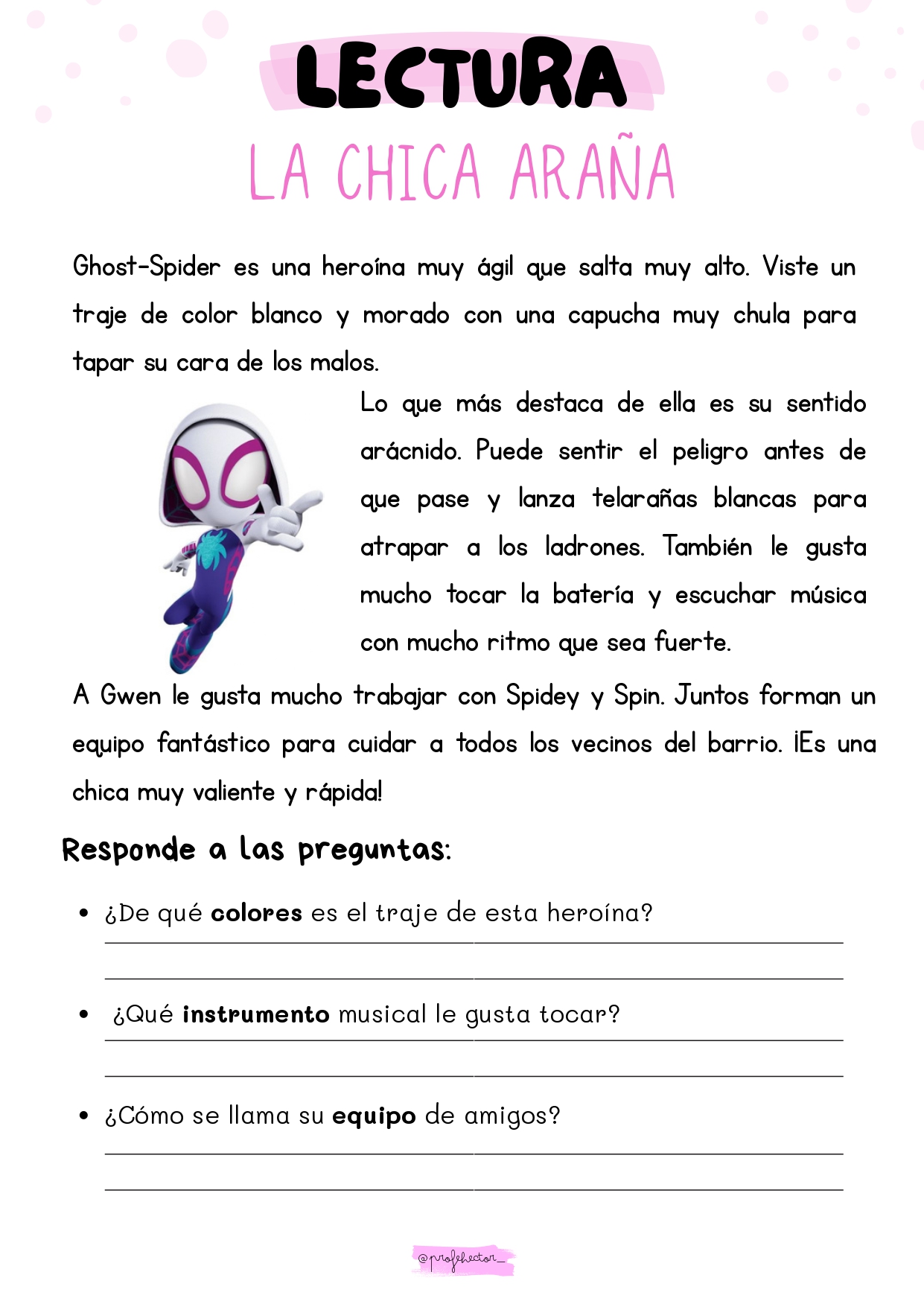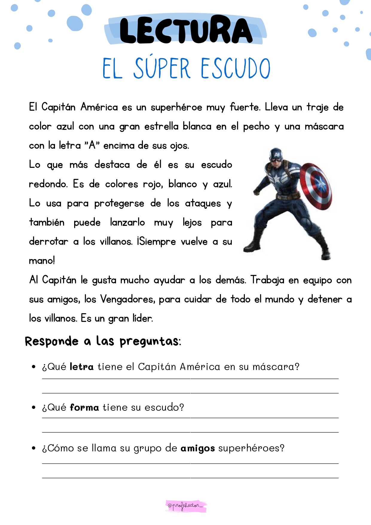 El material contiene más de 20 lecturas breves, cada una con su ilustración y tres preguntas de comprensión. Entre los personajes incluidos encontramos: