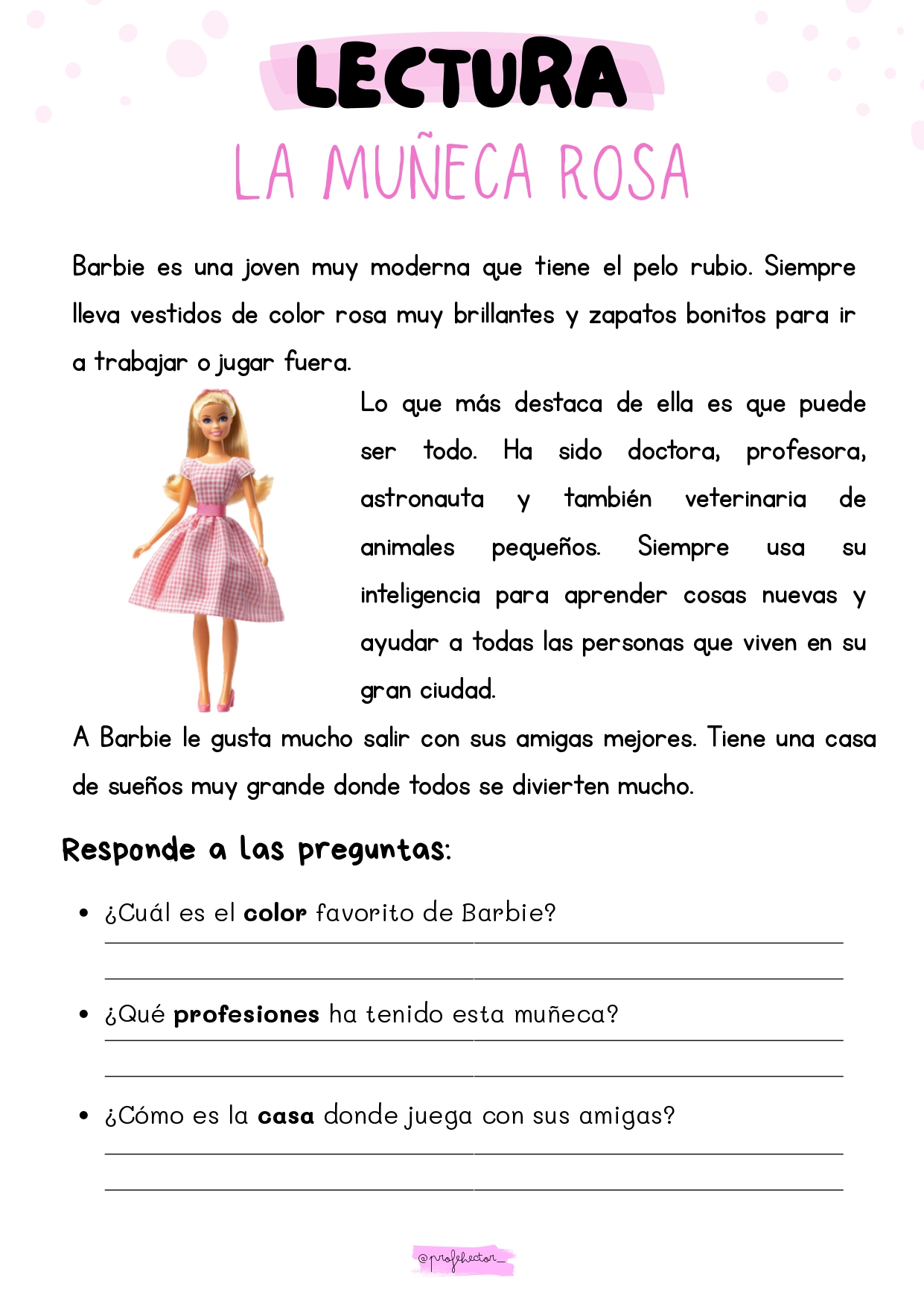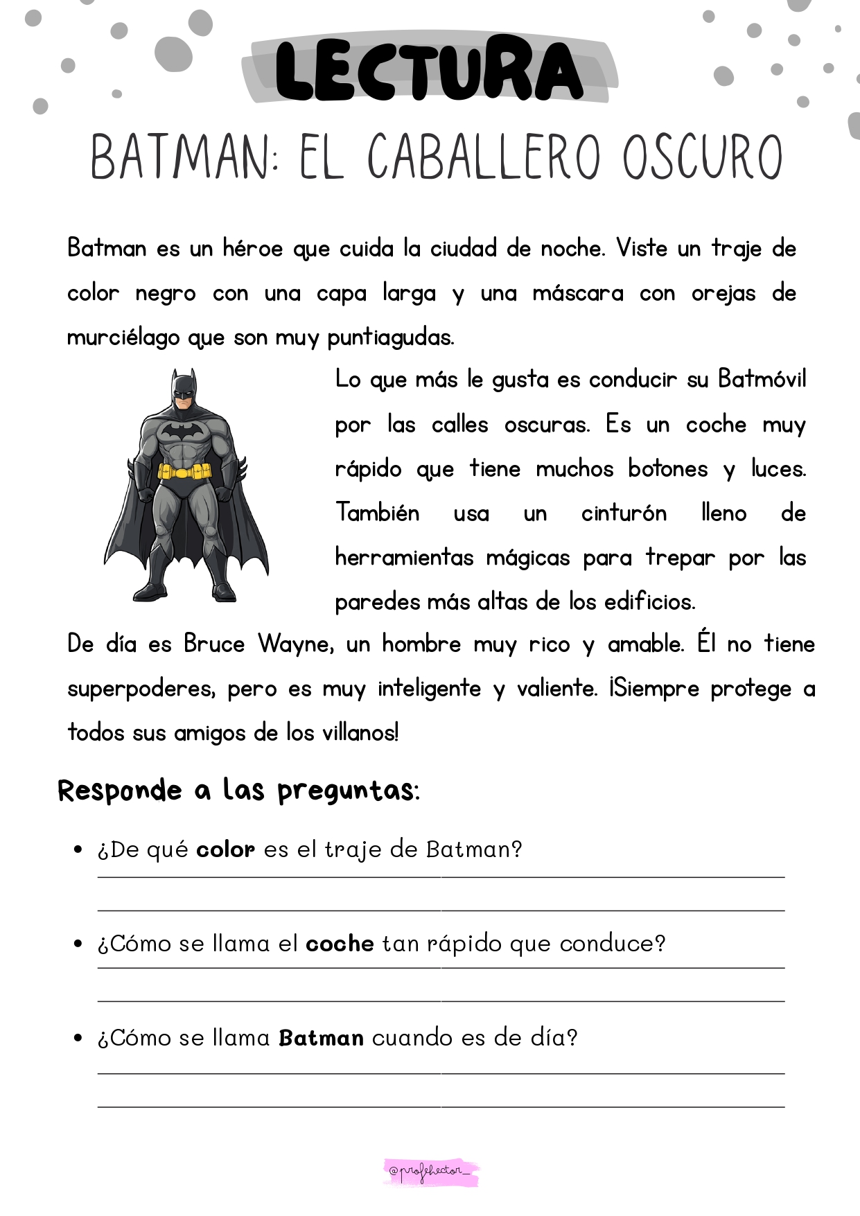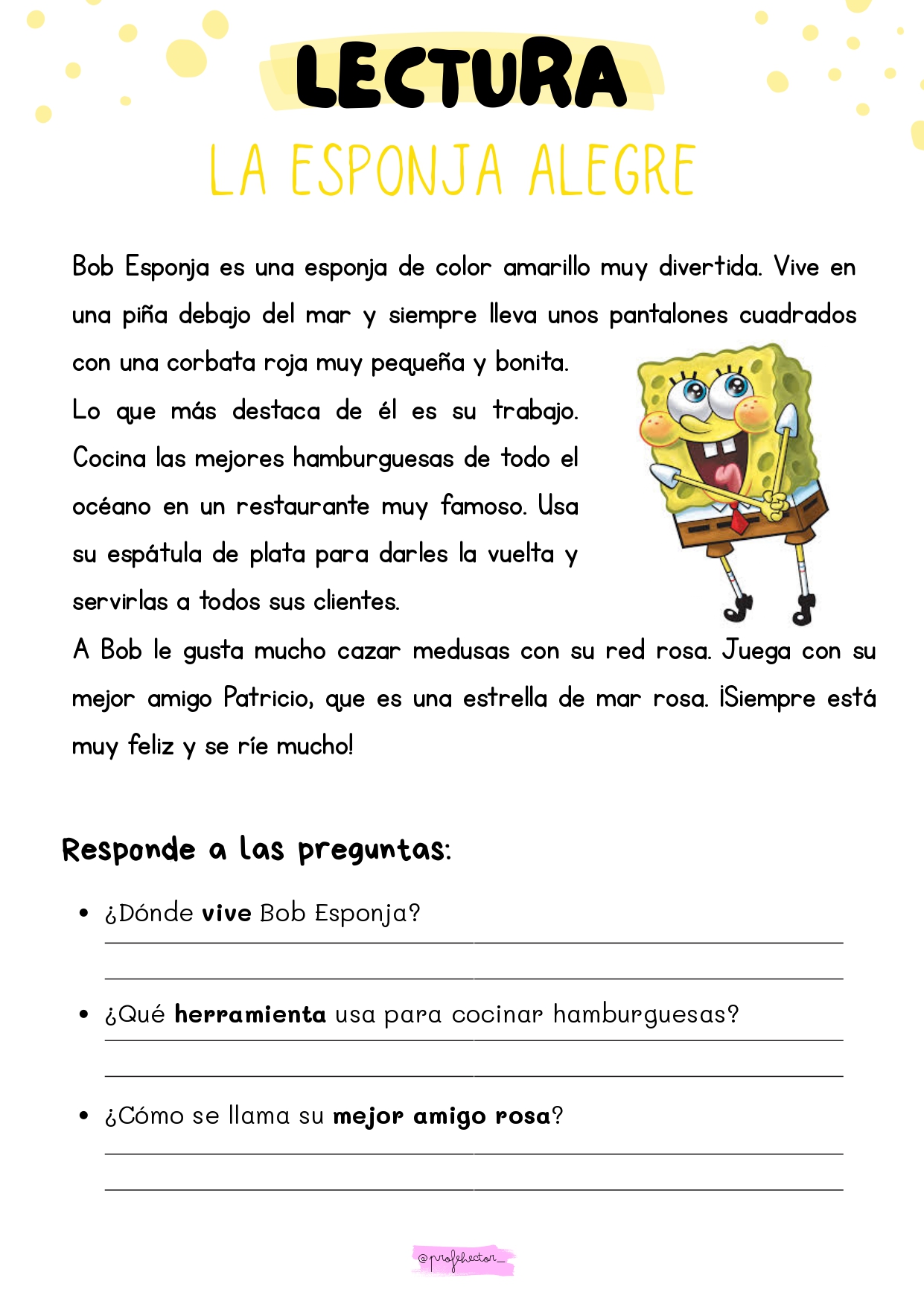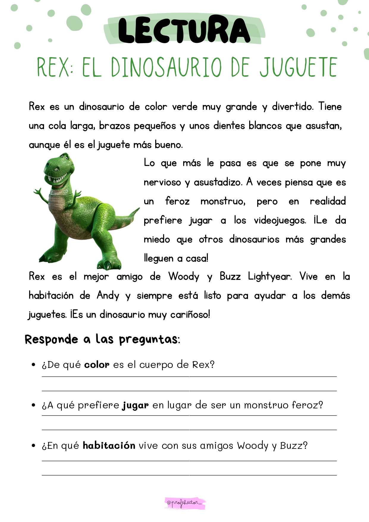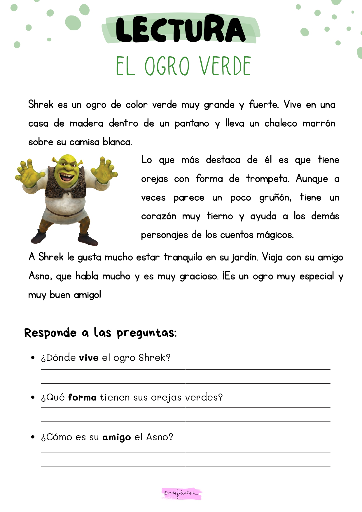 El material contiene más de 20 lecturas breves, cada una con su ilustración y tres preguntas de comprensión. Entre los personajes incluidos encontramos: