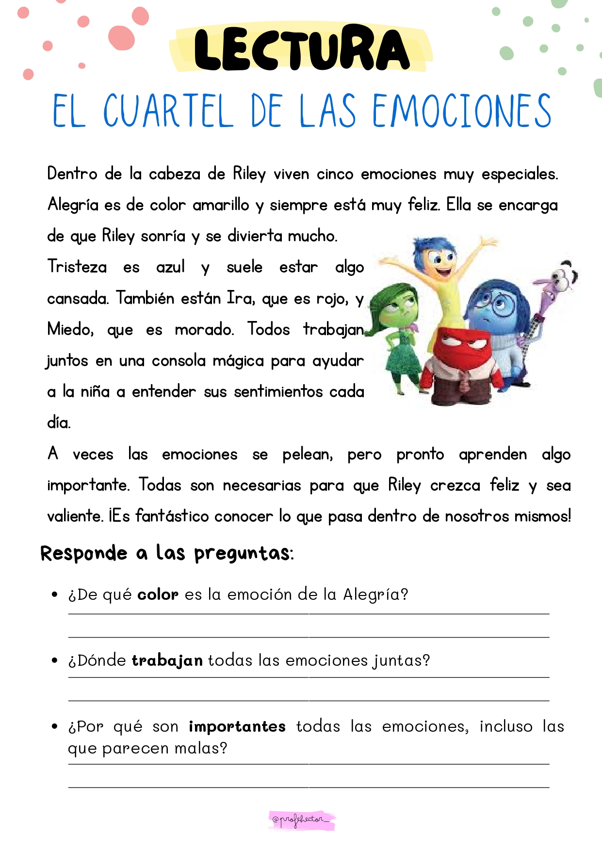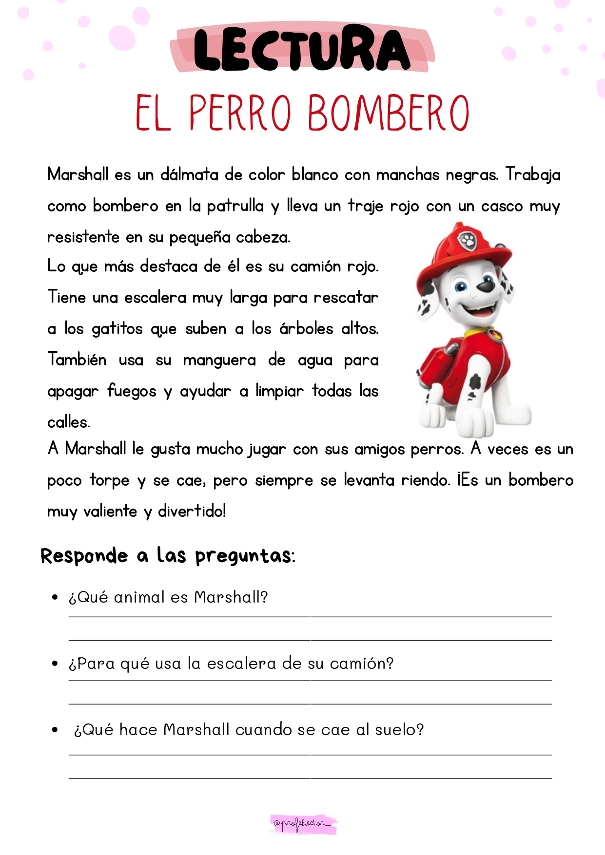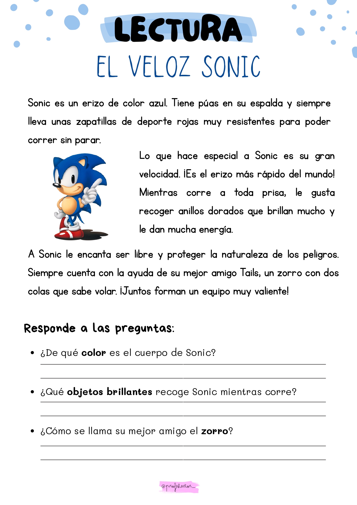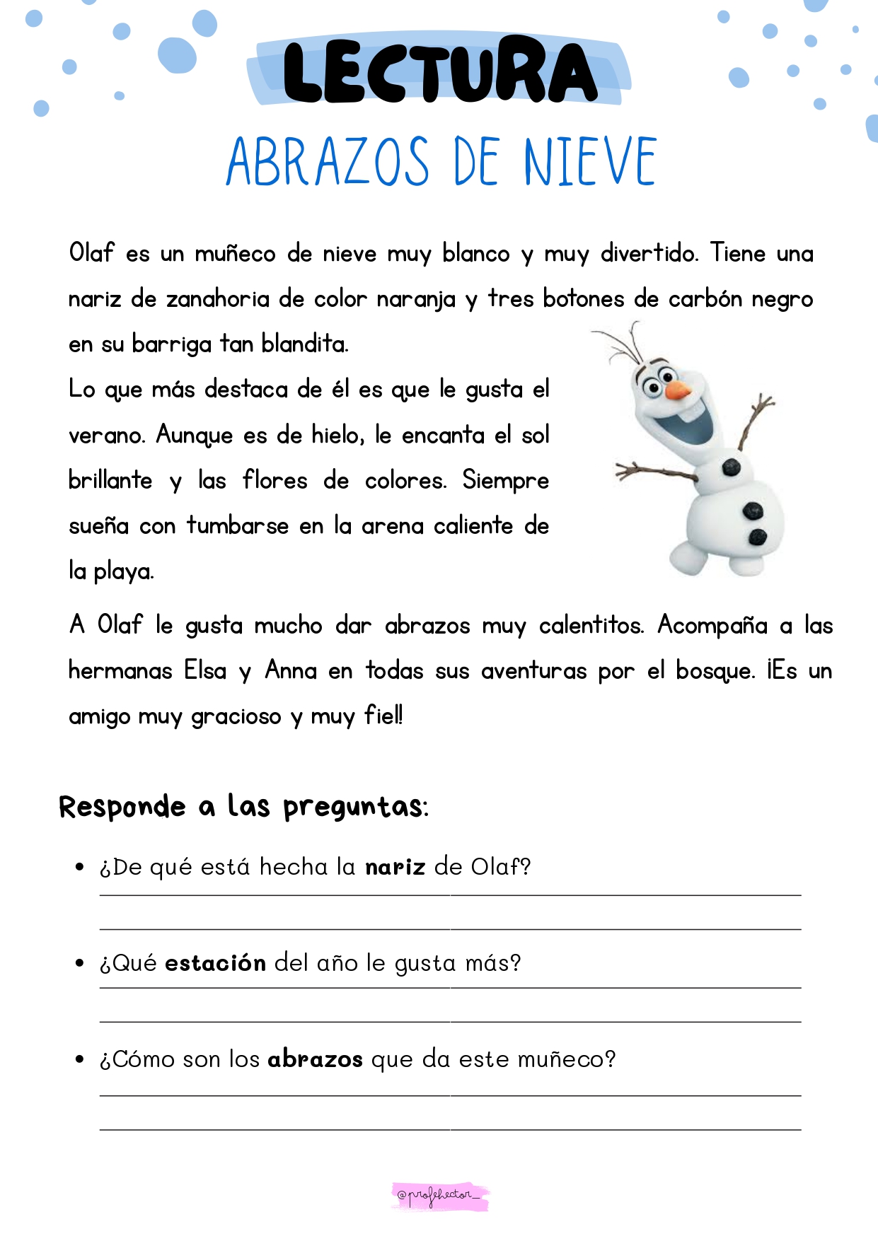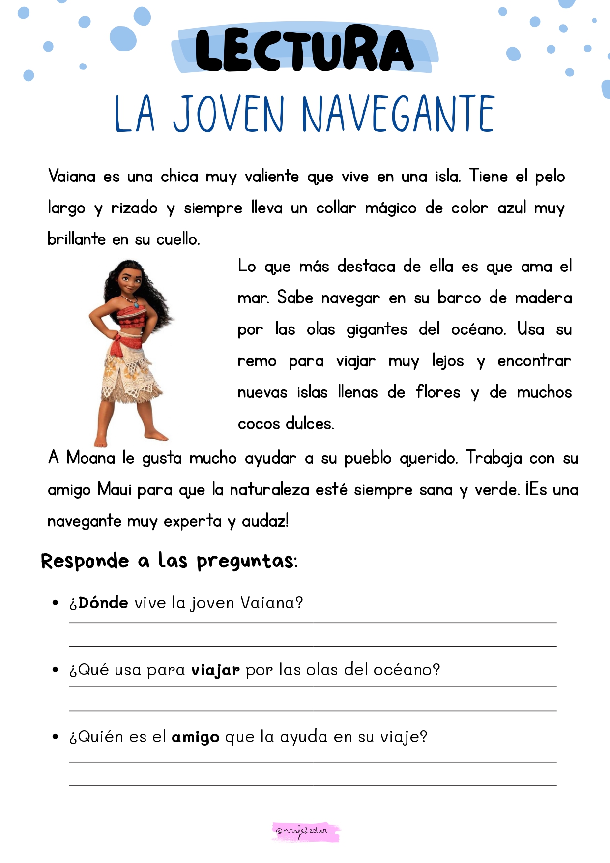El material contiene más de 20 lecturas breves, cada una con su ilustración y tres preguntas de comprensión. Entre los personajes incluidos encontramos: