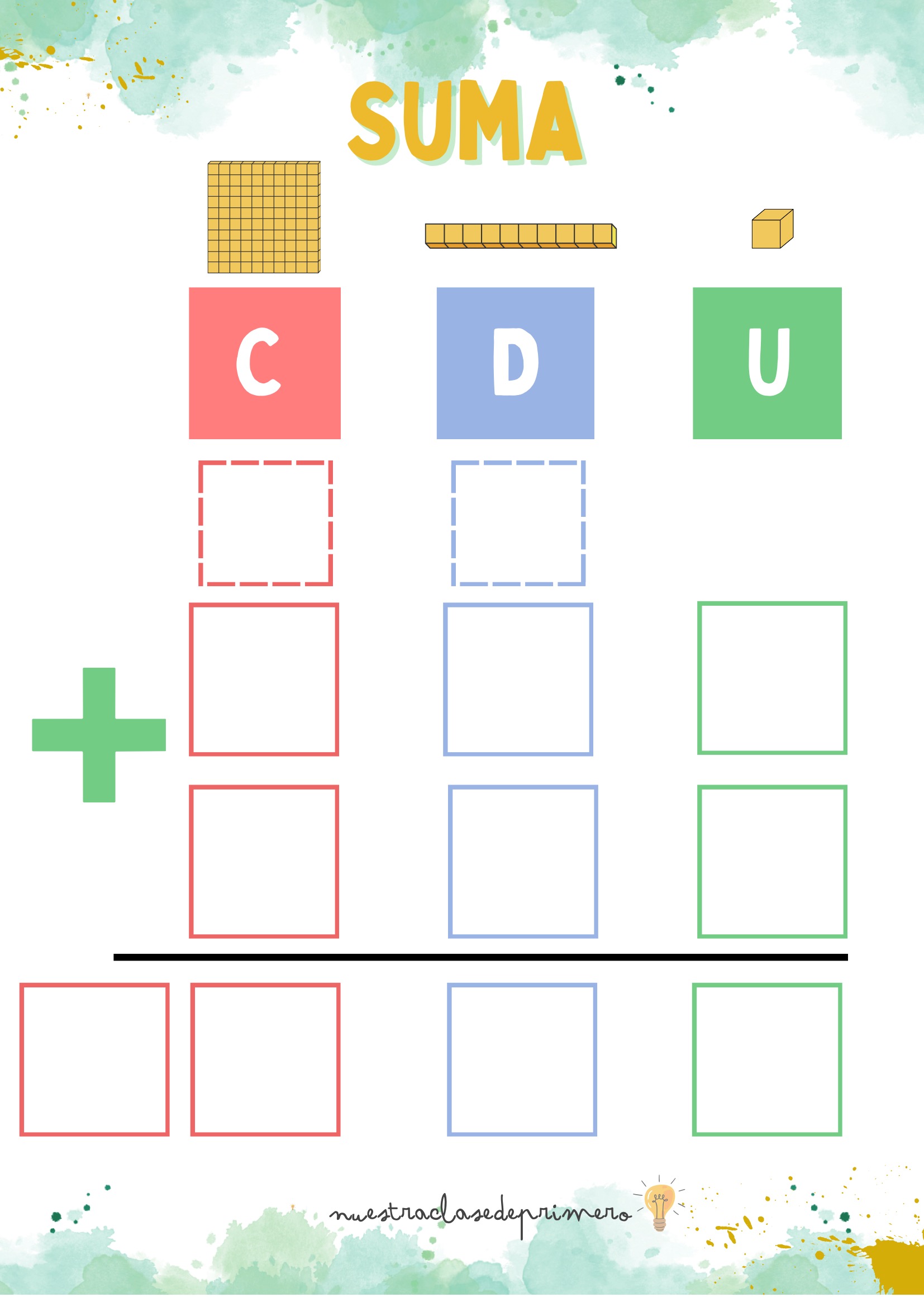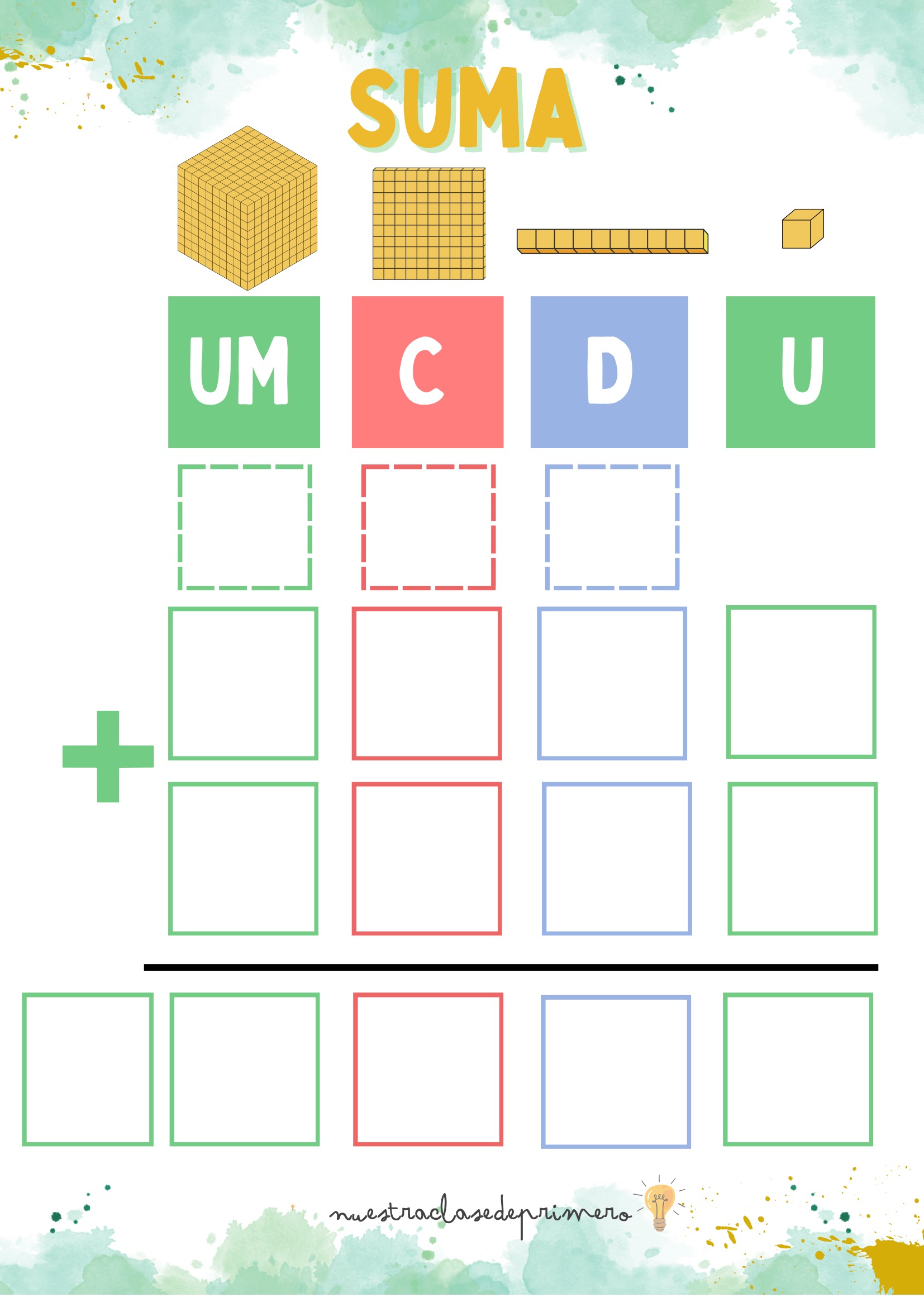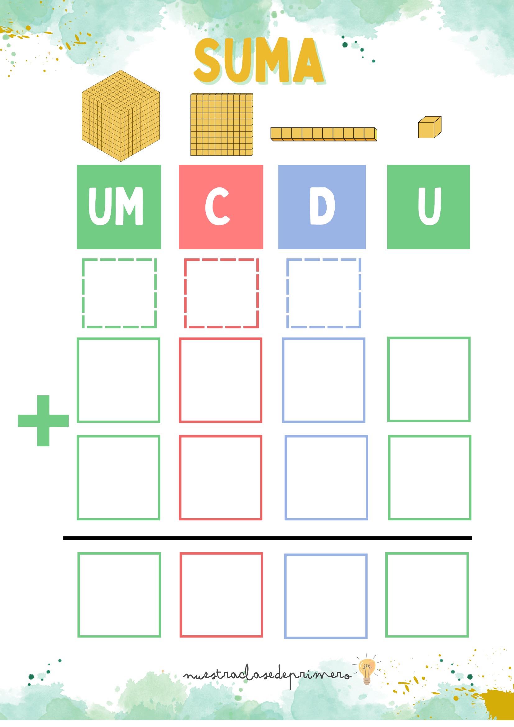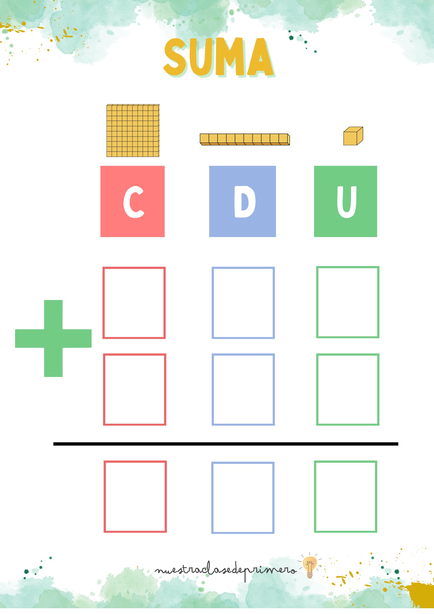 El documento incluye diferentes modelos para adaptarse al nivel del alumnado, desde sumas simples DU hasta sumas más avanzadas con CDU y UMCDU. Todo ello con un diseño limpio, ordenado y perfecto para imprimir y plastificar.