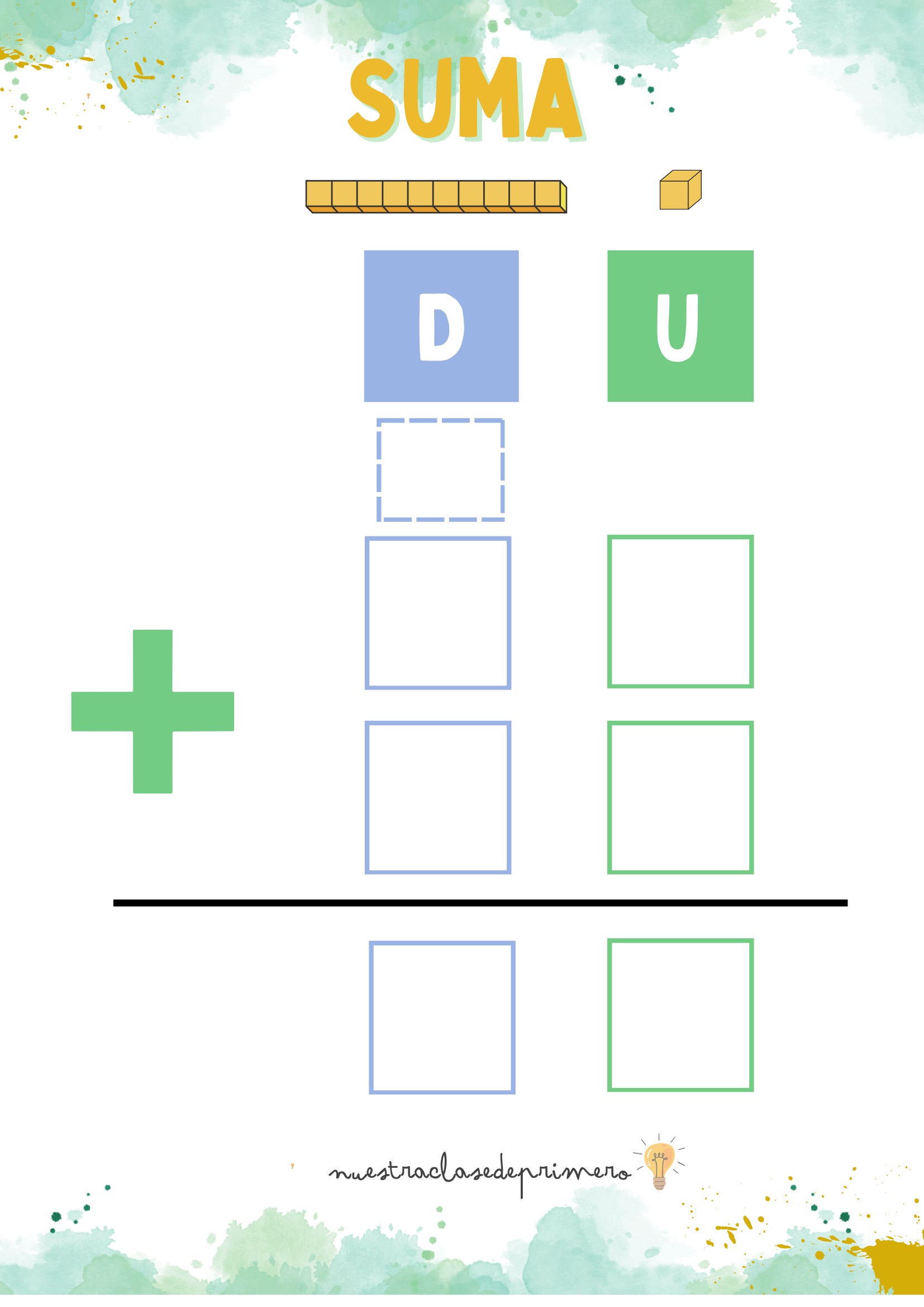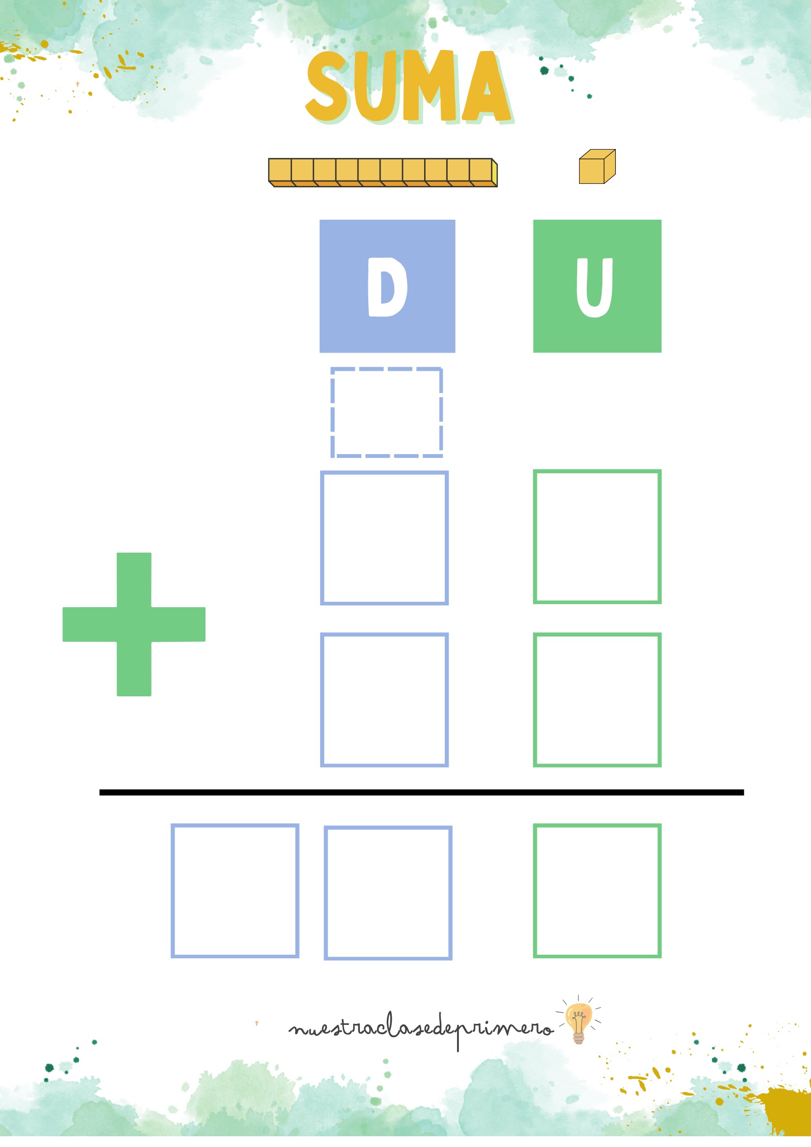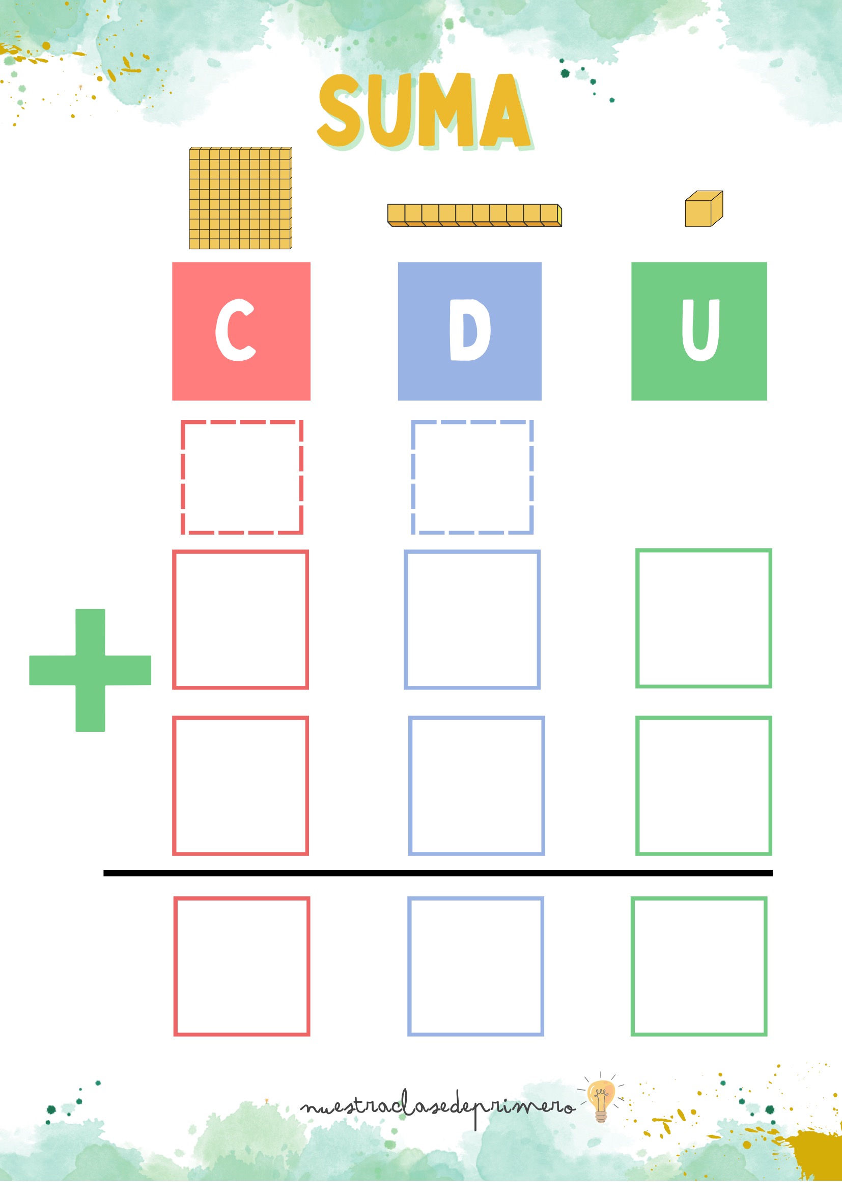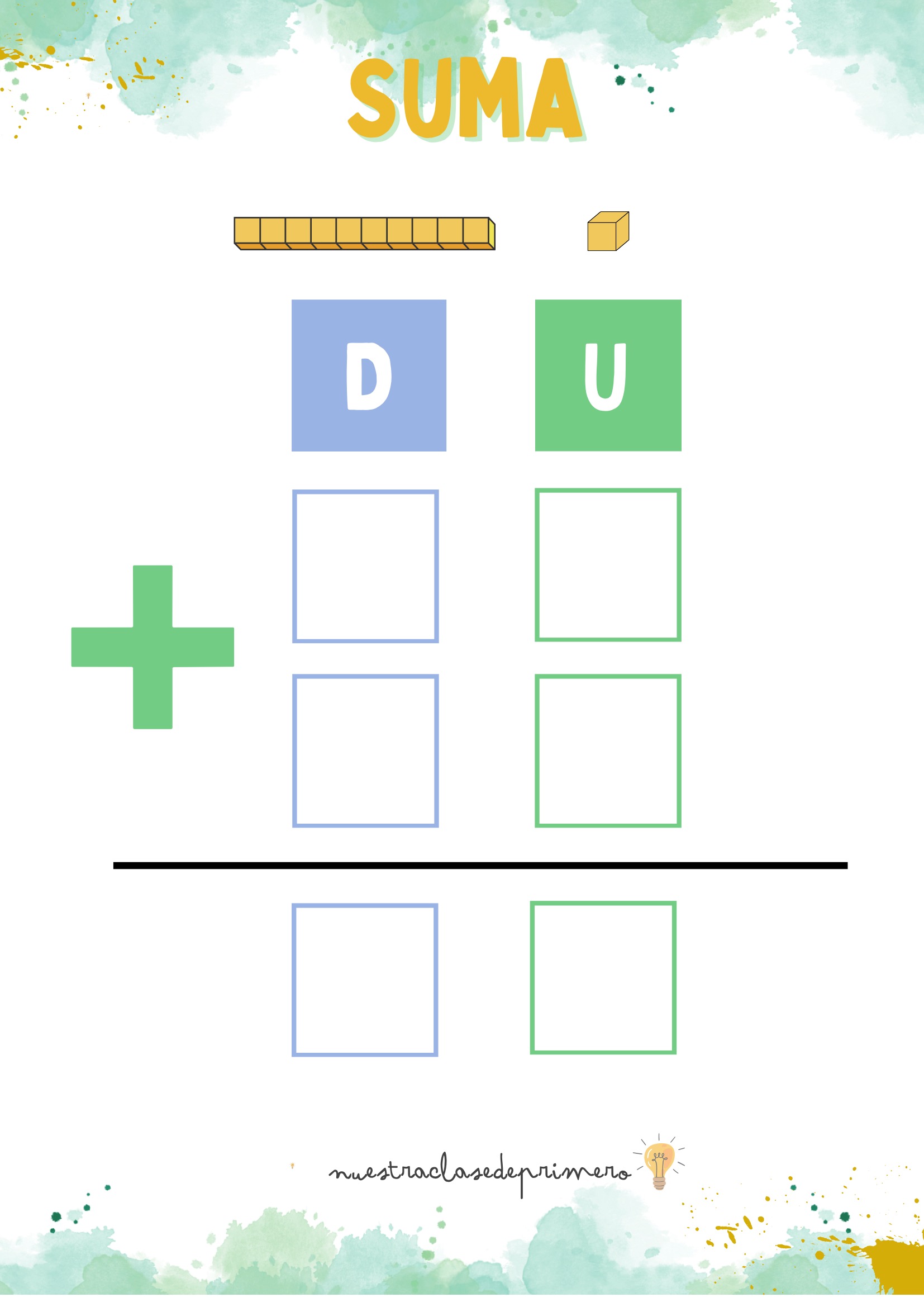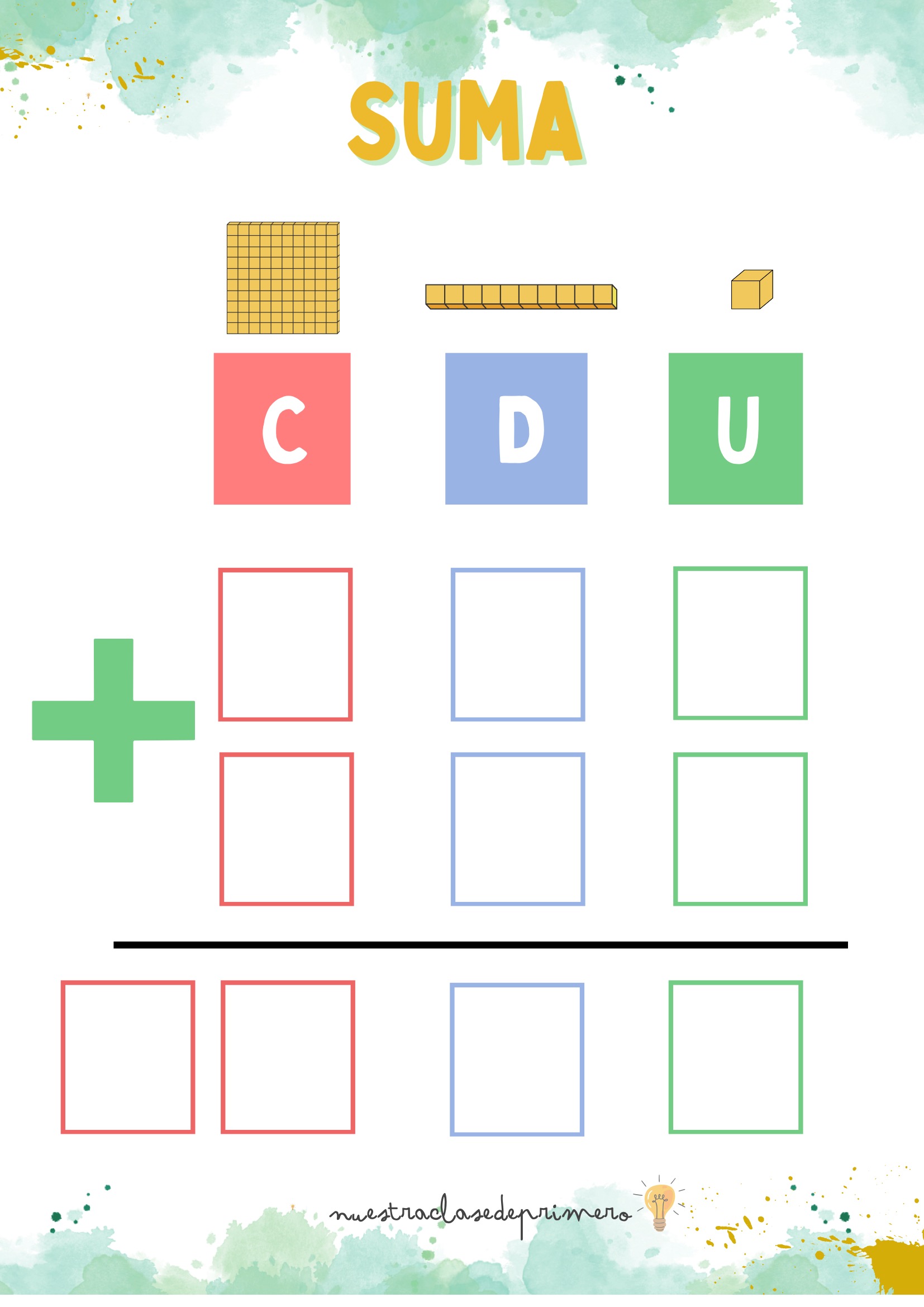 El documento incluye diferentes modelos para adaptarse al nivel del alumnado, desde sumas simples DU hasta sumas más avanzadas con CDU y UMCDU. Todo ello con un diseño limpio, ordenado y perfecto para imprimir y plastificar.