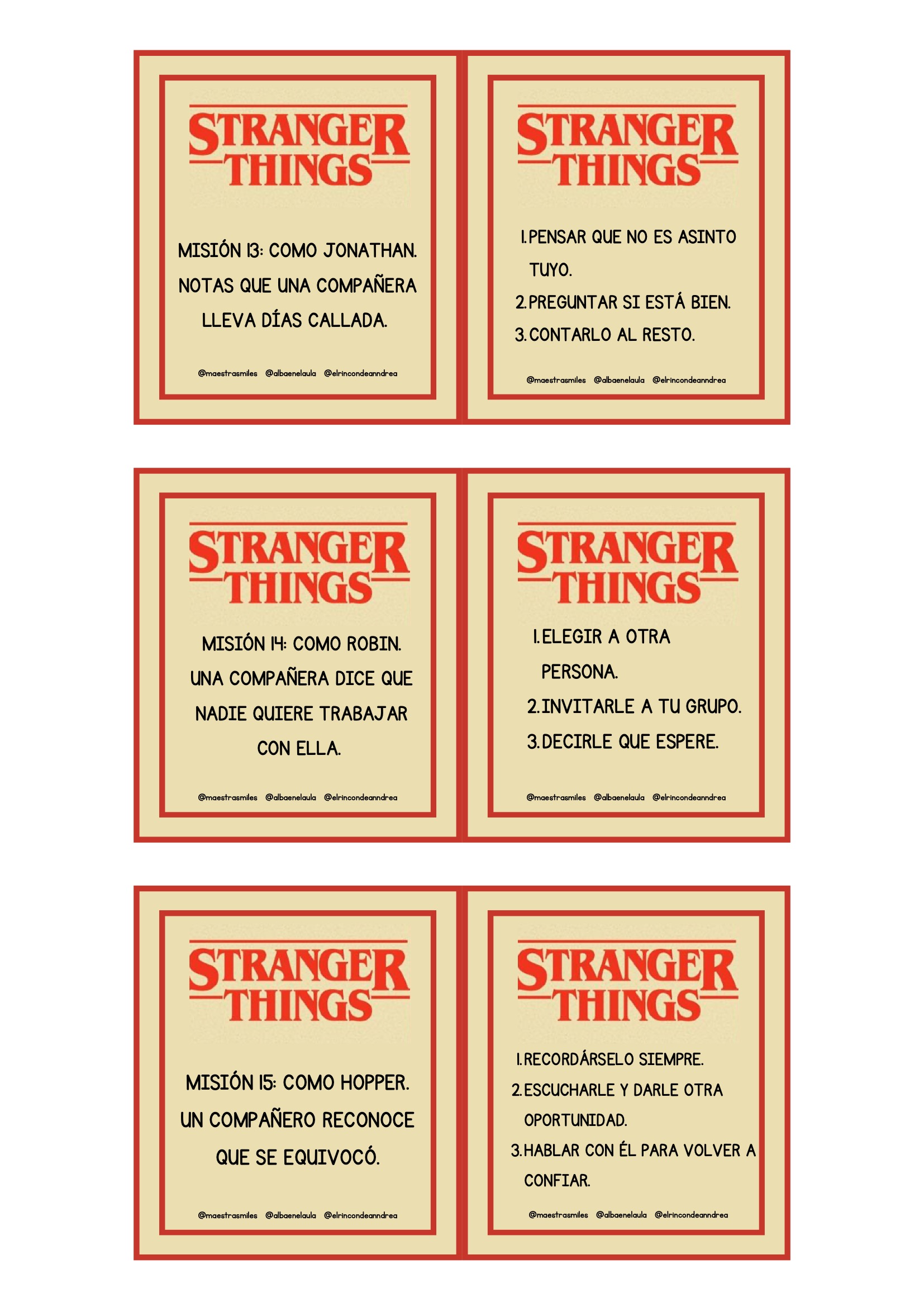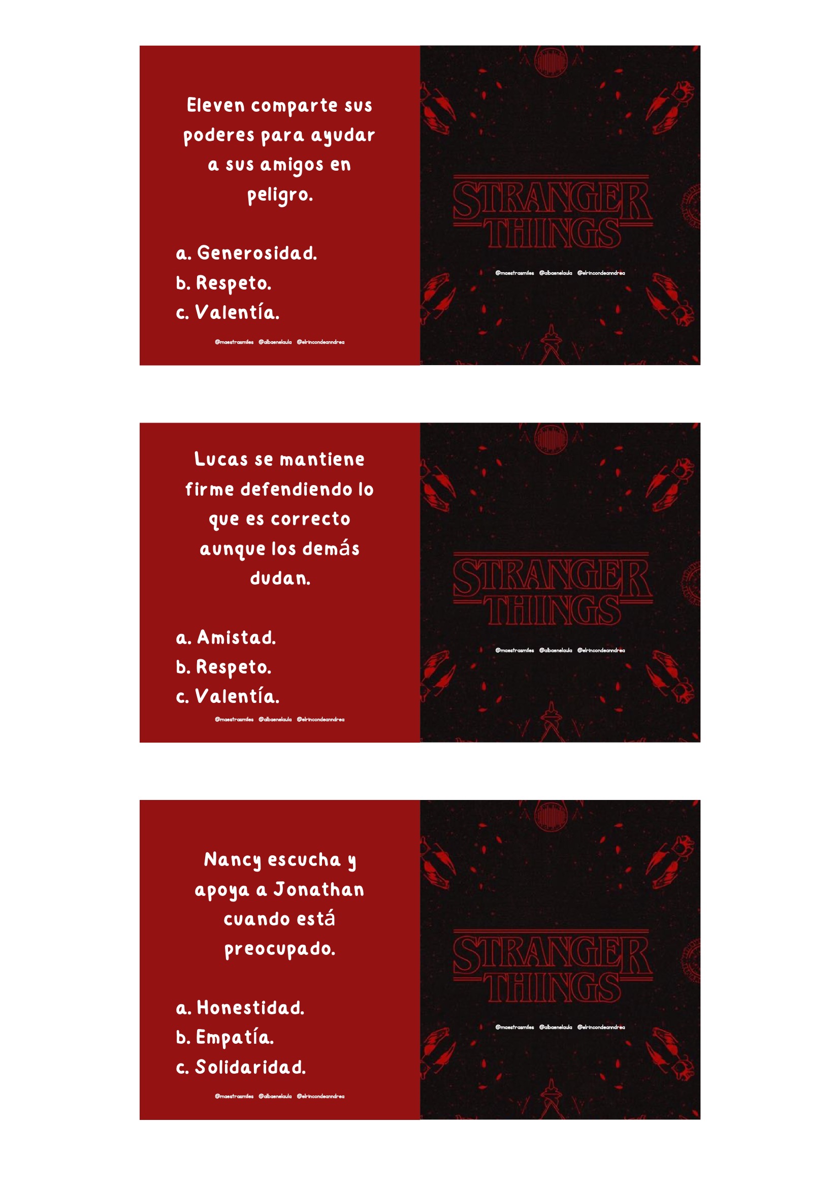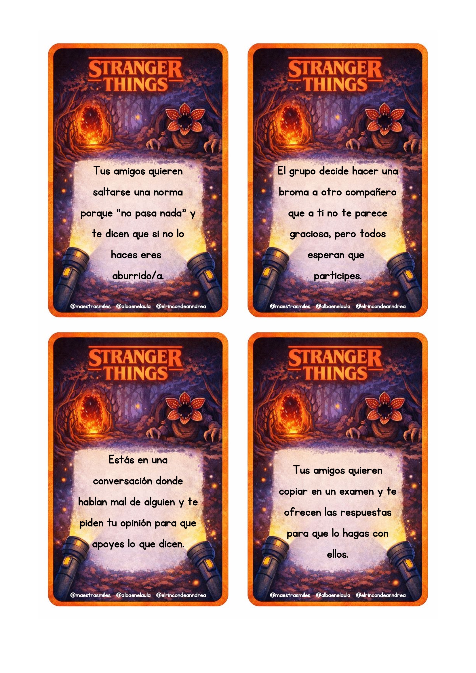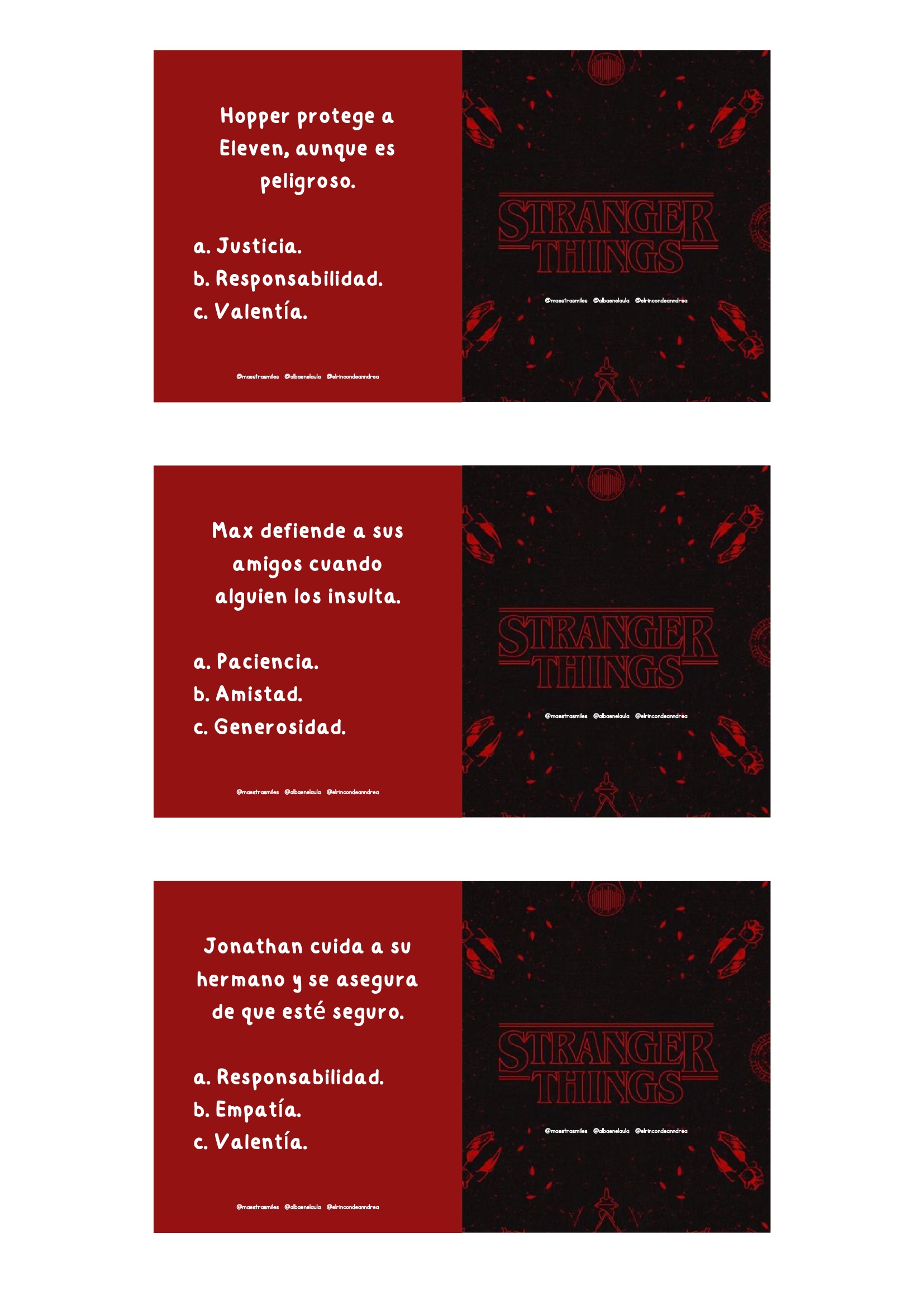El universo de Stranger Things fascina por su mezcla de misterio, amistad, aventura y trabajo en equipo. Aprovechar ese interés para trabajar valores es una oportunidad fantástica para cualquier aula. Este nuevo pack está diseñado para que el alumnado reflexione sobre emociones, decisiones, vínculos y actitudes positivas a través de escenas y personajes inspirados en la serie, siempre adaptados al contexto escolar.