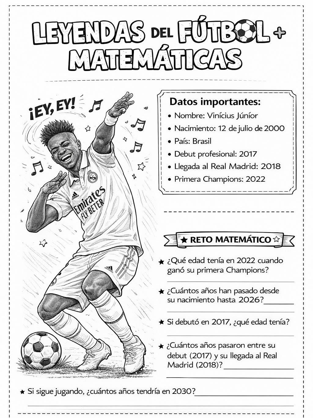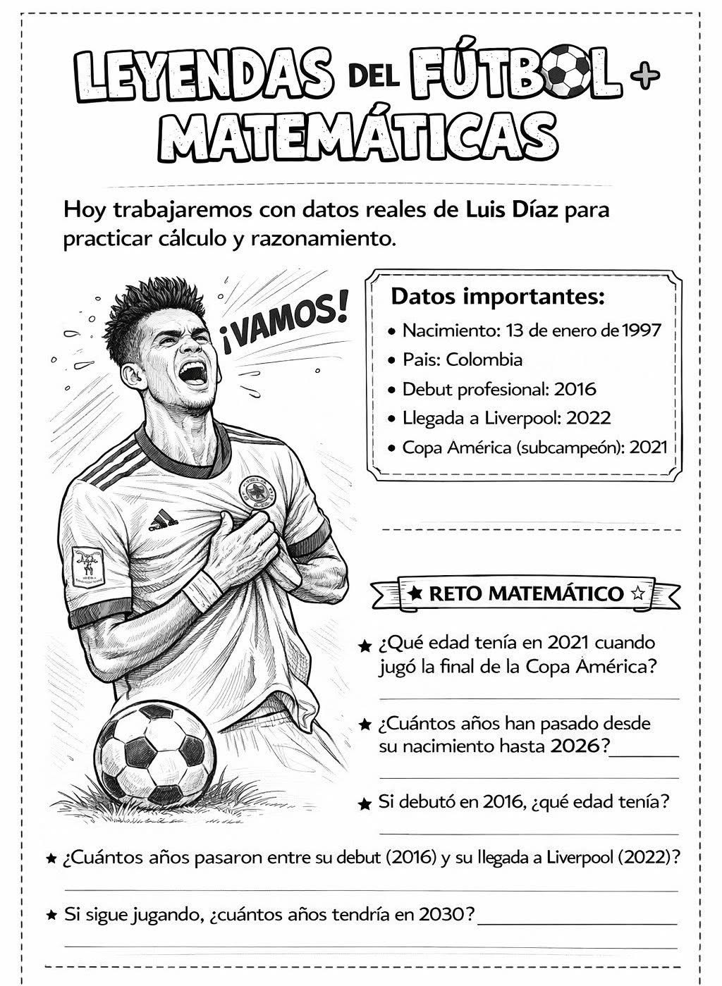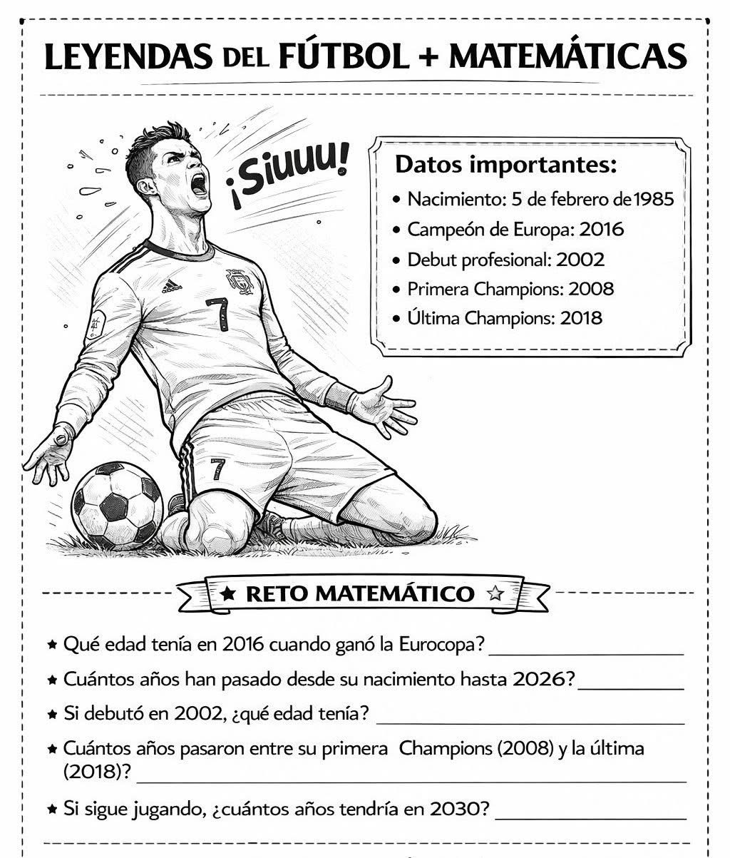 Cristiano Ronaldo, Luis Díaz, Vinícius Jr. y Lionel Messi se convierten en protagonistas de problemas que mezclan fechas, edades, diferencias de años y cálculos temporales. Una forma fantástica de trabajar matemáticas aplicadas a la vida real.