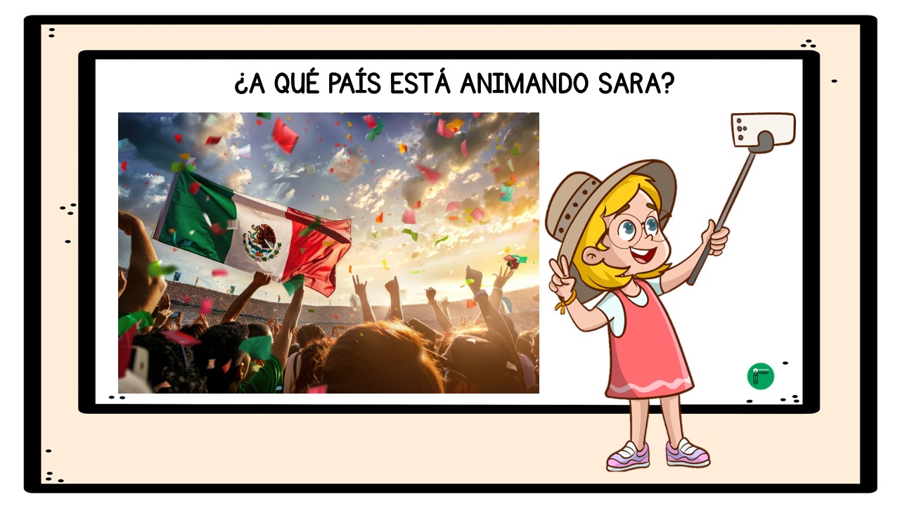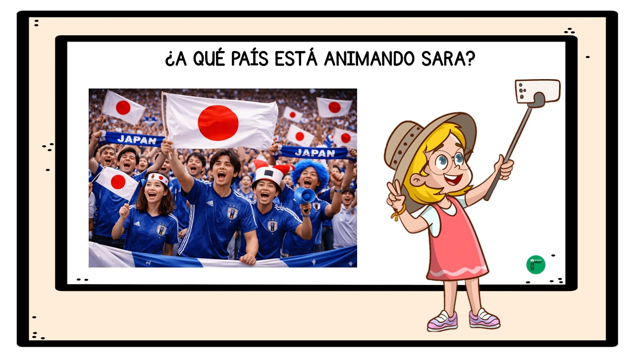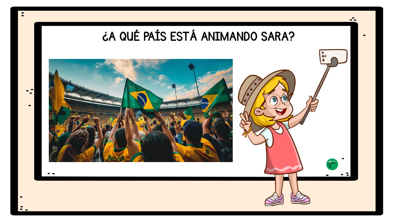 En esta nueva actividad, Sara nos envía una colección de sus famosos selfies. En cada foto, aparece rodeada de una afición diferente, contagiada por su alegría y sus cánticos. El reto para vuestros alumnos es convertirse en detectives geográficos: deberán observar detenidamente cada imagen para identificar a qué país y a qué afición está animando Sara en cada momento. Es una propuesta dinámica que aprovecha un evento de relevancia mundial para despertar la curiosidad por las diferentes culturas que participan en el torneo.