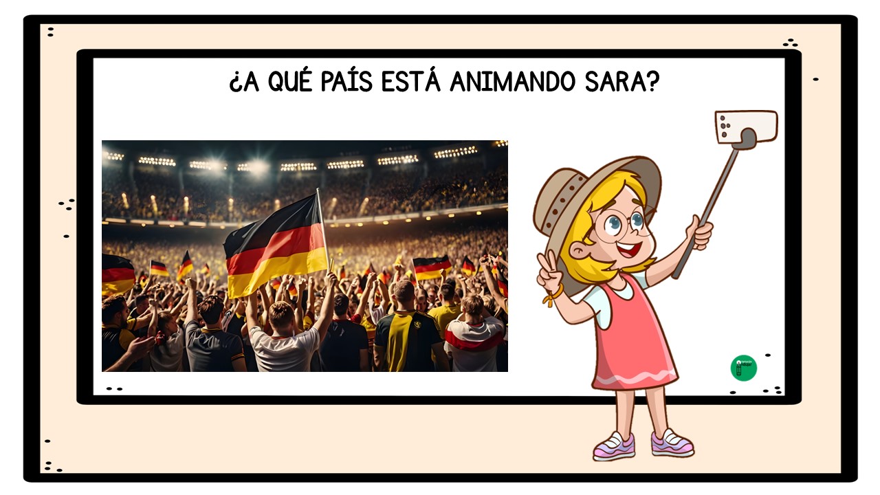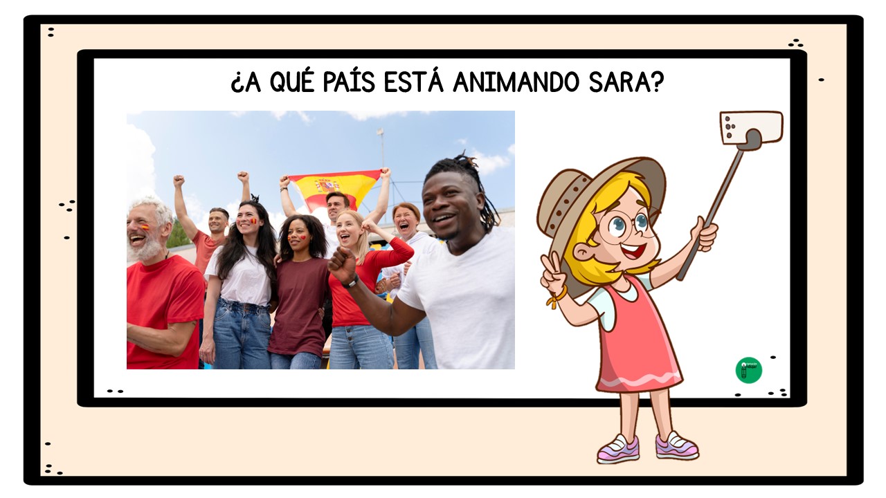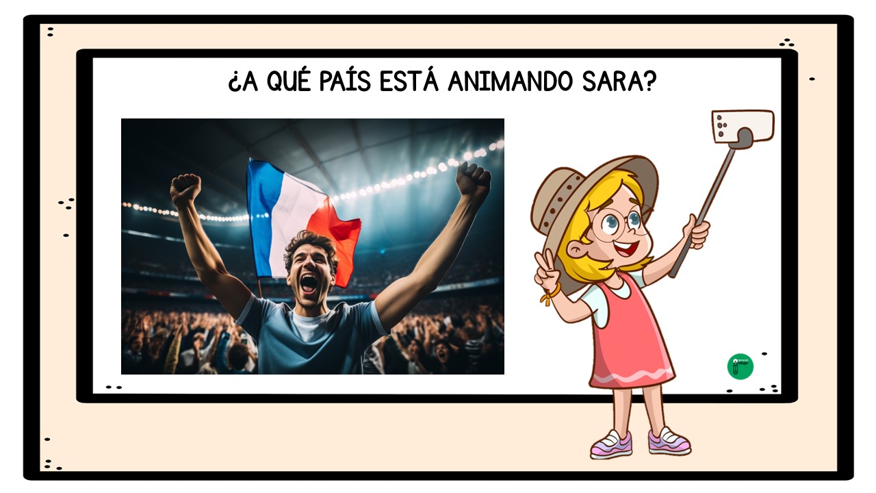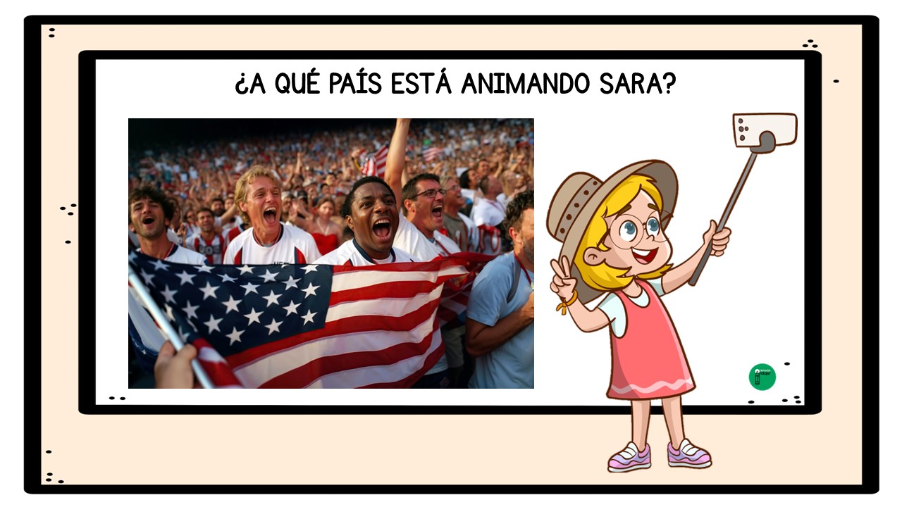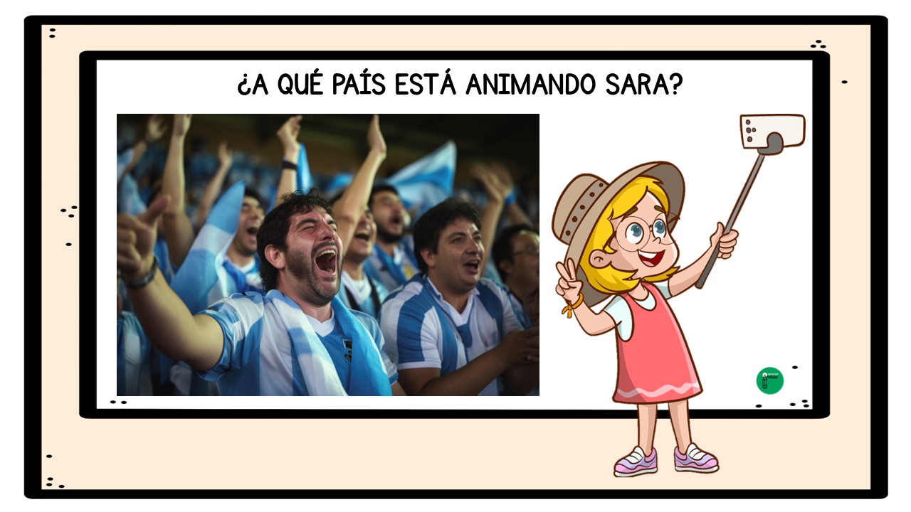 Este recurso es mucho más que un juego de observación; es una herramienta completa de comprensión a través de inferencias. El alumno no recibe el nombre del país directamente, sino que debe «leer» las pistas visuales presentes en el selfie. El trabajo con las banderas es el eje central, lo que nos permite reforzar la geografía de una manera orgánica y divertida. Los niños aprenderán a asociar colores, patrones y símbolos con sus respectivas naciones mientras analizan la vestimenta, las pinturas faciales y los accesorios de los aficionados que acompañan a Sara.