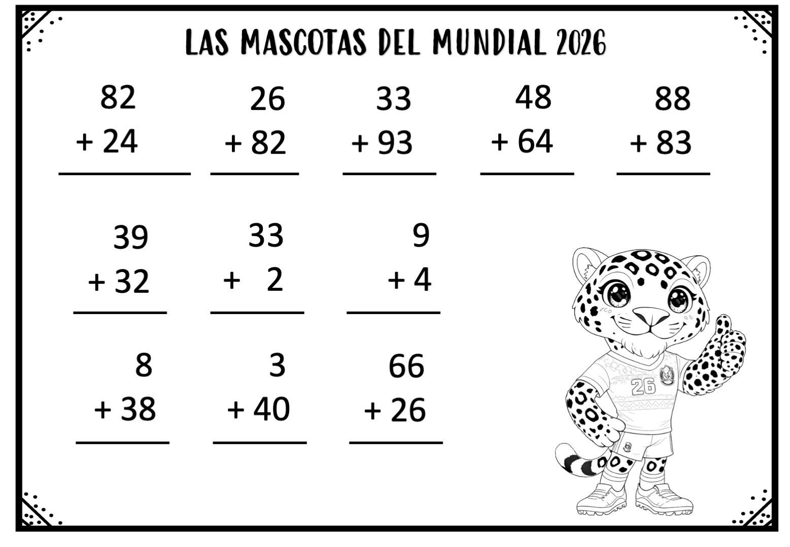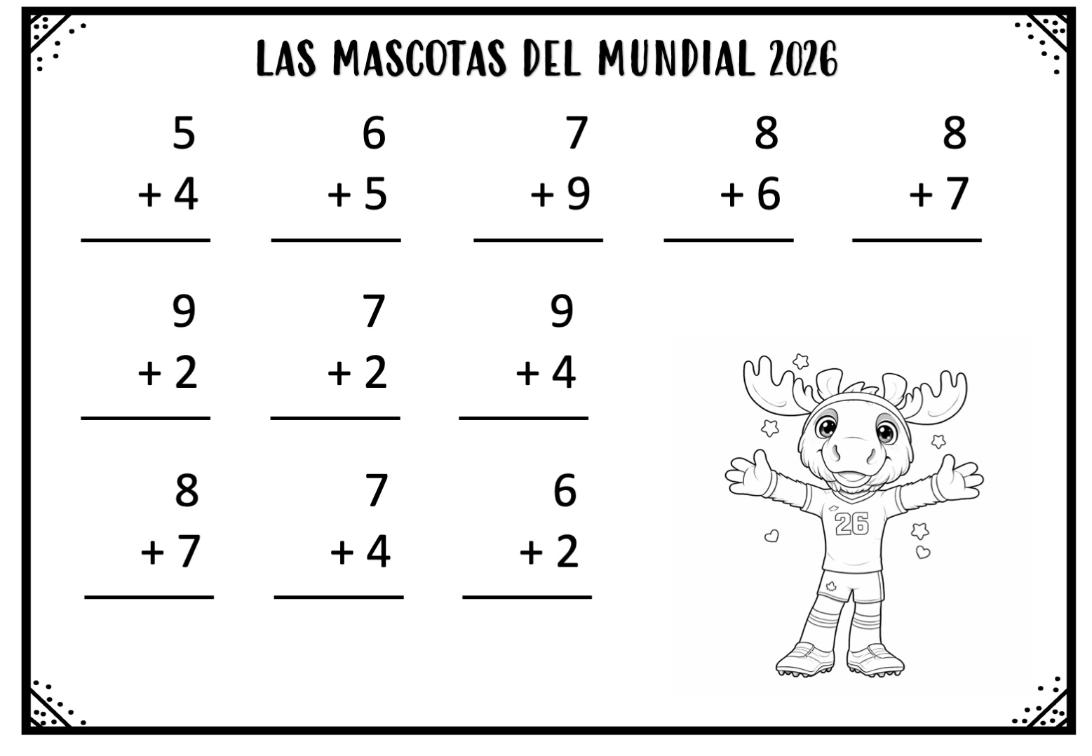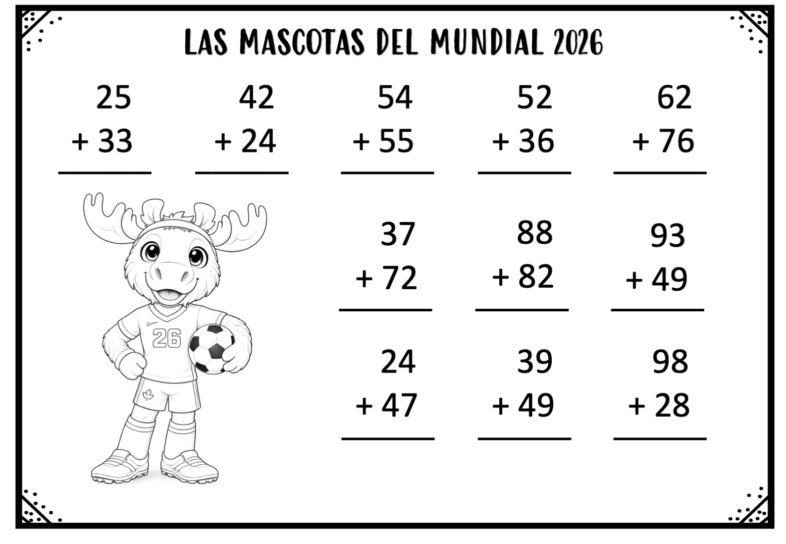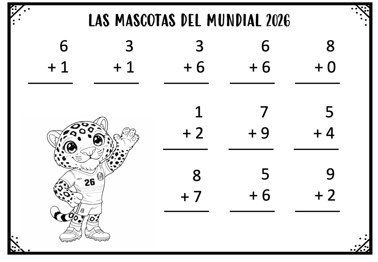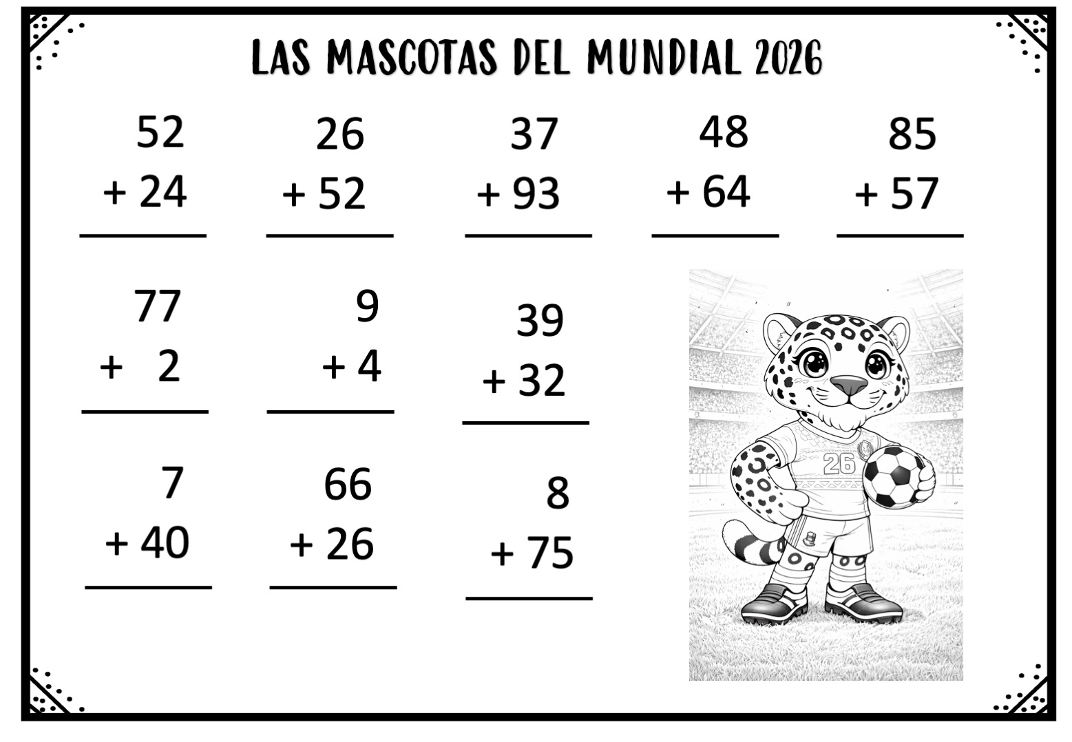 ¡El Mundial 2026 llega también a las matemáticas! Este cuaderno de sumas con las mascotas del Mundial es un recurso perfecto para trabajar cálculo mental, sumas de una y dos cifras y atención visual… todo acompañado de ilustraciones temáticas que encantan al alumnado.
