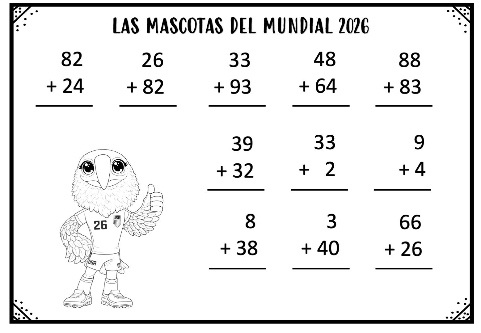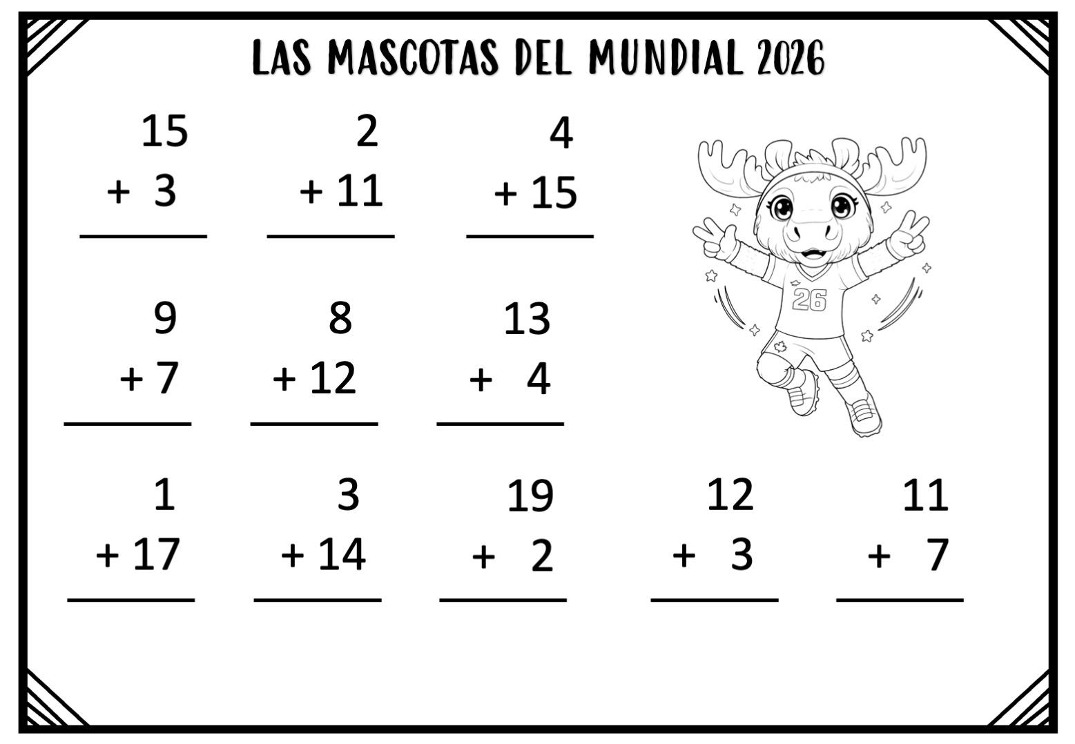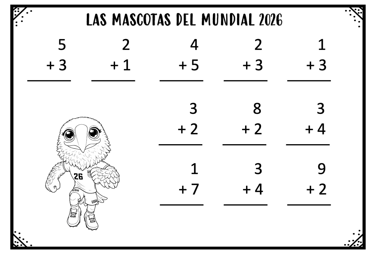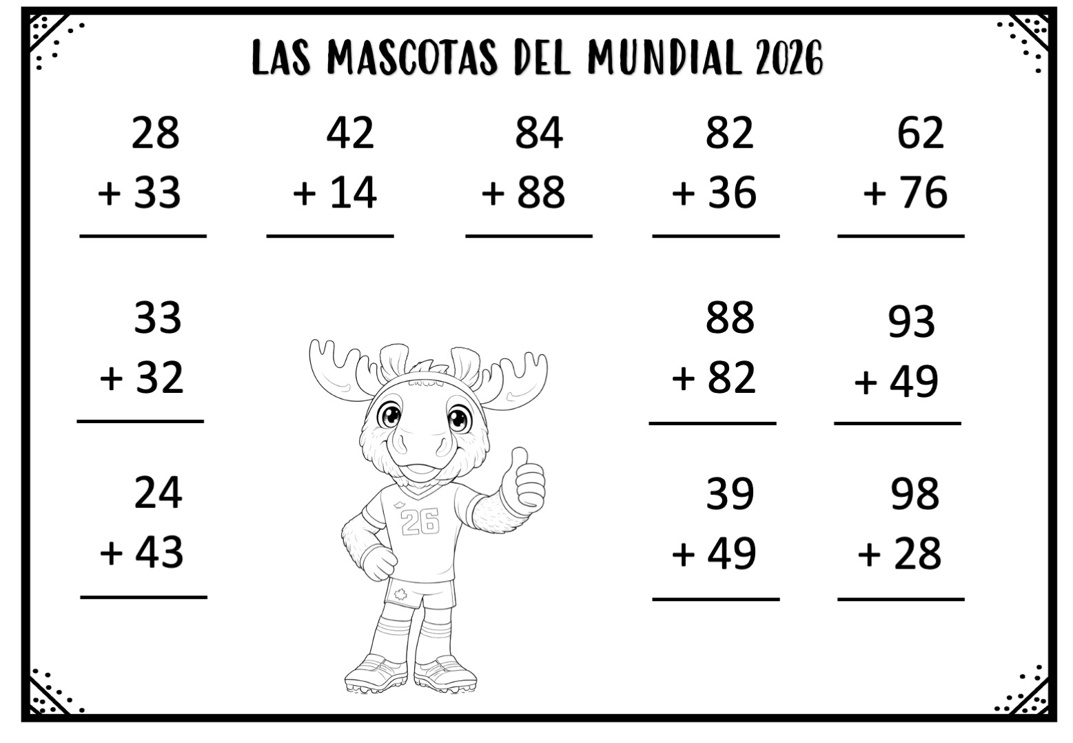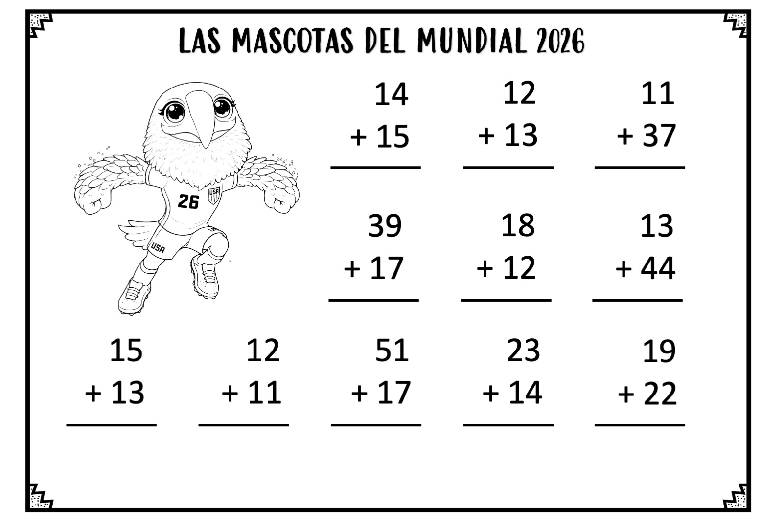 ¡El Mundial 2026 llega también a las matemáticas! Este cuaderno de sumas con las mascotas del Mundial es un recurso perfecto para trabajar cálculo mental, sumas de una y dos cifras y atención visual… todo acompañado de ilustraciones temáticas que encantan al alumnado.