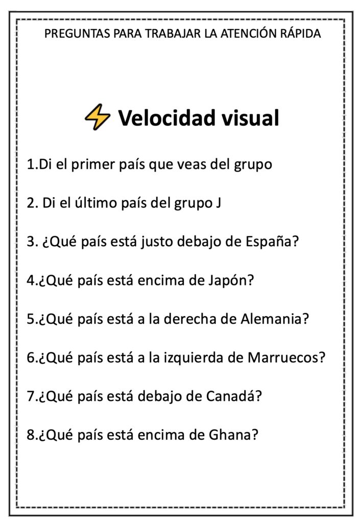 El Mundial 2026 es una oportunidad perfecta para introducir actividades motivadoras en el aula. Este recurso propone una serie de preguntas rápidas, diseñadas para trabajar atención, memoria visual, discriminación y velocidad de procesamiento… ¡todo a través de los grupos del Mundial!