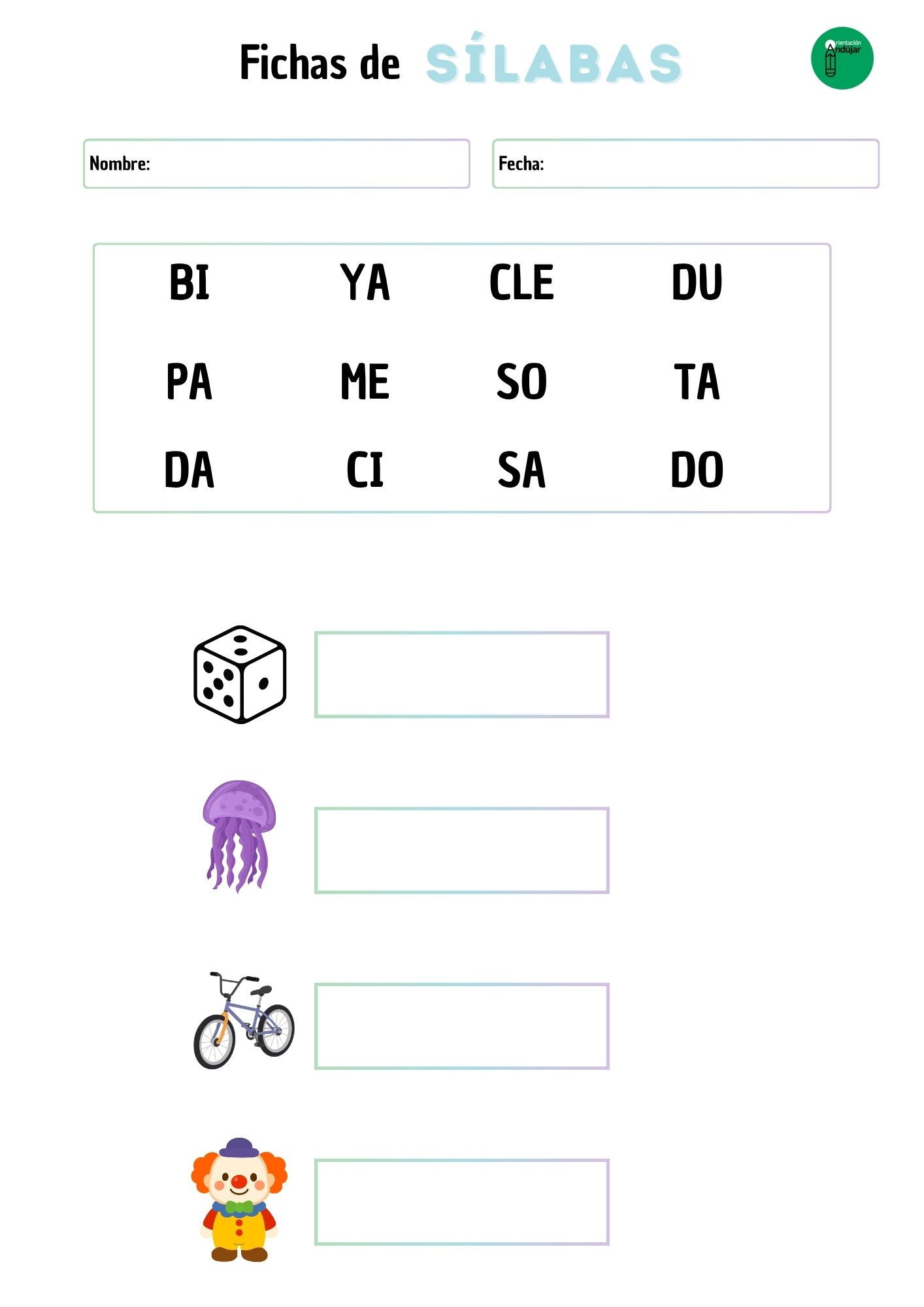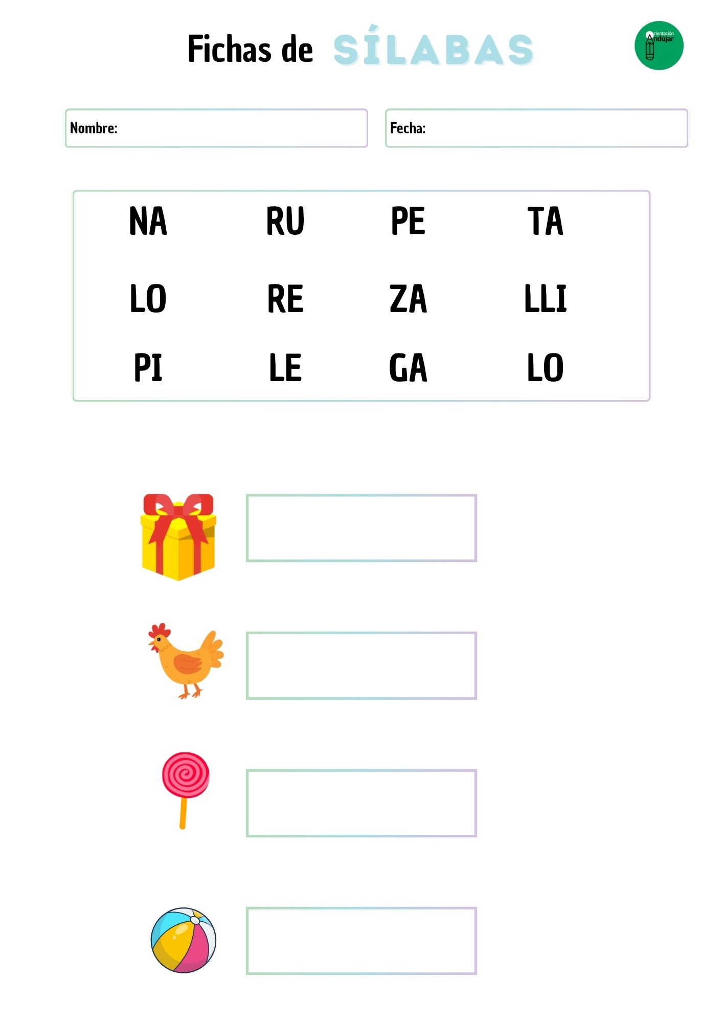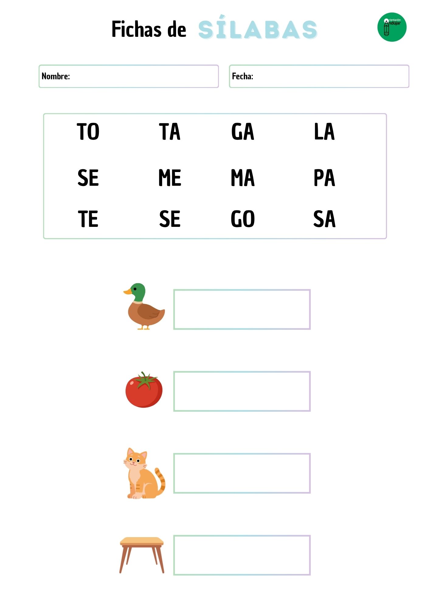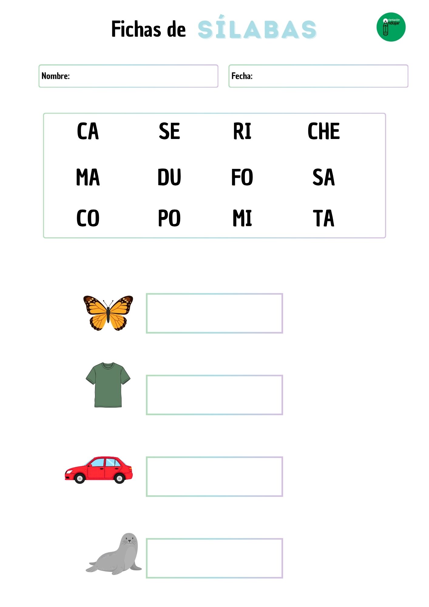 Cada ficha presenta un diseño intuitivo que invita a la exploración. En la franja superior, el alumno encontrará un «mar de sílabas» desordenadas. En la parte inferior, se presentan cuatro ilustraciones claras de objetos o animales que los niños conocen bien.